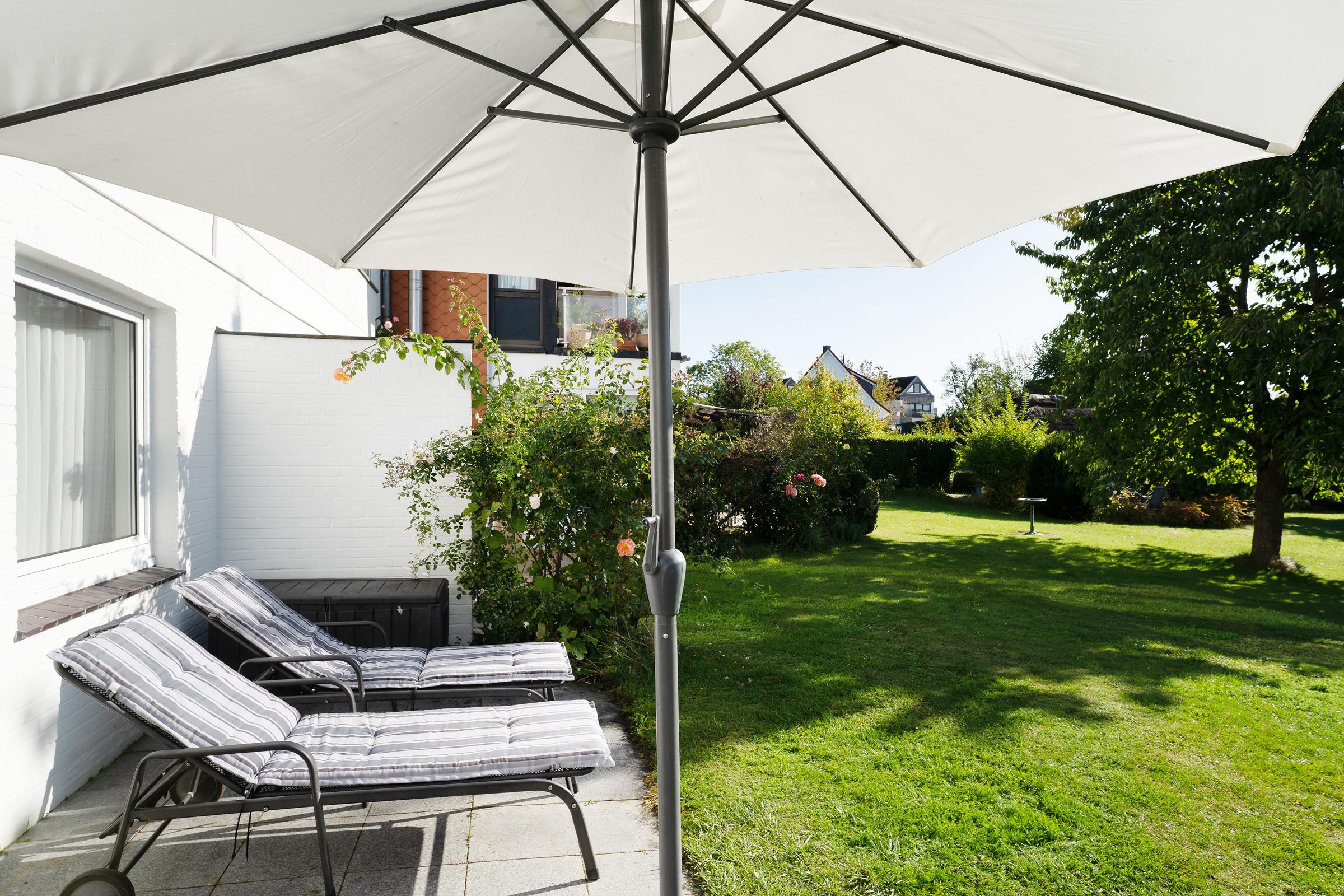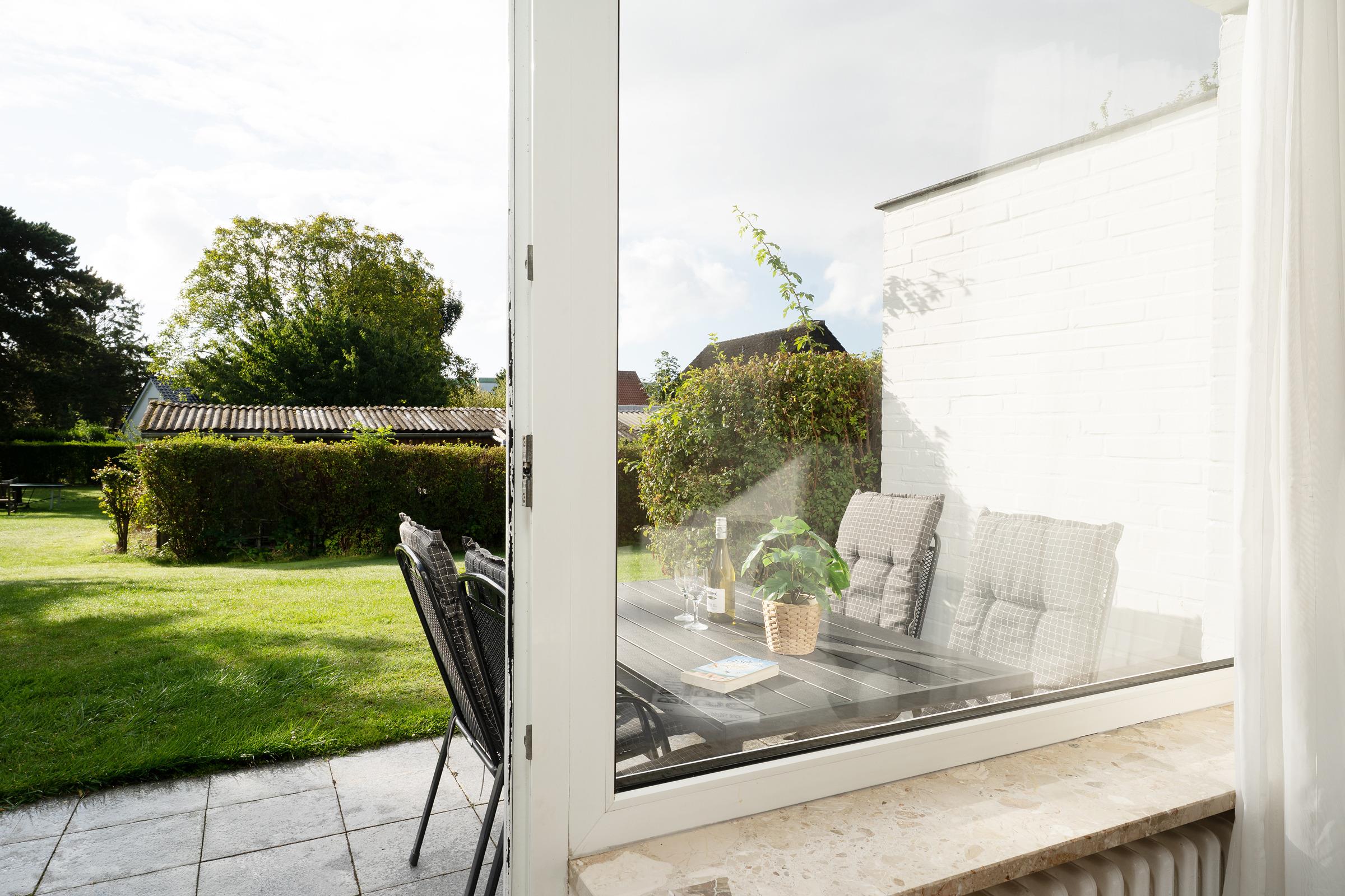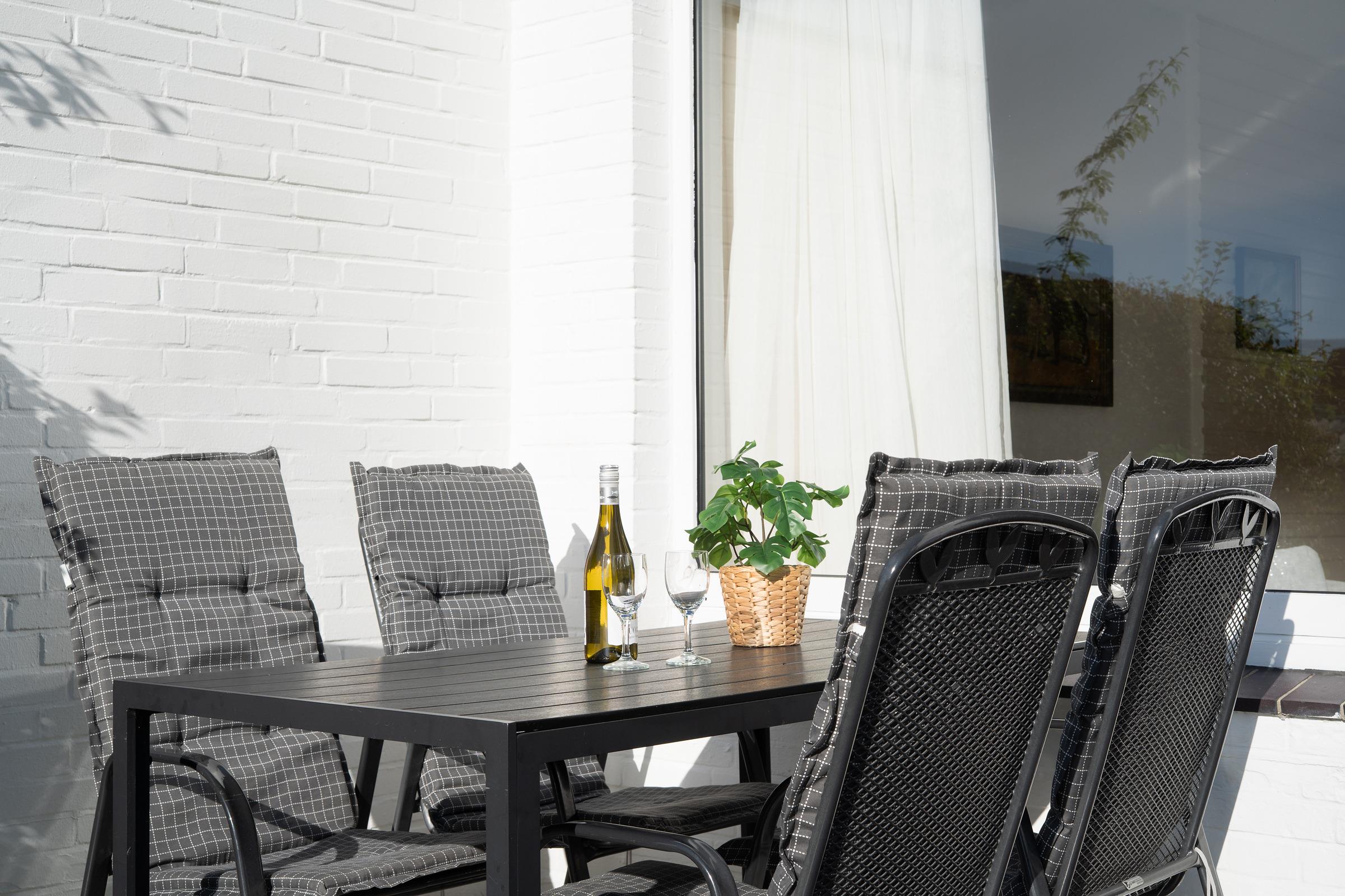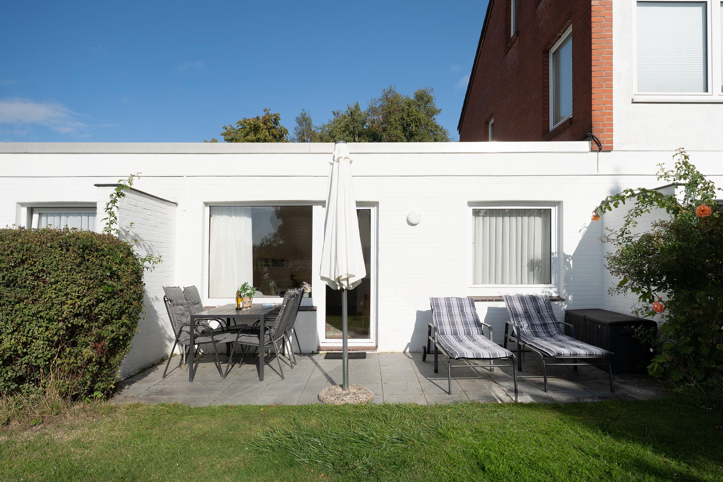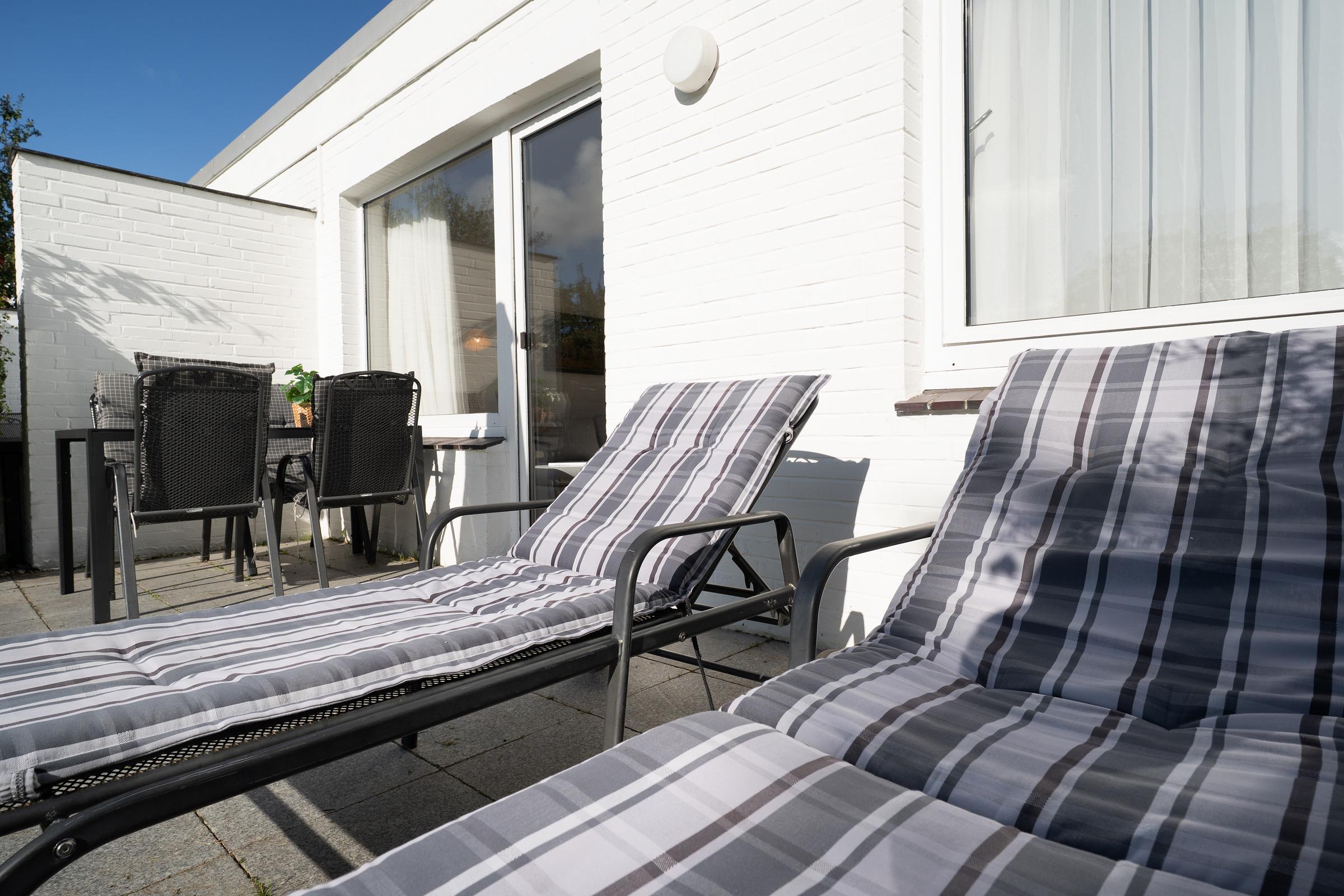 Der lichtdurchflutete Wohnbereich empfängt Sie mit einer gemütlichen Sitzecke, TV und Radio – ideal für entspannte Stunden nach einem Strandtag. Von hier aus gelangen Sie direkt auf die ca. 12 m² große Terrasse, die nach Süd-West ausgerichtet ist. Genießen Sie die Sonne bis in den Abend hinein und nutzen Sie den vorhandenen Holzkohlegrill für gesellige Stunden im Freien.