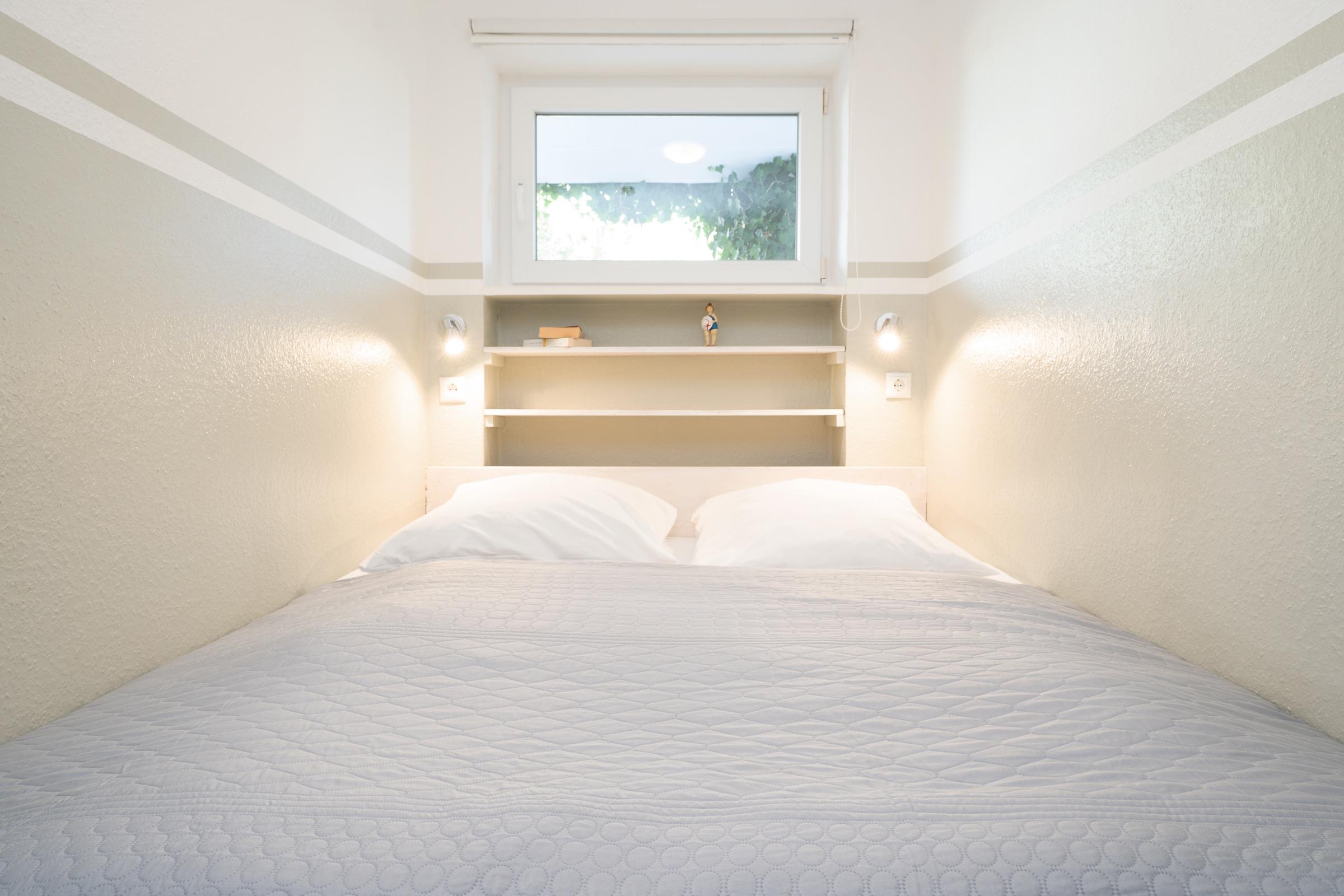 Schlafzimmer 1: 1 Doppelbett 2x 90 x 200 cm), Kleiderschrank, Fernseher, Verdunkelung: Vorhang, kein Platz für ein Babybett vorhanden