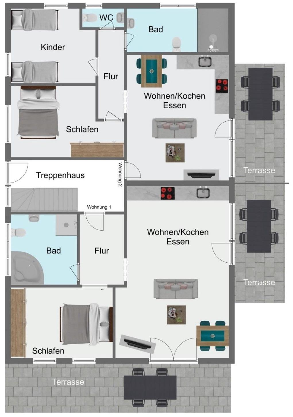 Bitte beachten Sie, dass eine der zwei Terrassen ohne Brüstung angelegt und somit Vorsicht geboten ist, da das Gelände hinter der Terrasse abschüssig ist.