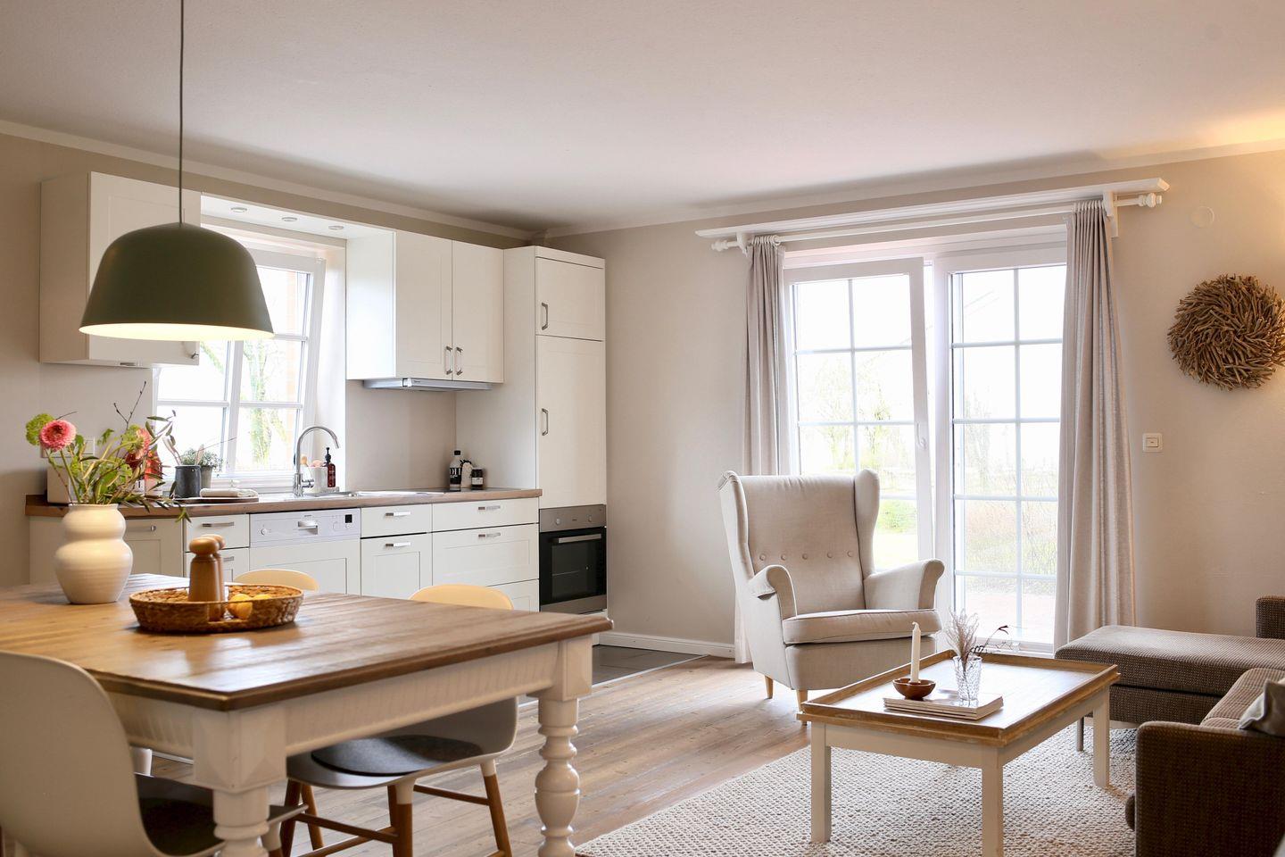Die 4-Sterne-Ferienwohnung "Föhr" bezaubert mit ihrem außergewöhnlichen Ambiente im hyggeligen Stil. Die Naturmaterialien aus Holz verbinden sich gekonnt mit den modernen Lichtelementen. Genießen Sie im einladenden Strandkorb auf der sonnigen West-Terrasse den Blick in Richtung Nordsee-Deich und die Weite der Köge, um vom Alltag abzuschalten. Die großzügige Bauweise und die geschmackvolle Einrichtung verleihen dieser gemütlichen Wohnung ihren exzellenten Charme. Hier harmonieren moderner Komfort und Urlaub auf dem Bauernhof!