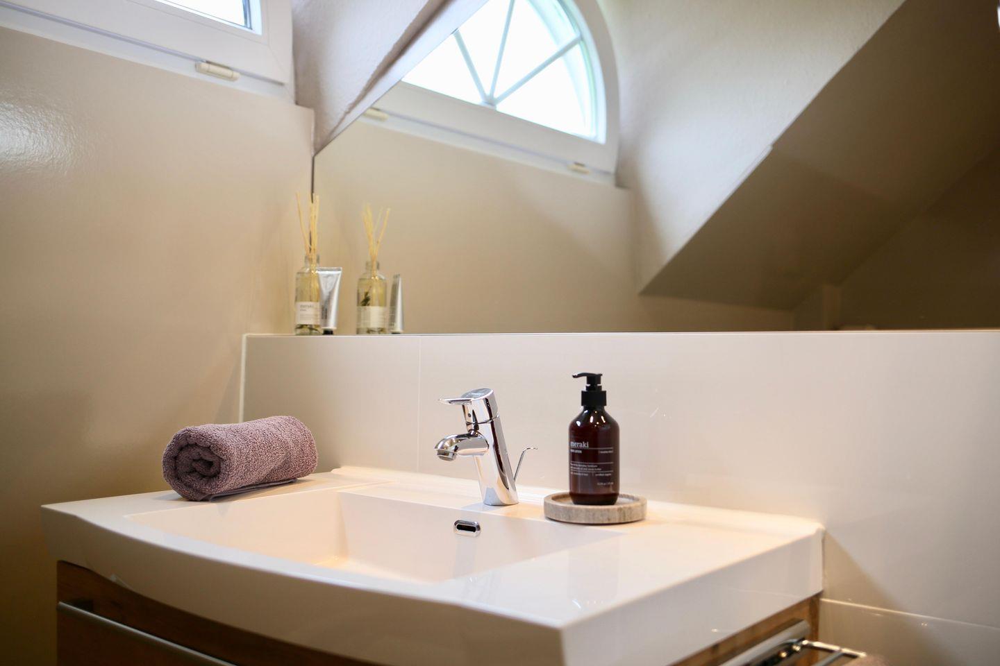 ° Badezimmer mit Dusche, Waschtisch, Föhn und Kosmetikspiegel