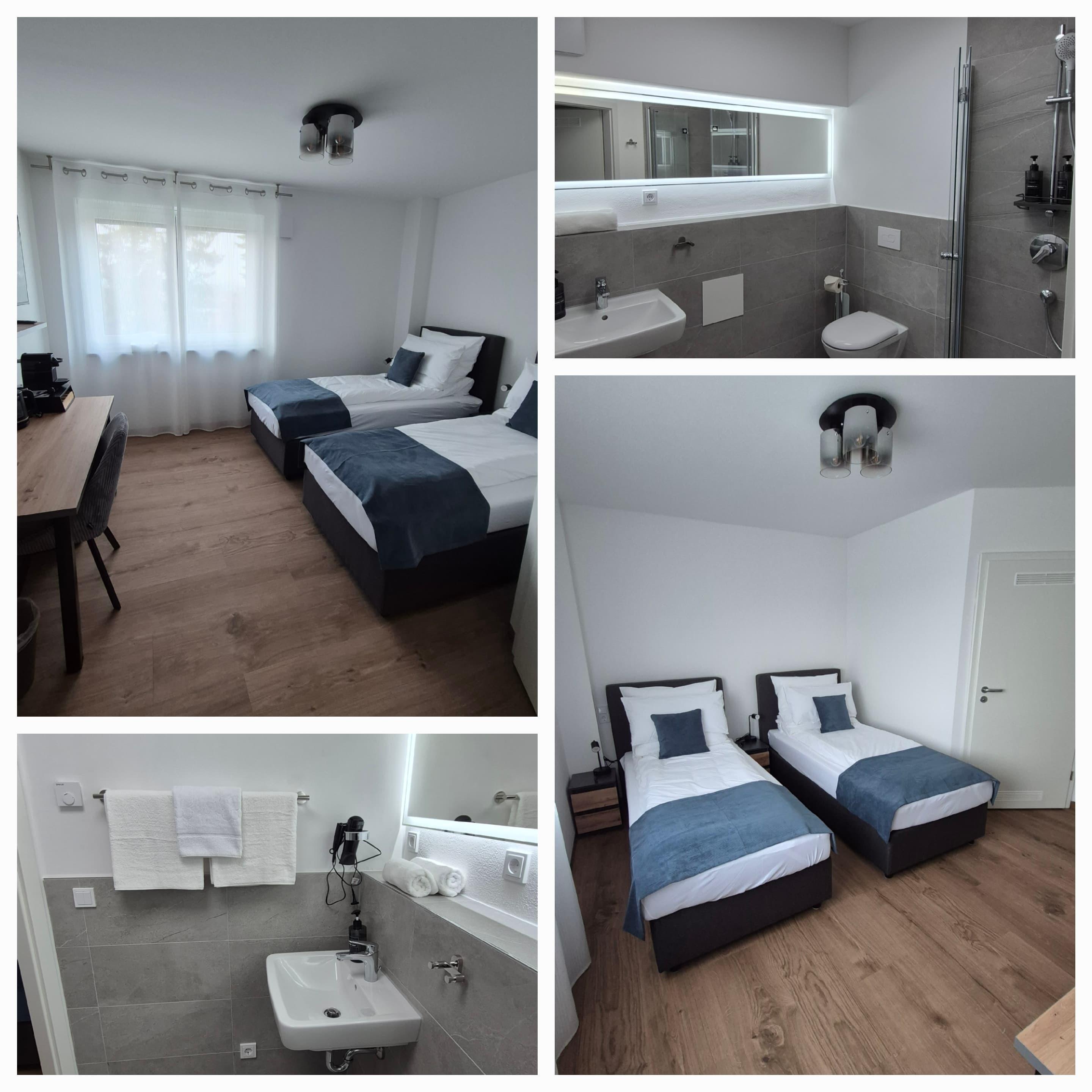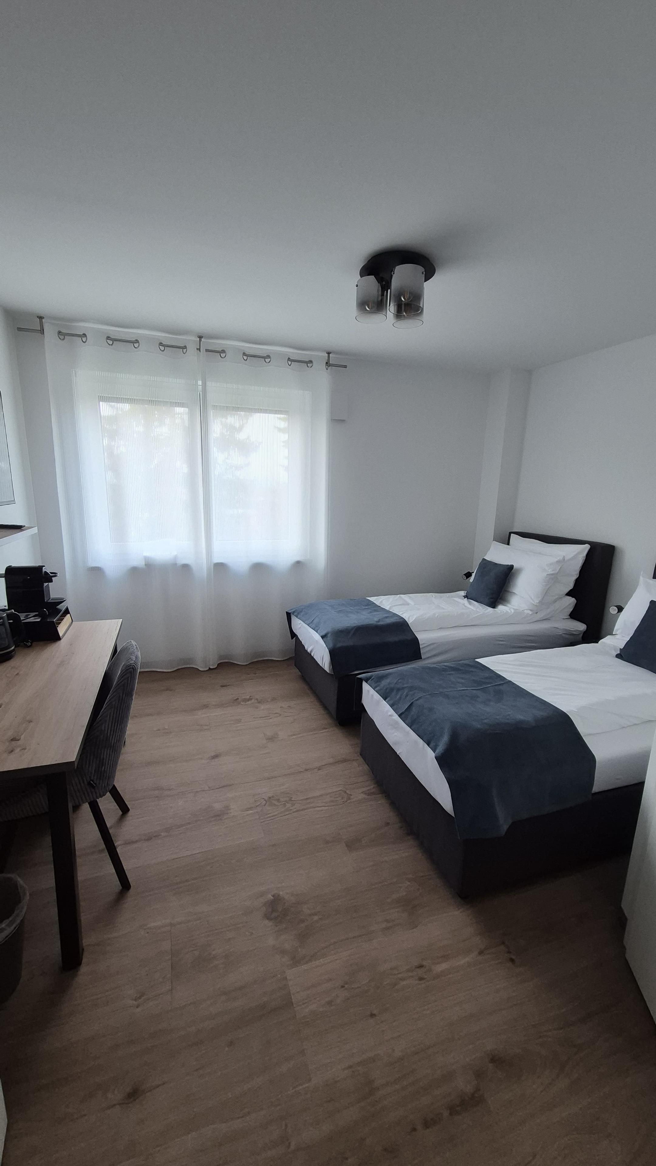 Der Raum ist geschmackvoll gestaltet und mit einem Doppelbett ausgestattet, das bei Bedarf in zwei Einzelbetten getrennt werden kann. Große Fenster lassen viel Tageslicht herein, wodurch eine helle, freundliche Atmosphäre entsteht. Für Privatsphäre und Sonnenschutz sind die Fenster zudem mit Rollläden ausgestattet. Das gesamte Zimmer, einschließlich des Badezimmers, ist mit einer Fußbodenheizung ausgestattet, die überall für zusätzlichen Komfort sorgt.