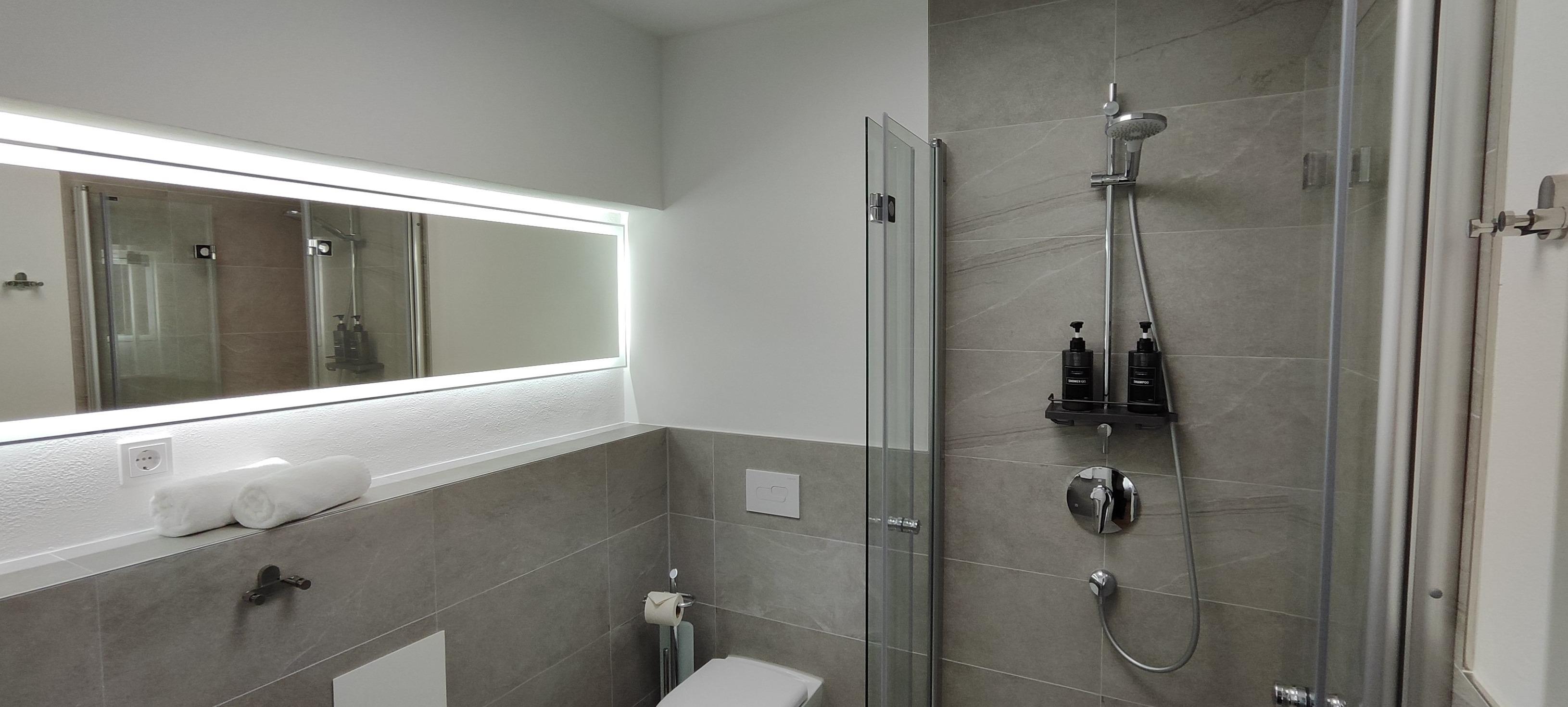 Das moderne Badezimmer bietet eine funktionale Ausstattung mit einer Dusche, einem Waschbecken, einer Toilette und einem Fenster, das auch hier für angenehmes Tageslicht sorgt. Hochwertige sanitäre Anlagen, frische Handtücher und ein Haartrockner stehen bereit, sodass die Gäste bestens versorgt sind.