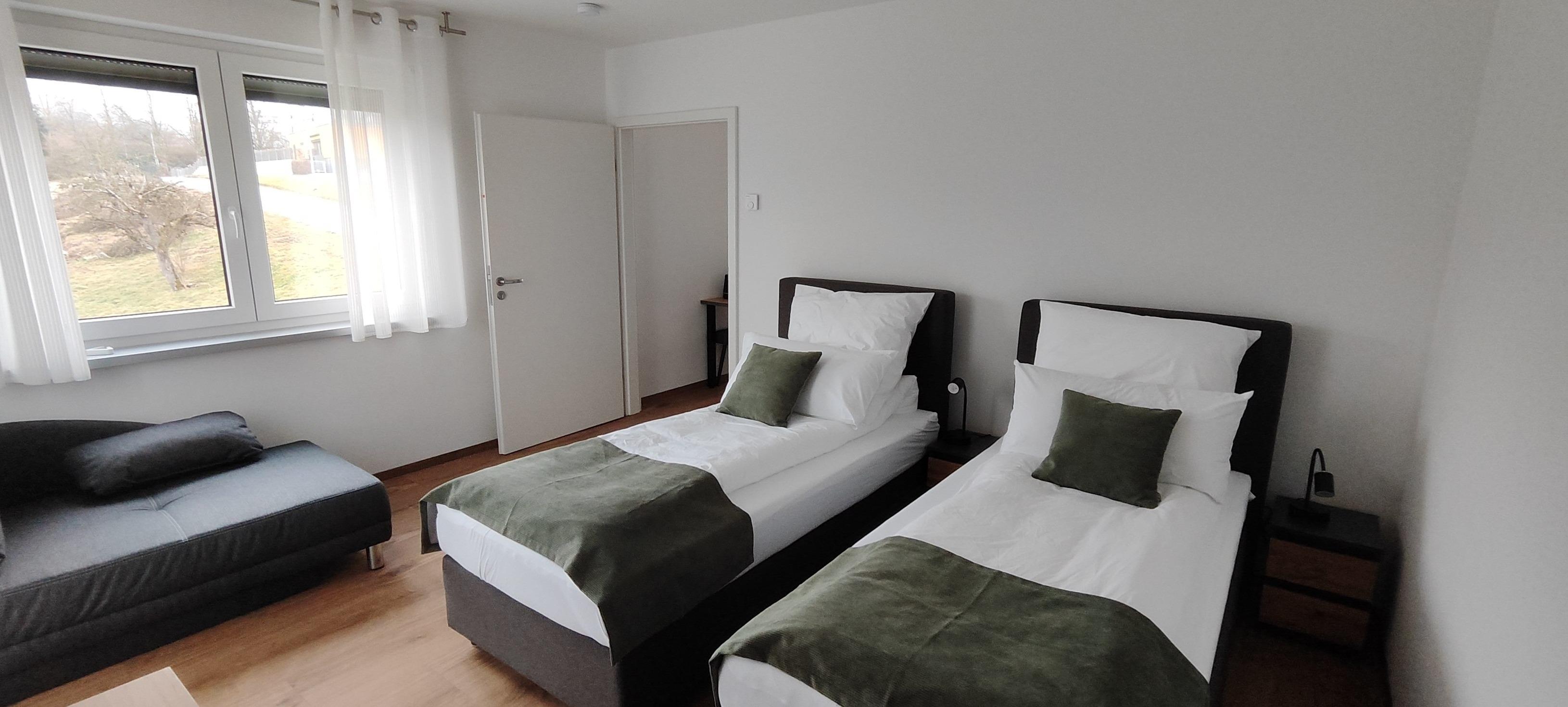 ?Das Apartment verfügt über ein eigenes Schlafzimmer mit einem gemütlichen Bett sowie ein modernes Badezimmer mit Dusche und WC. Handtücher und Bettwäsche sind bereits bereitgestellt, sodass Sie sich direkt wohlfühlen können.