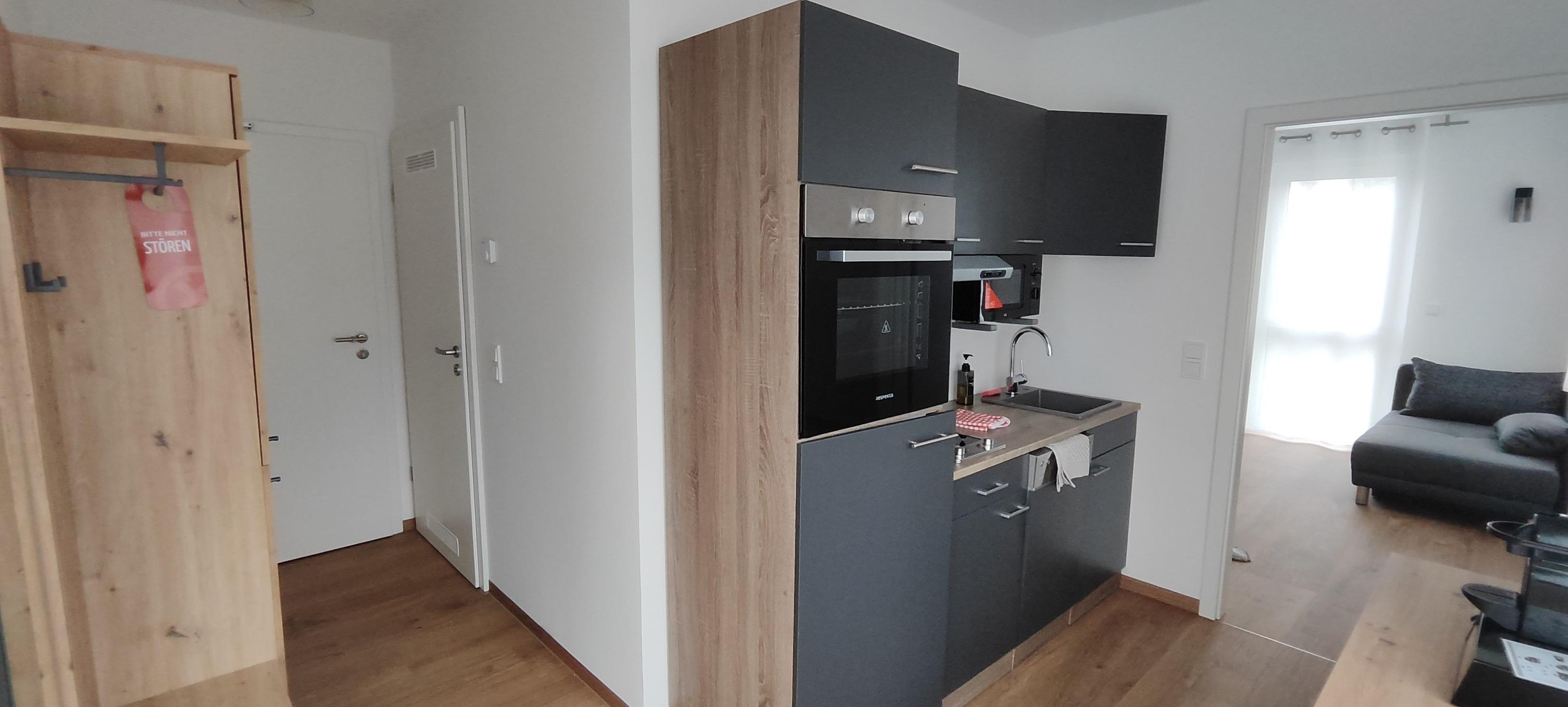 Die Küche ist komplett ausgestattet: Ein Kühlschrank, eine Mikrowelle, zwei Herdplatten sowie Töpfe, Pfannen, Teller und Besteck bieten Ihnen alle Möglichkeiten, auch im Apartment bequem Mahlzeiten zuzubereiten. Eine Spüle und eine Kaffeemaschine stehen ebenfalls zur Verfügung.