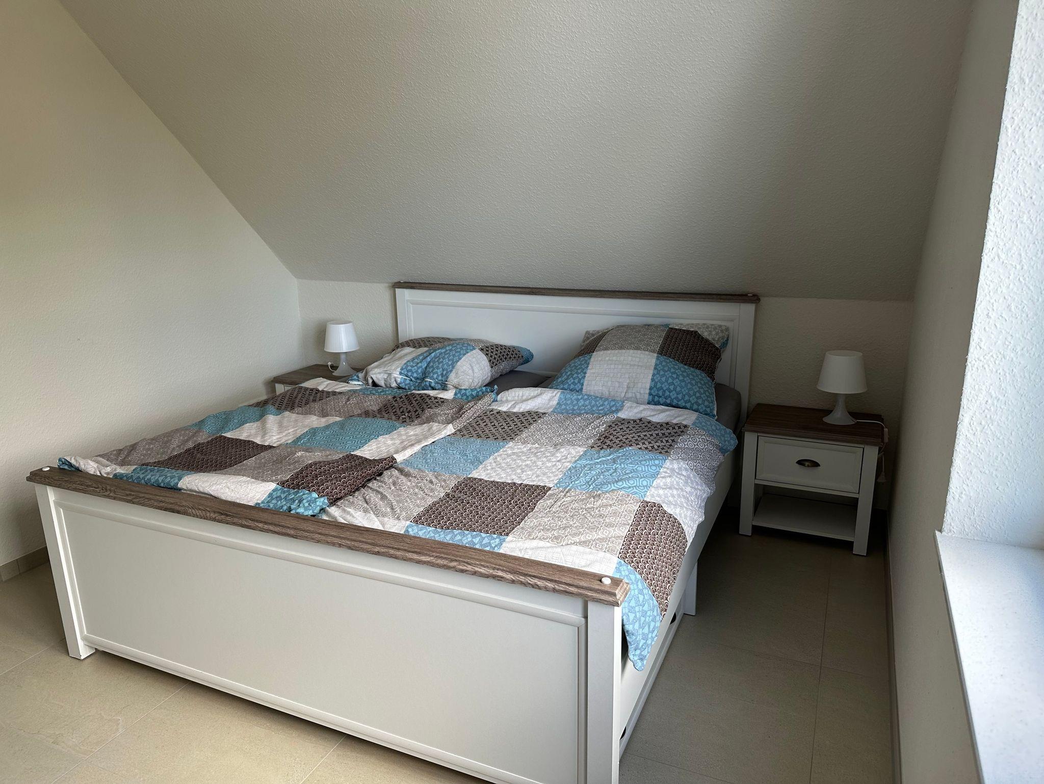 In unserem neu erbauten Ferienhaus mit zwei Wohneinheiten können Sie als 5-köpfige Familie in der Wohneinheit im Obergeschoß Ihren Urlaub verbringen. Es stehen Ihnen zwei Doppelzimmer (Doppelbetten je 1,80m x 2,00m/2 Matratzen), eine Wohnküche mit einer Schlafcouch (1,00 x 1,85m) und einem Bad mit Badewanne und einer ebenerdigen Dusche zur Verfügung.