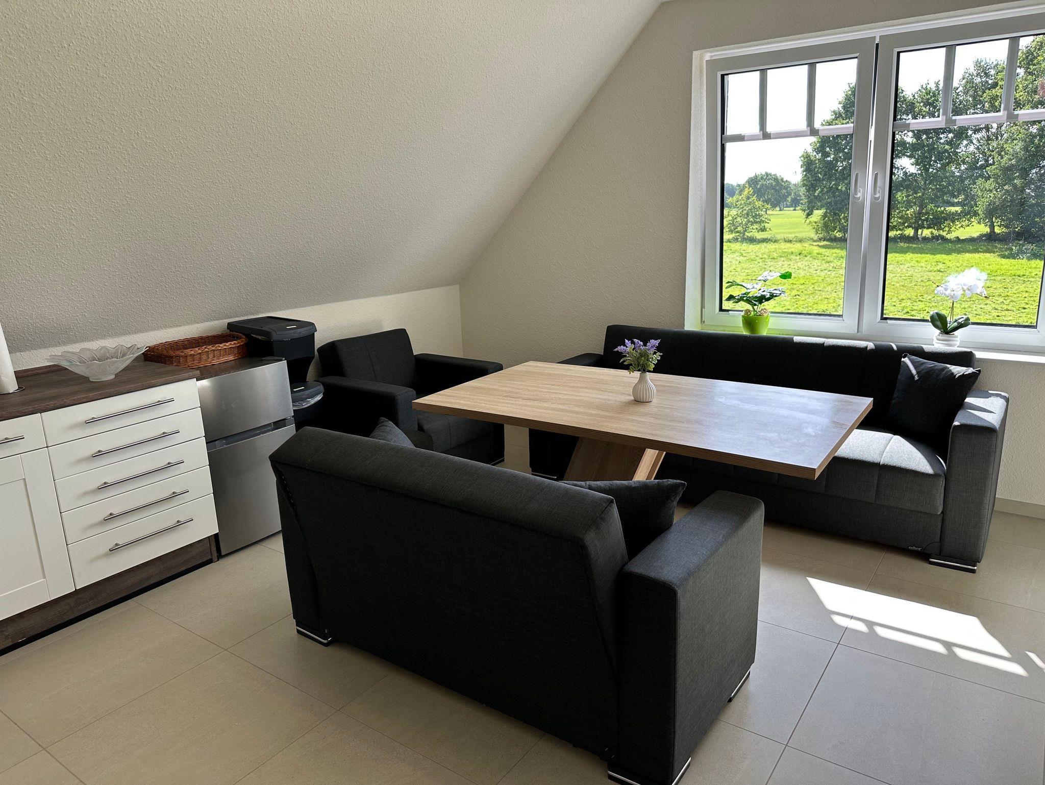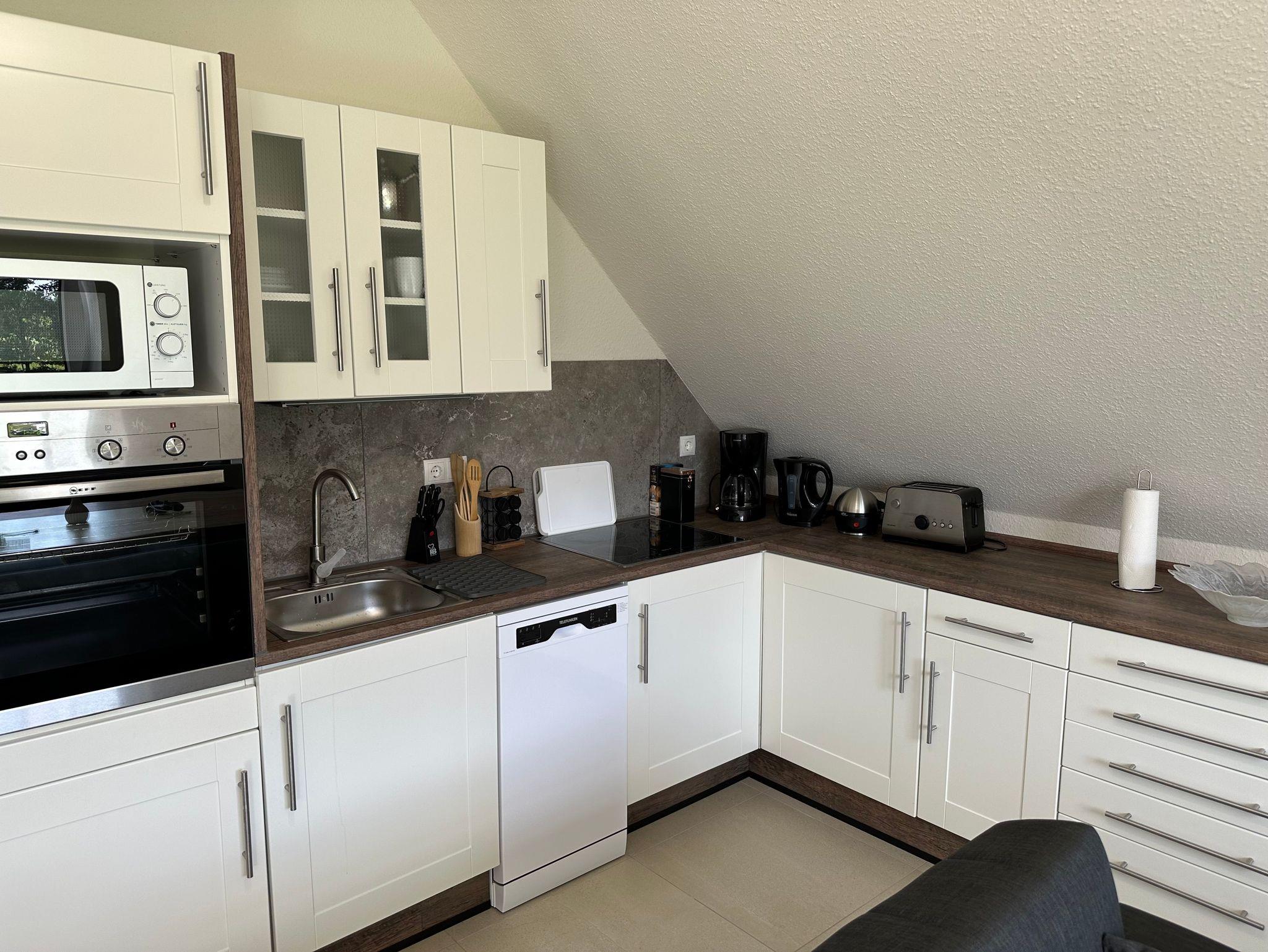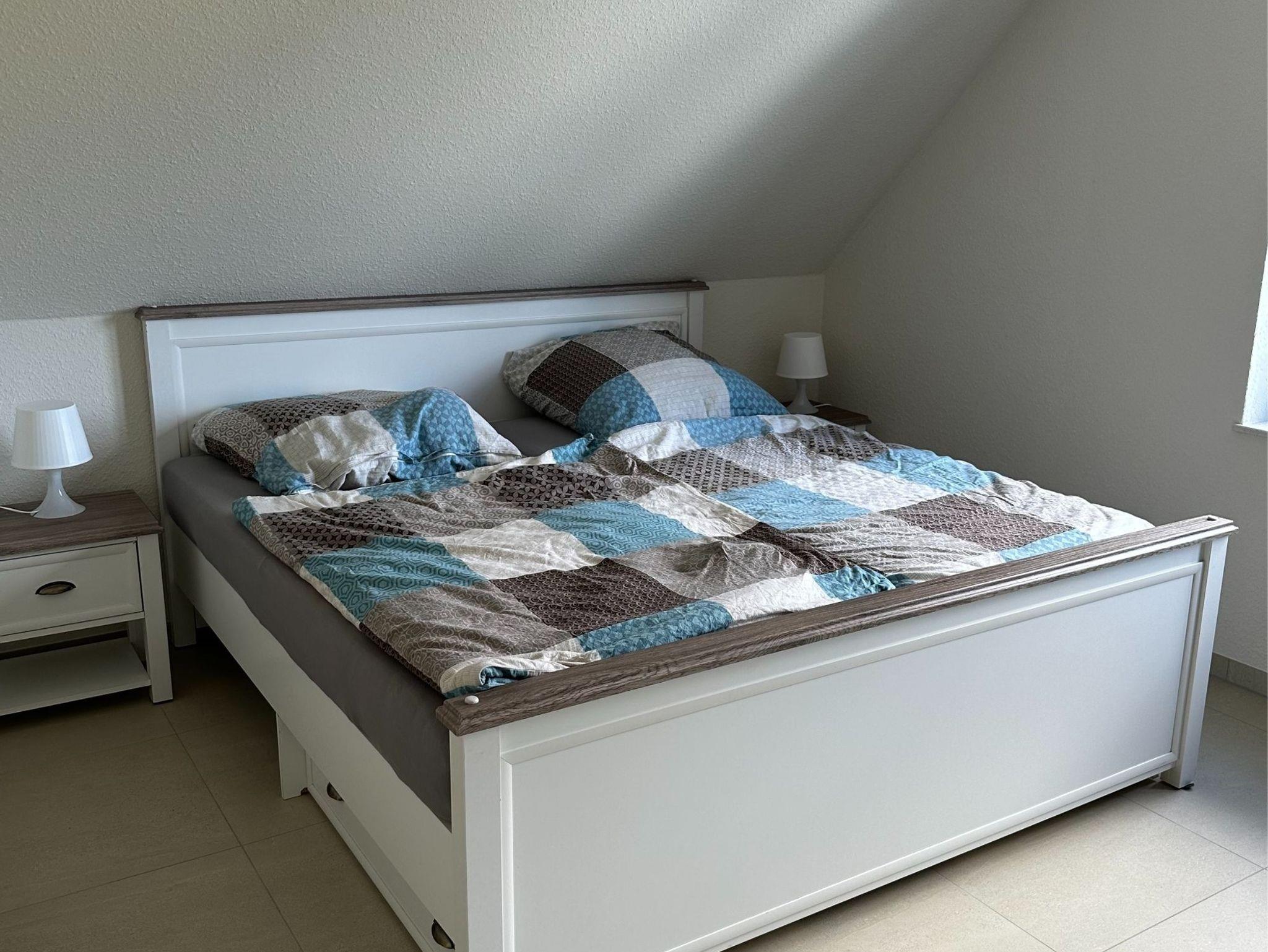 Hinweis zur Erdgeschoßwohnung: Die Erdgeschoßwohnung ist ausgestattet mit einer großen Küche mit Sitzgelegenheiten bis zu 10 Personen. Einem Wohnschlafraum mit einer Schlafcouch (1,00m x 2,30m), ein Schlafzimmer (Doppelbett 1,80m x 2,00m/1 Matratze) und einem Bad mit einer Badewanne und einer ebenerdigen Dusche.