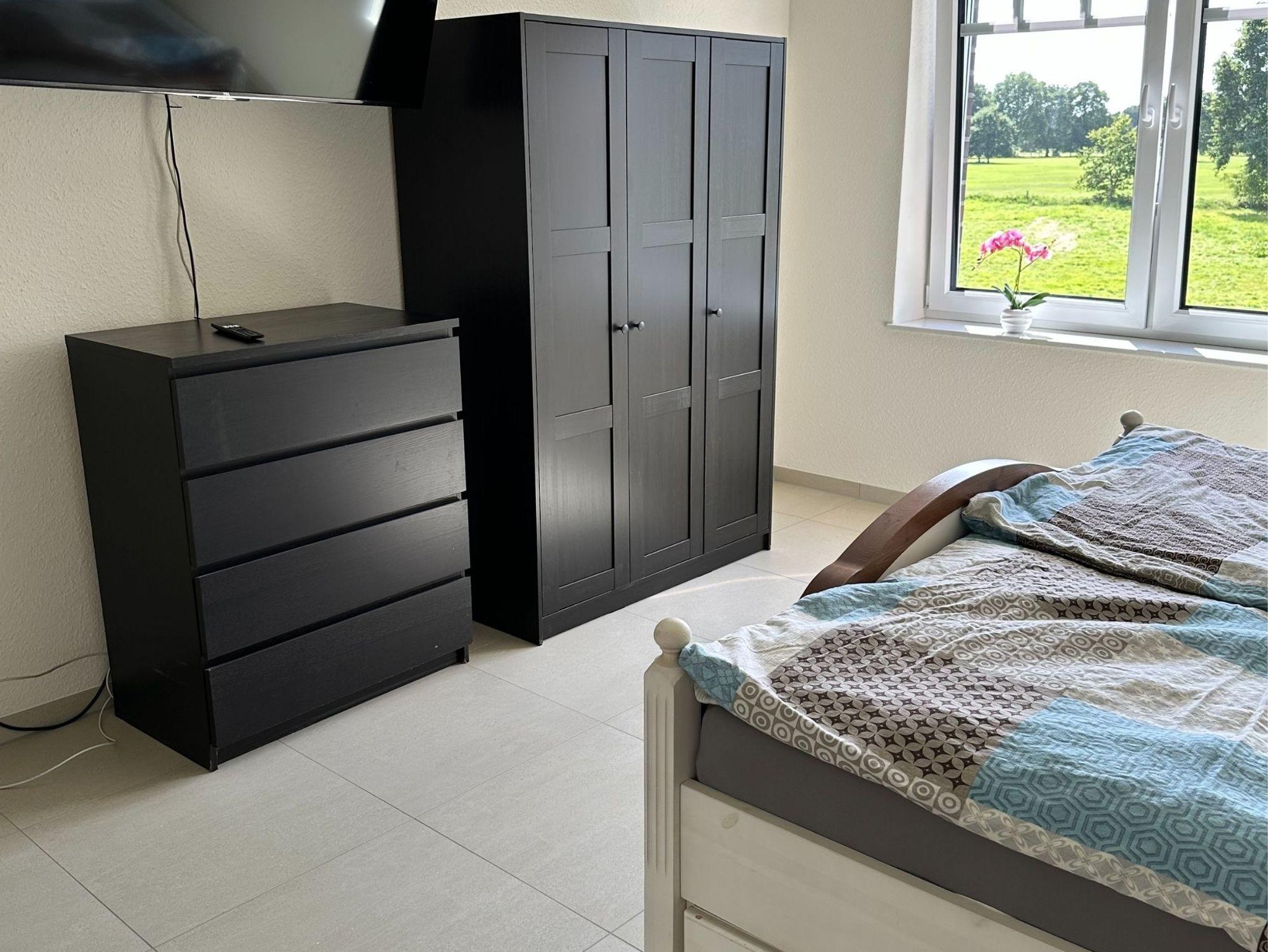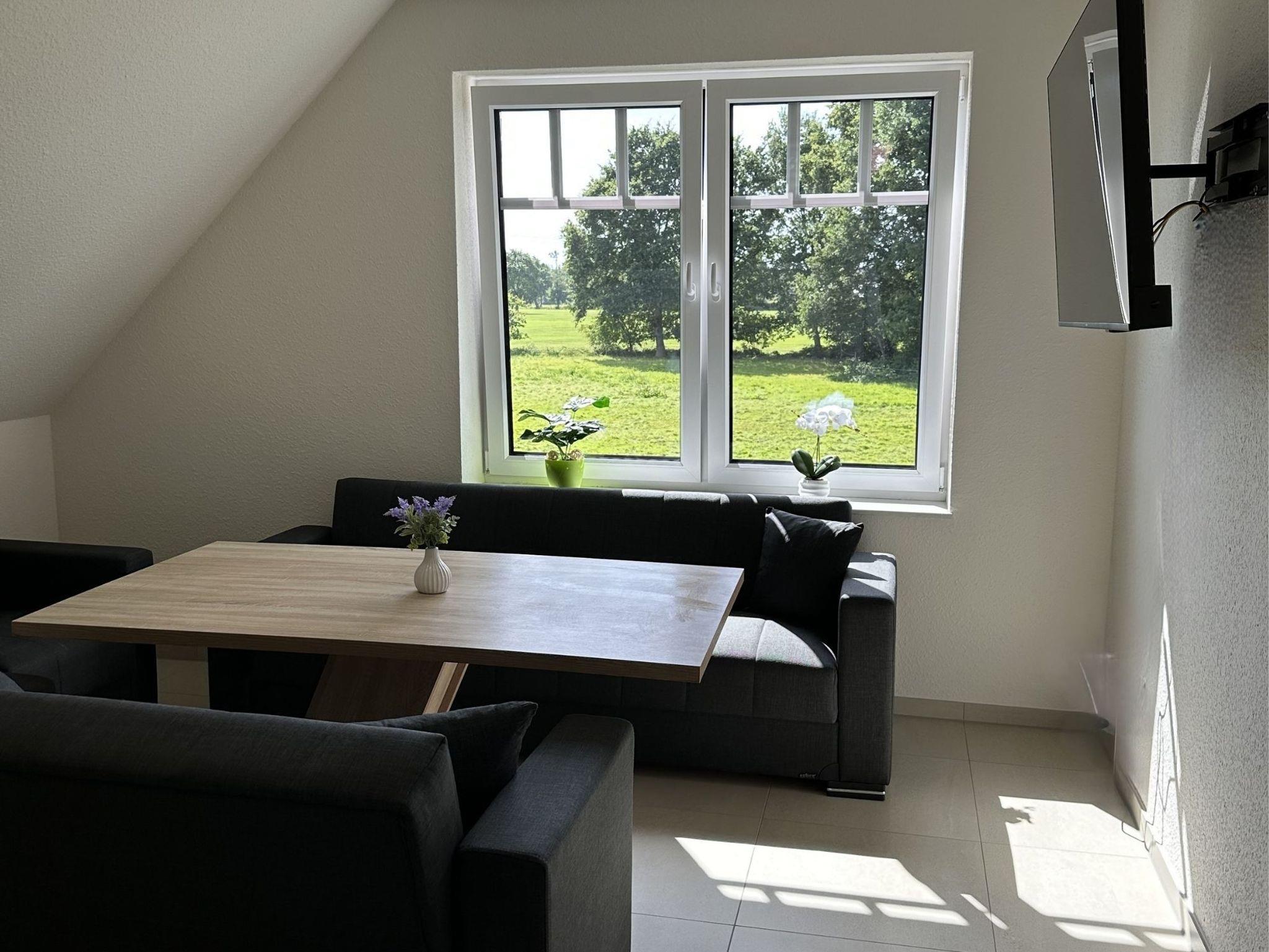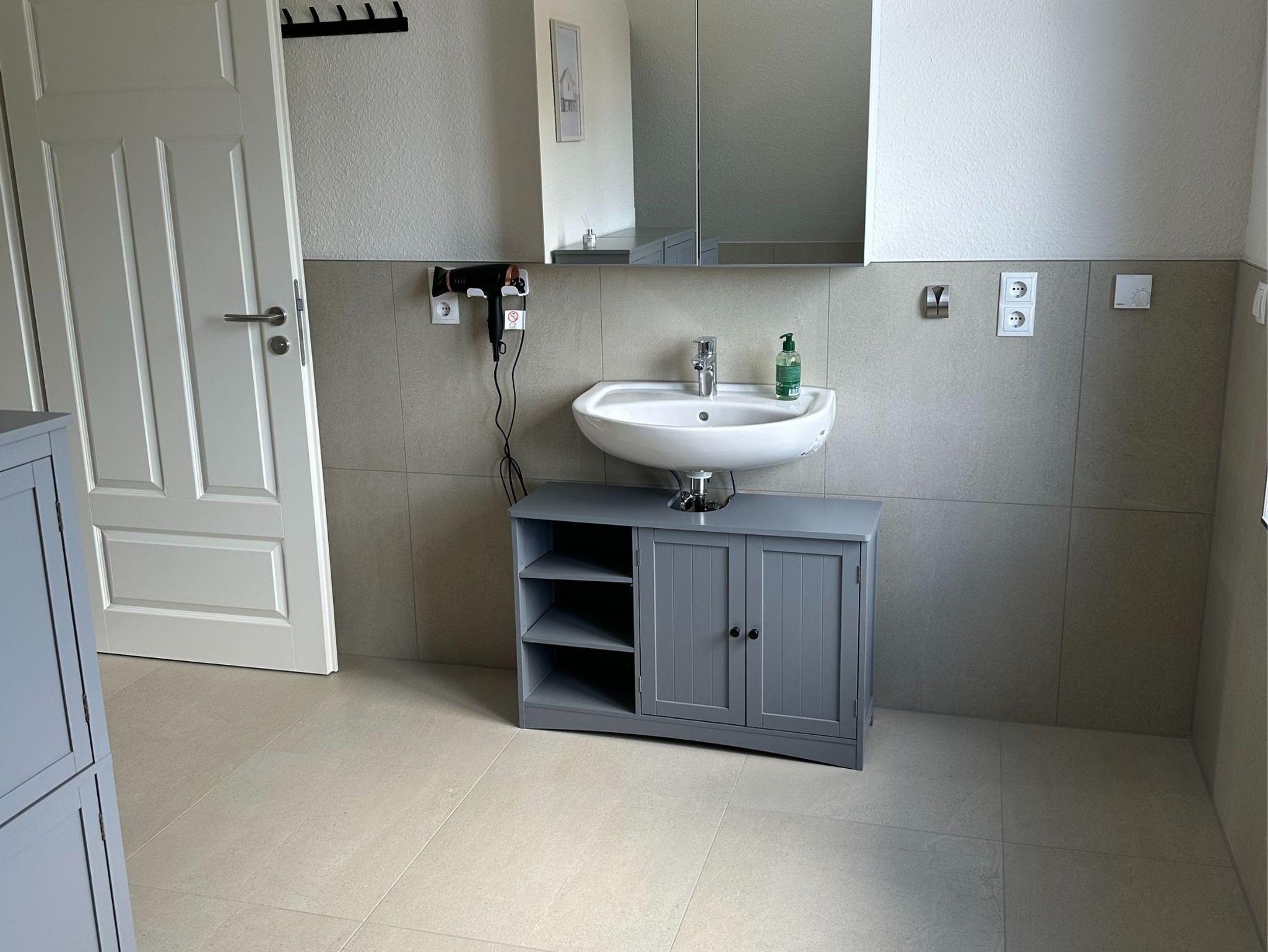 Hinweis zur Erdgeschoßwohnung: Die Erdgeschoßwohnung ist ausgestattet mit einer großen Küche mit Sitzgelegenheiten bis zu 10 Personen. Einem Wohnschlafraum mit einer Schlafcouch (1,00m x 2,30m), ein Schlafzimmer (Doppelbett 1,80m x 2,00m/1 Matratze) und einem Bad mit einer Badewanne und einer ebenerdigen Dusche.