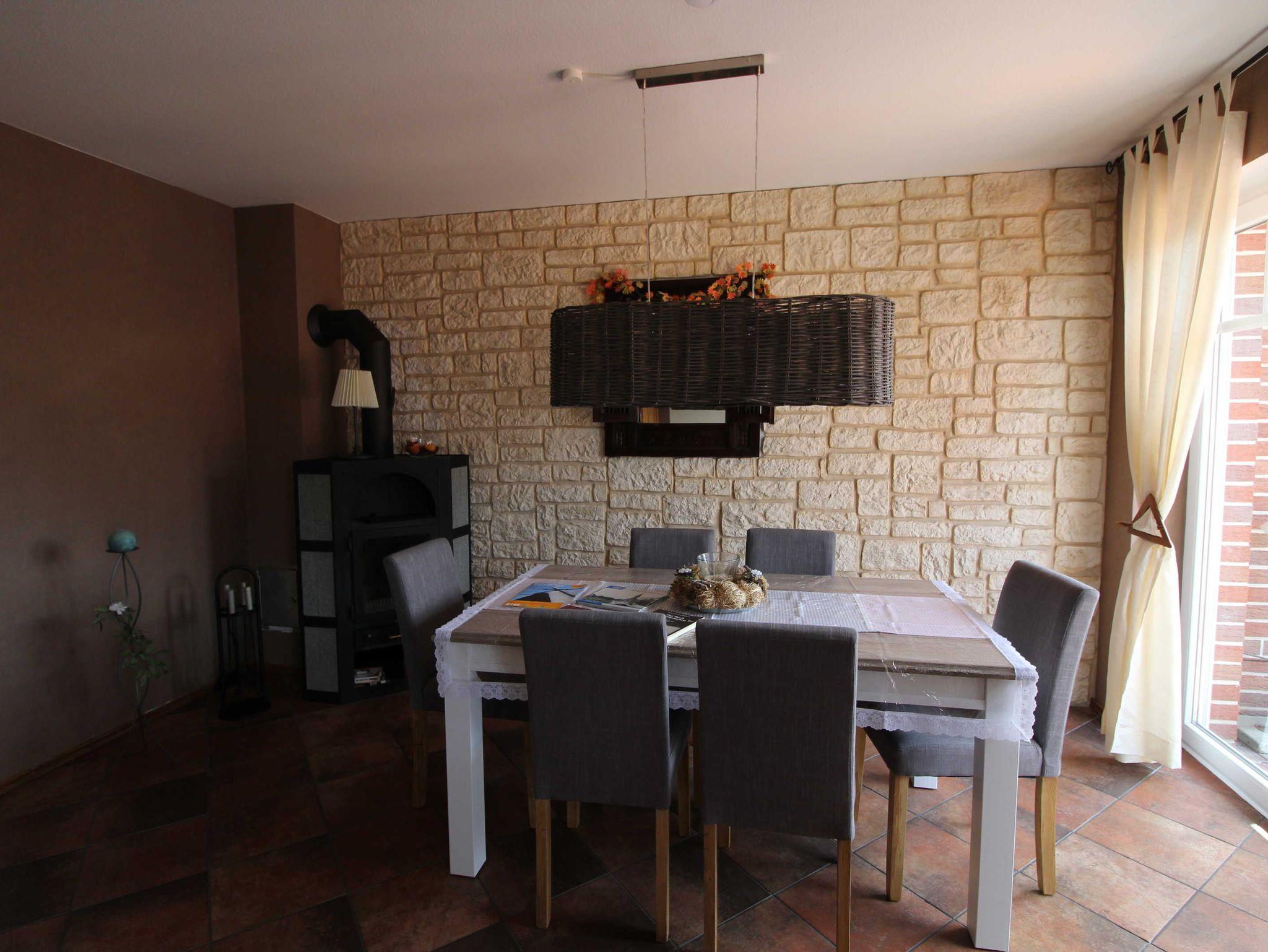 WC und Waschbecken, schönes Wohn- Esszimmer mit Kamin (Kaminholz gegen Gebühr), große Küche mit Cerankochfeld, Backofen, Spülmaschine, Mikrowelle, Kühlschrank, Kaffeemaschine, Wasserkocher, Toaster, großzügig mit Geschirr und Kochutensilien bestückt, Abstellraum mit Waschmaschine und Trockner.