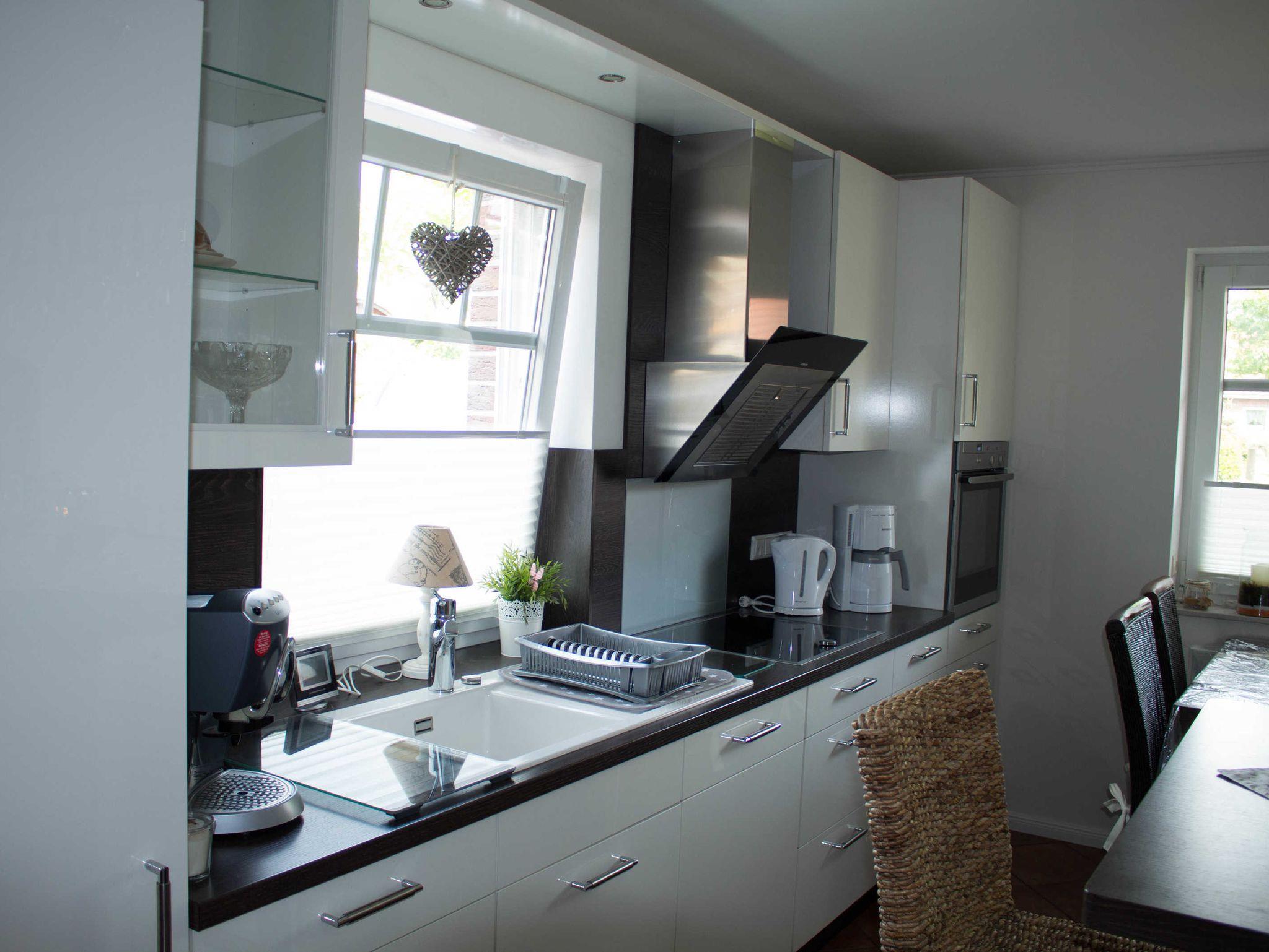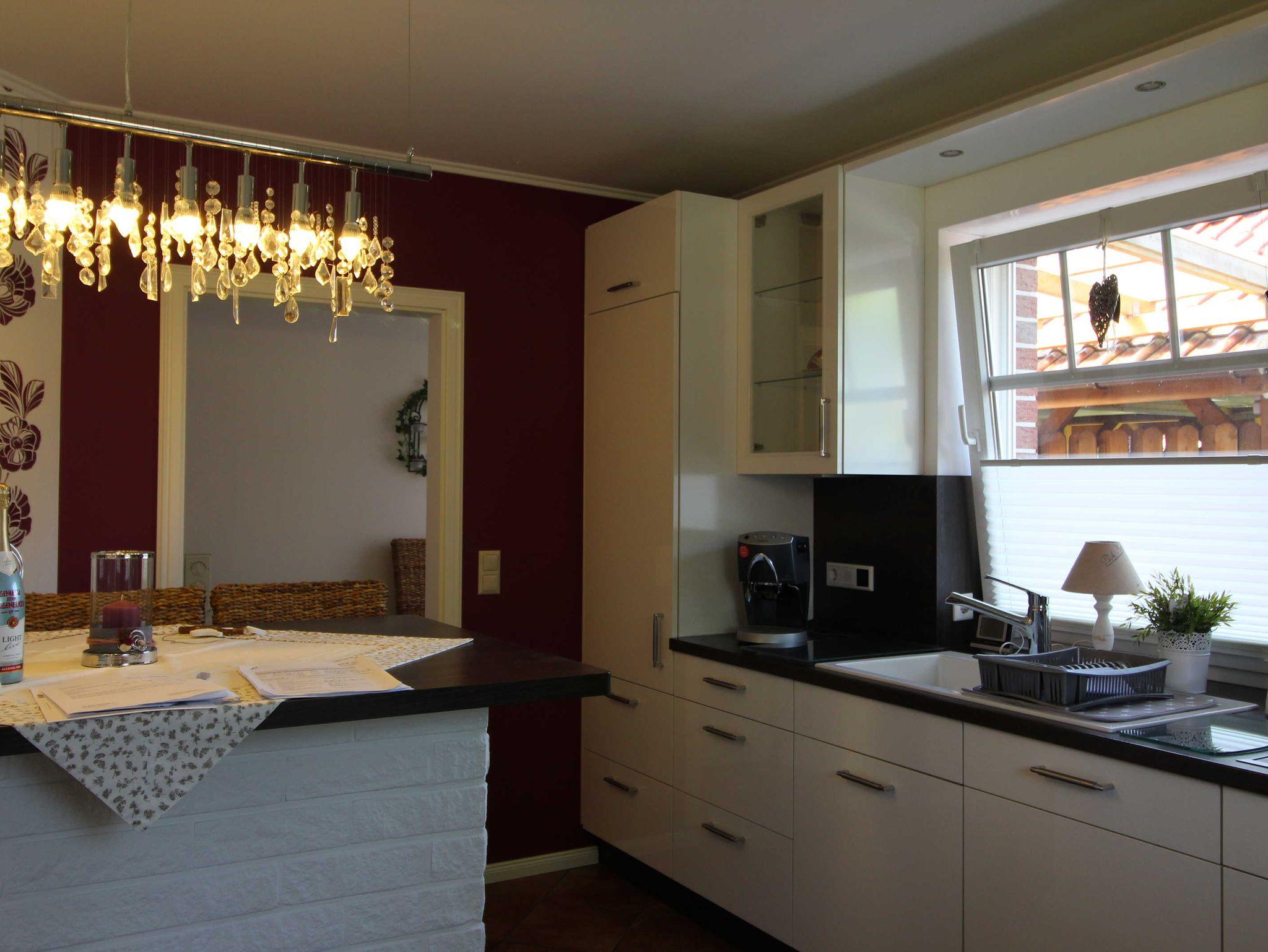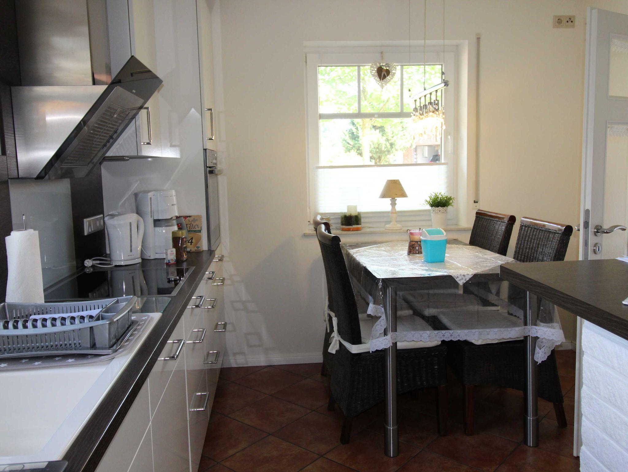 Schönes Wohn- Esszimmer mit Kamin (Kaminholz gegen Gebühr), große Küche mit Cerankochfeld, Backofen, Spülmaschine, Mikrowelle, Kühlschrank, Kaffeemaschine, Wasserkocher, Toaster, großzügig mit Geschirr und Kochutensilien bestückt, Abstellraum mit Waschmaschine und Trockner.