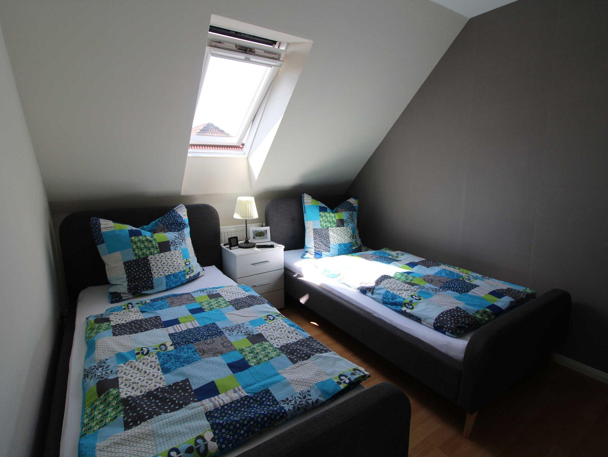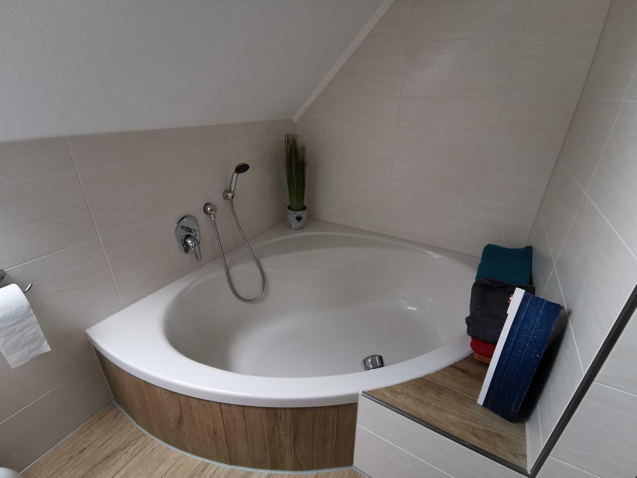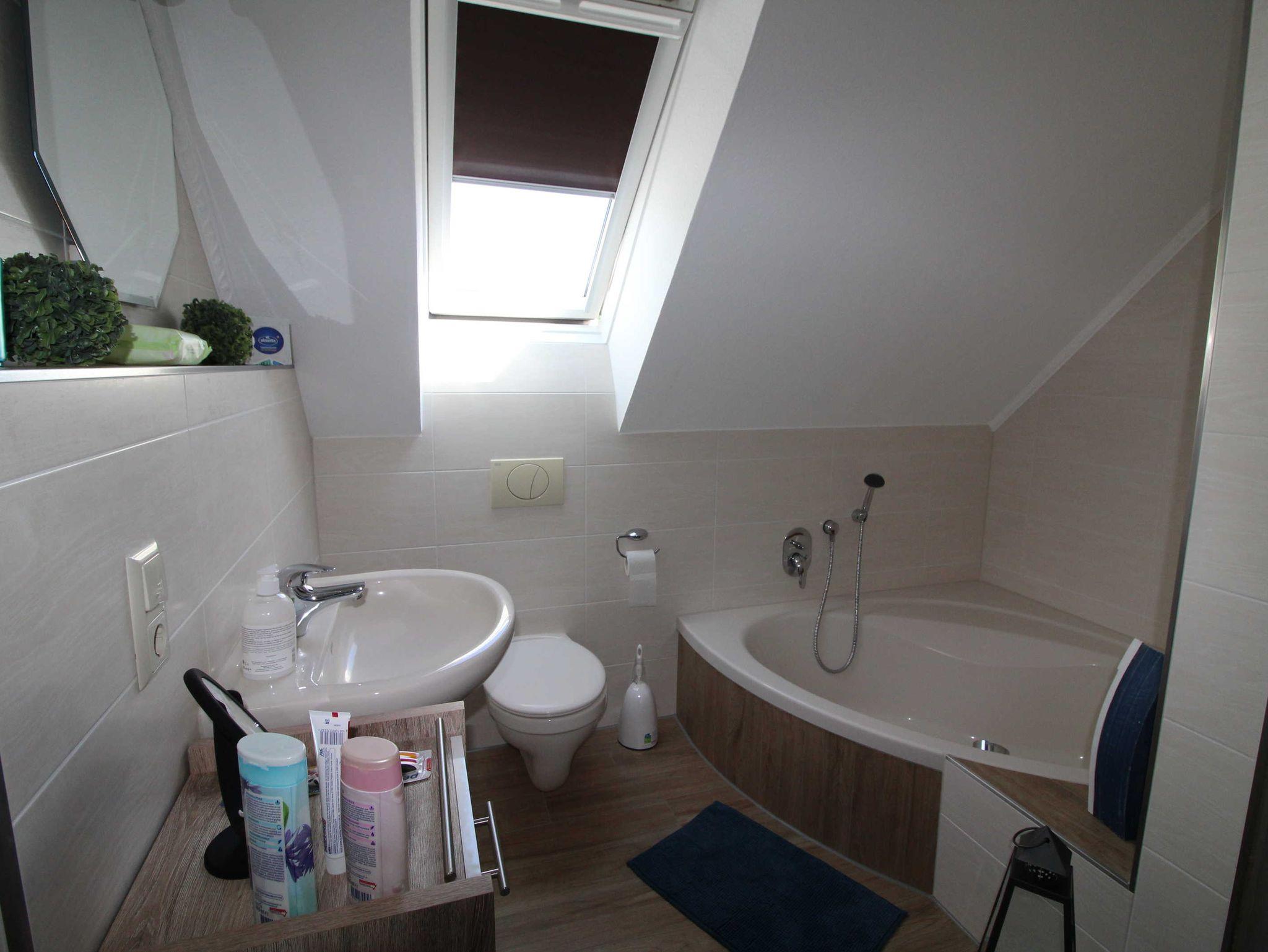 Schlafzimmer mit zwei Einzelbetten (100 x 200 cm) und geräumigem Kleiderschrank, Schlafzimmer mit Doppelbett (180 x 200cm) und geräumigem Kleiderschrank, Schlafzimmer mit Boxspringbett (180 x 200 cm) und geräumigem Kleiderschrank, Badezimmer mit Dusche, Badewanne sowie WC (Haarfön vorhanden). In allen Schlafräumen ist ein TV-Gerät vorhanden.