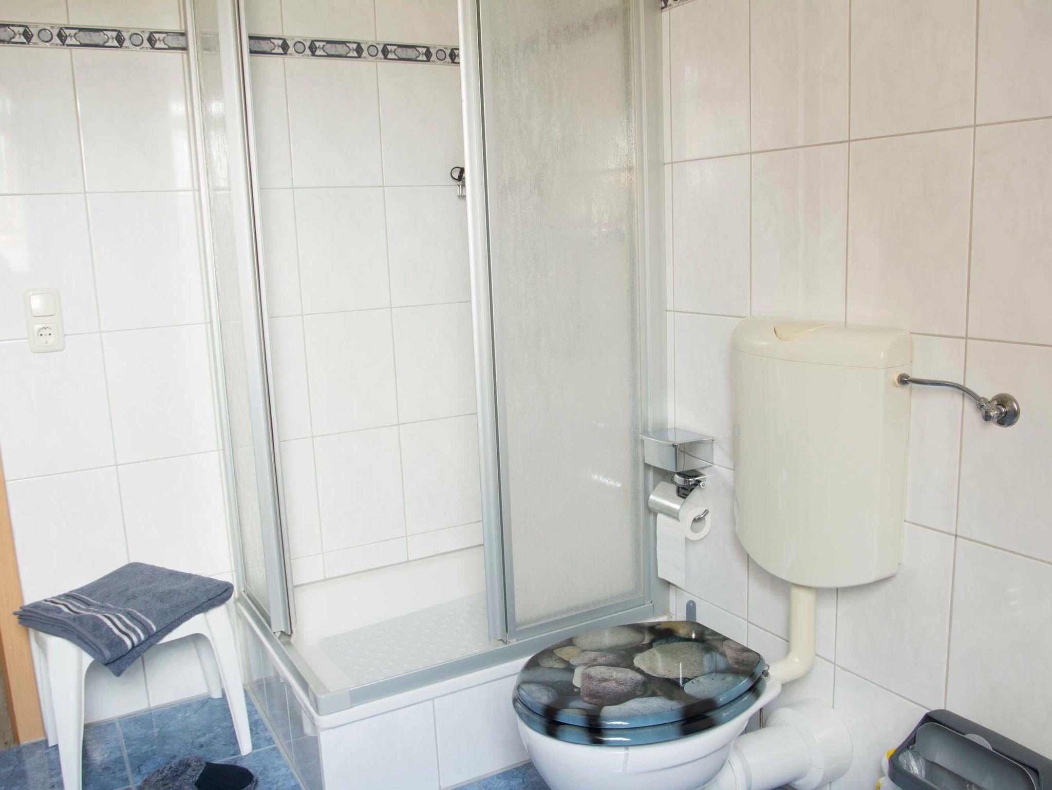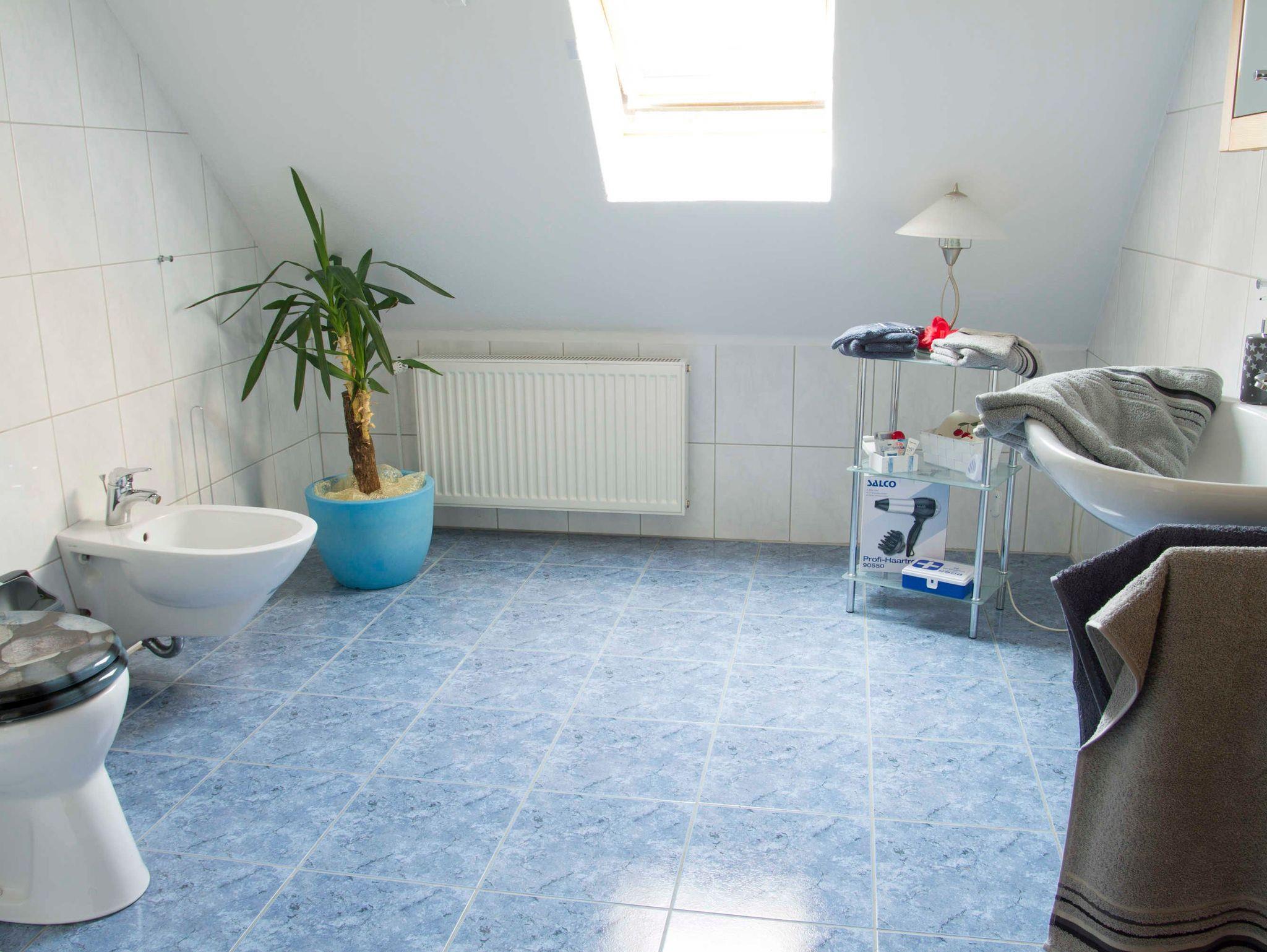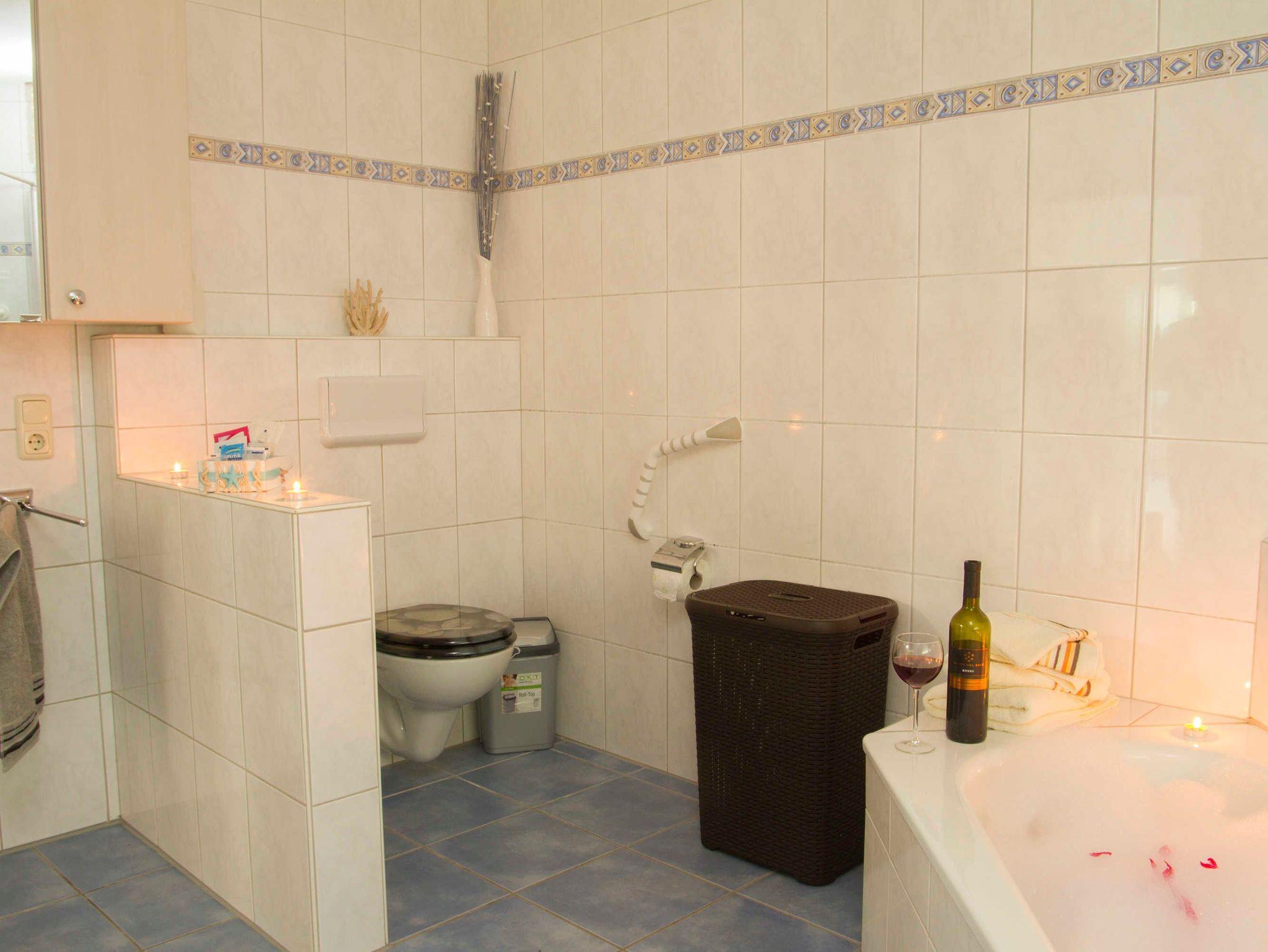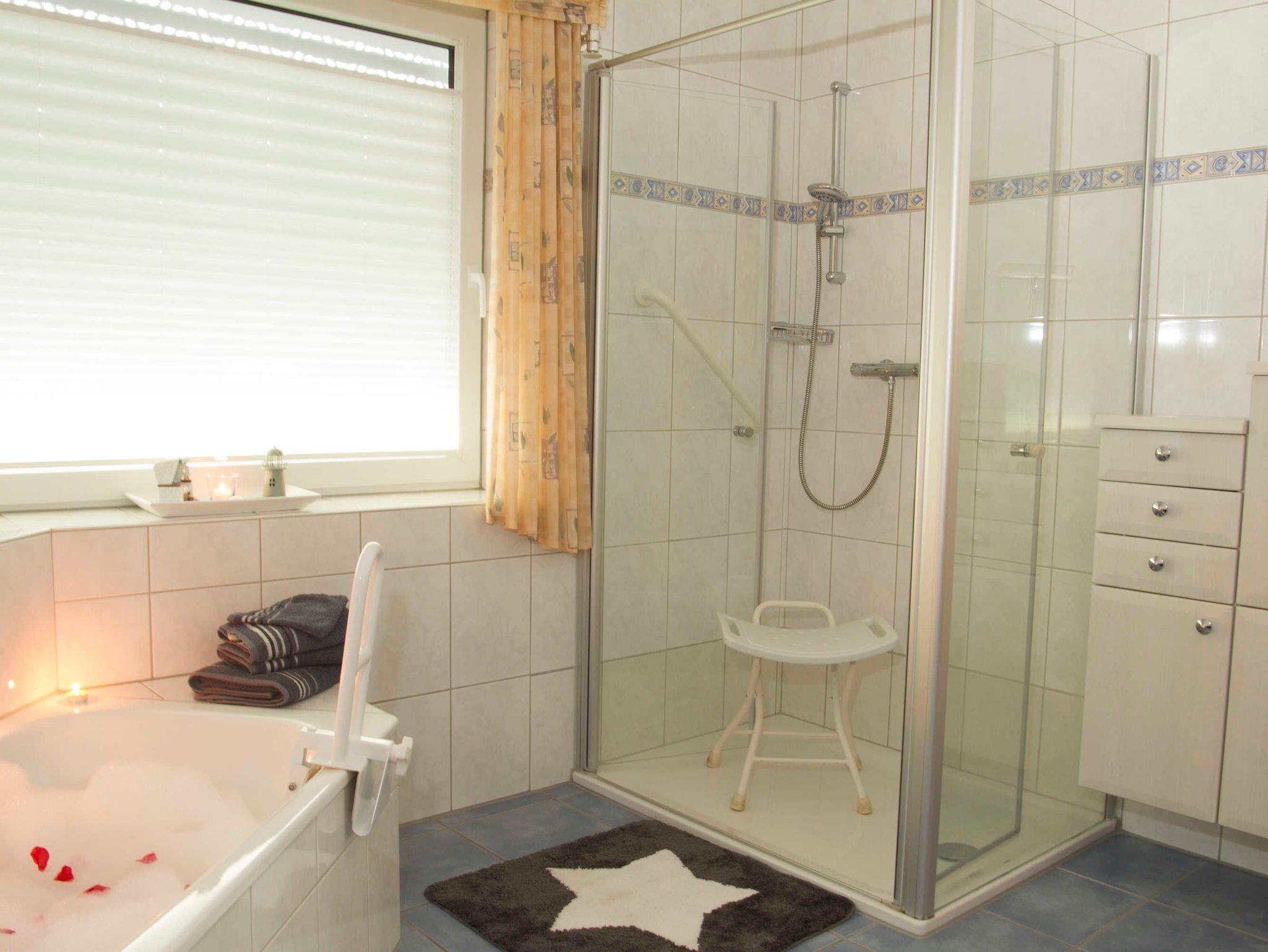 Das Ferienhaus bietet 1 Badezimmer mit Badewanne, WC und ebenerdiger Dusche im Erdgeschoss und das 2. Badezimmer mit Dusche und WC im Obergeschoss, sowie zusätzlich im Erdgeschoss 1 Gäste WC.