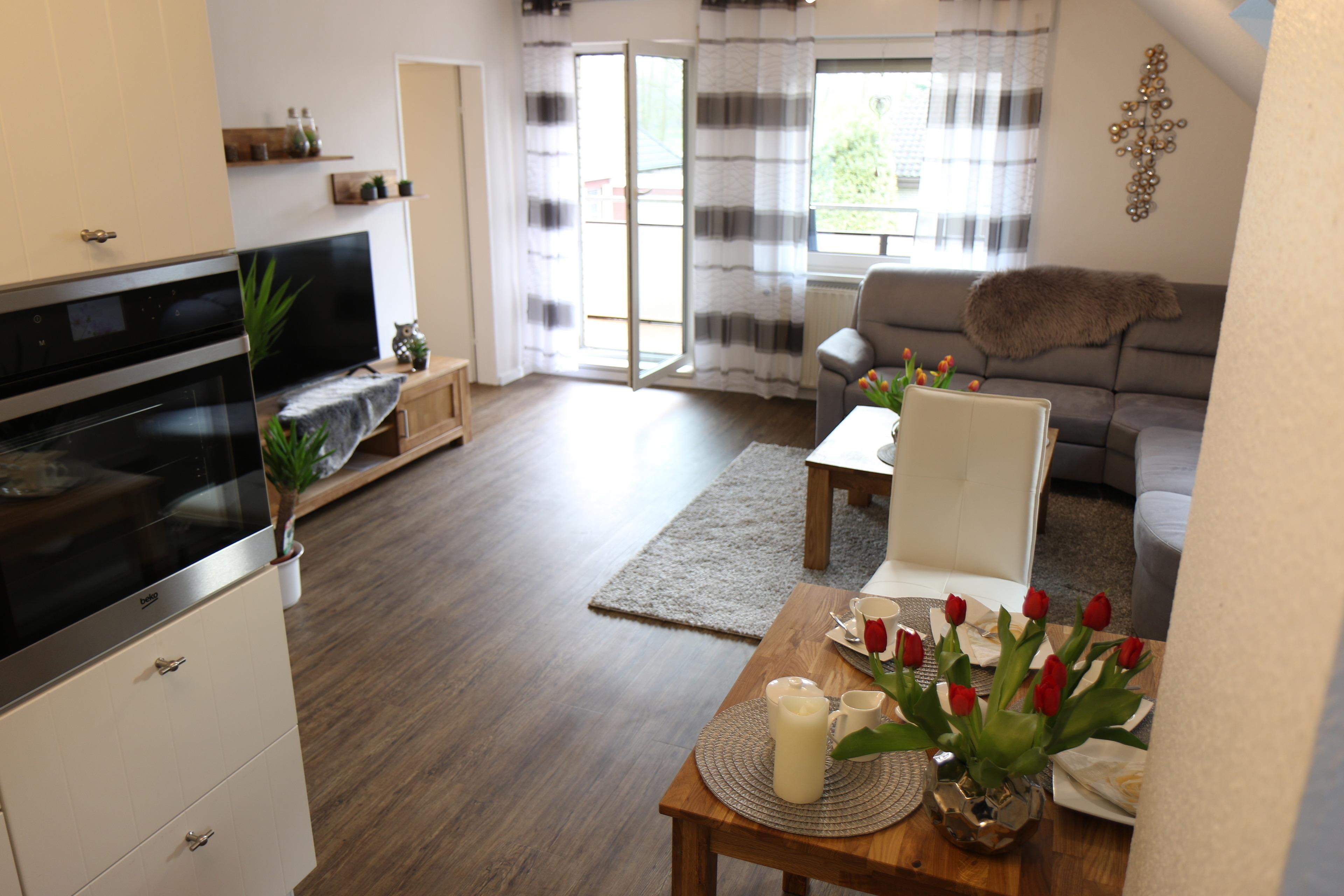 Die Wohnung beinhaltet ein Schlafzimmer für 2 Personen, ein Tageslichtduschbad, eine voll ausgestattete Küche und ein Wohlfühl-Wohnzimmer mit LED-Satelliten-TV.