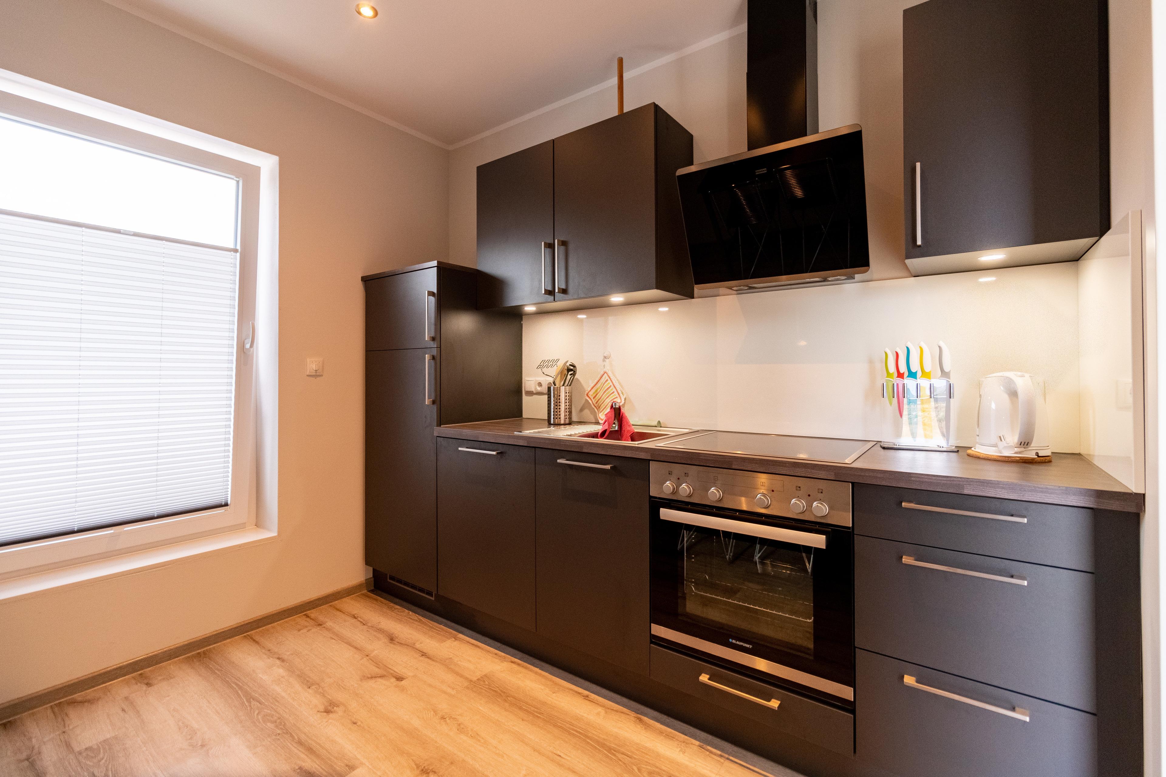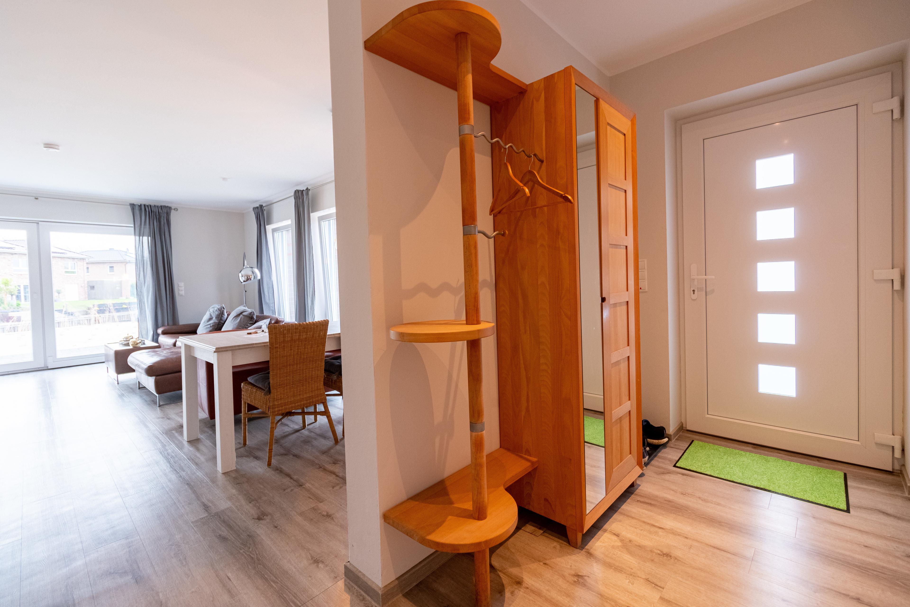 Komfortaustattung, Wohn-Essraum, Küche mit hochwertiger - komplett eingerichteter Einbauküche, Bistrotisch mit Hochstühlen, Gäste WC, Flur Garderobe im EG