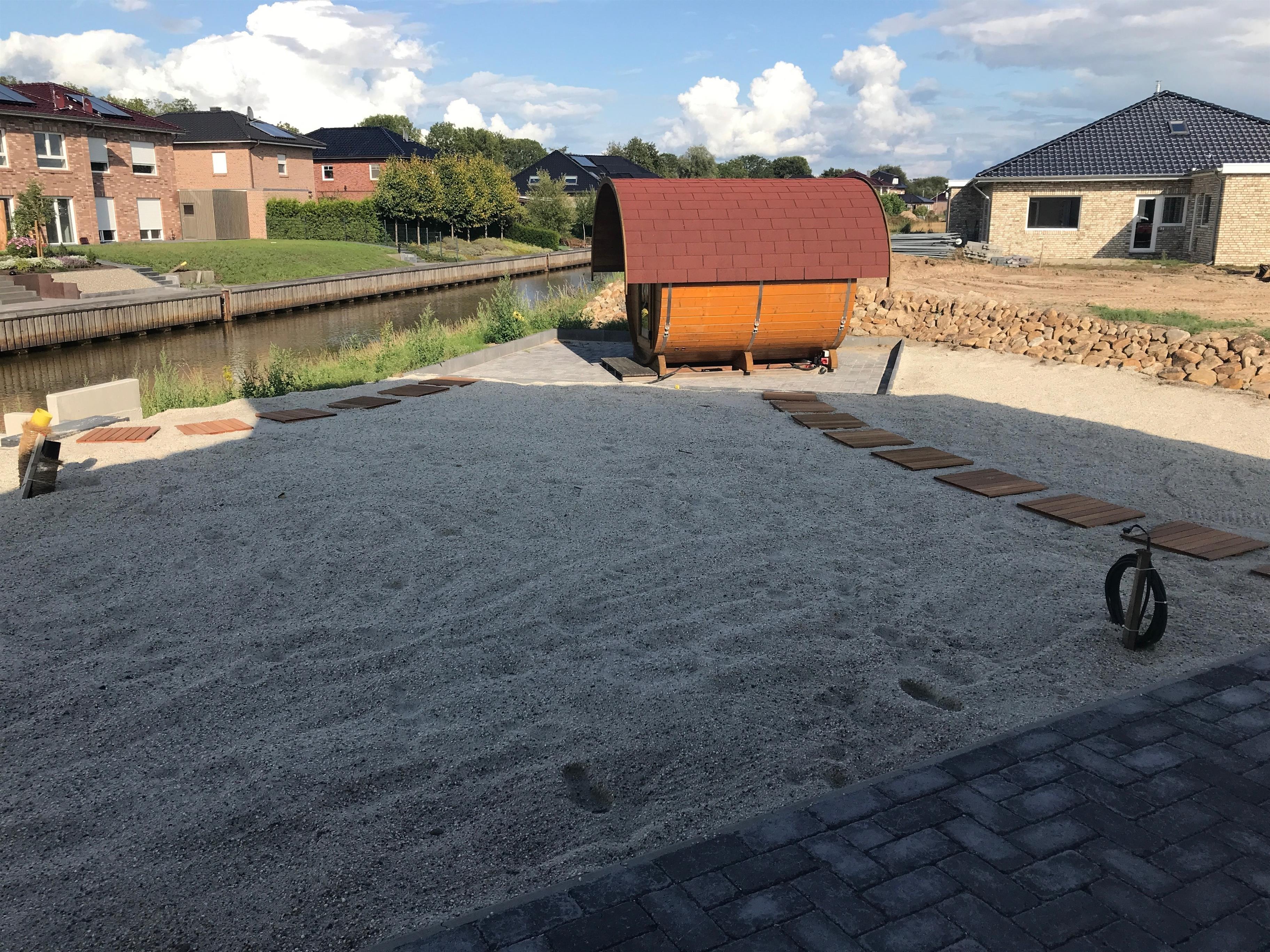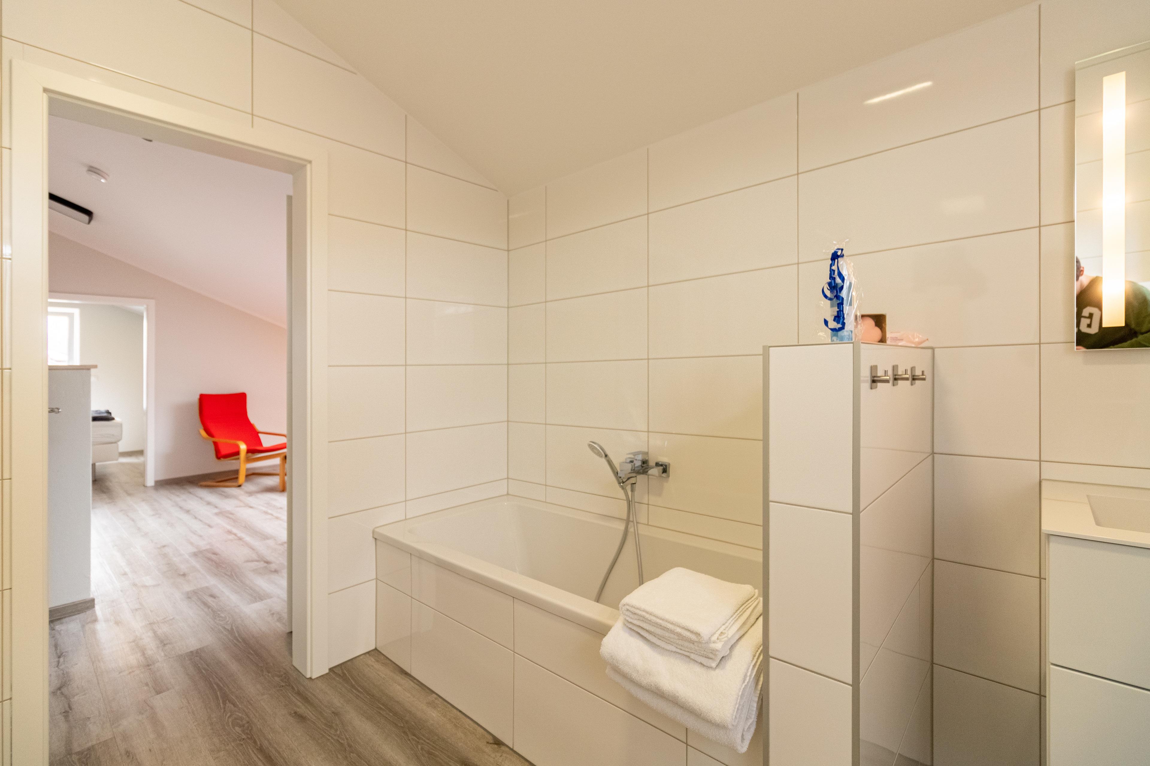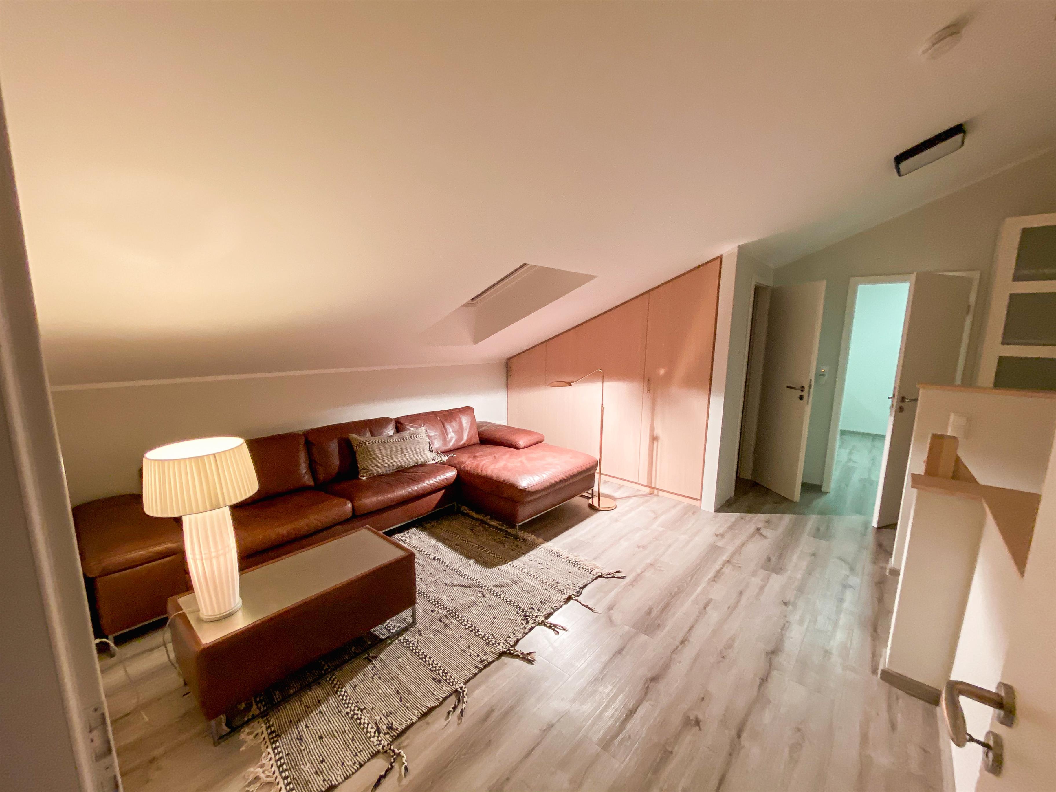 Auf der 2. Ebene befindet sich ein Schlafraum mit Komfortbetten, ein geräumiges Bad mit Fenster, Dusche u. Wanne, ein weiterer Schlafbereich mit Doppelbett, ein weiterer Wohnbereich, Hauswirtschaftsraum mit Waschmaschine und Trockner, Parkplatz am Haus und eine Strand-Fasssauna zur Nutzung nach Absprache auf dem Grundstück.