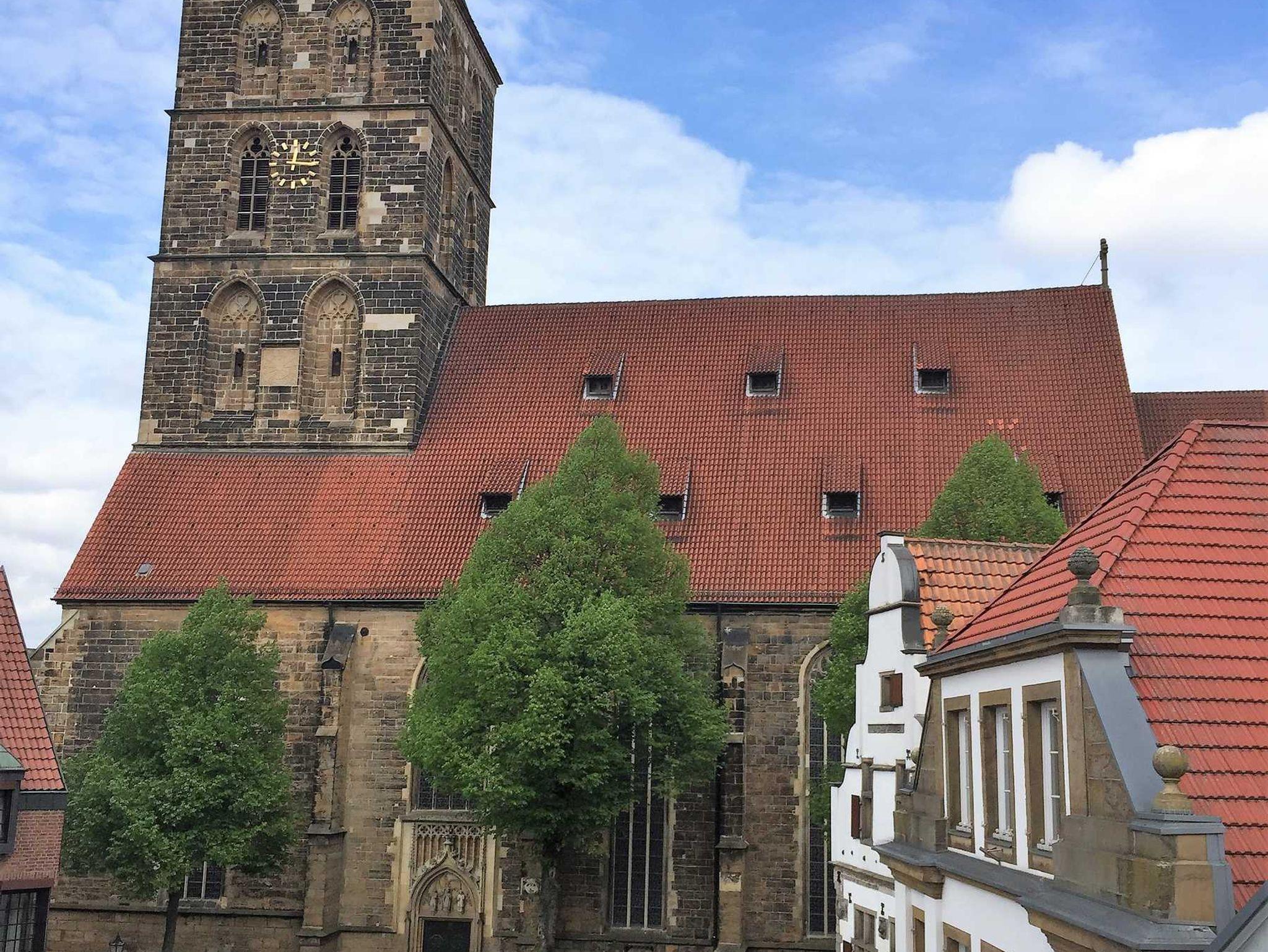 Wohnung Anna: Nichtraucher-Ferienwohnung für bis zu 6 Personen auf rund 85 qm. Die im Sommer 2018 komplett neu eingerichtete Ferienwohnung verfügt über einen Schlafraum mit Doppelbett (180 x 200 cm), einen weiteren Schlafraum mit Boxspringbett (140 x 200 cm) und ein knallrotes, zu einem vollwertigen Bett verwandelbares Sofa im Wohnzimmer (160 x 200 cm). Der hochwertig eingerichtete, geräumigen Wohn- und Schlafraum besticht durch seine großartige Aussicht über den Marktplatz und die gegenüberliegende Stadtkirche St. Dionys.Hier finden Sie neben dem bereits erwähnten Schlafsofa eine Echtleder-Polstergarnitur, einen Großbild-TV und einen Essbereich. Daran schließt sich die Einbauküche mit Herd, Backofen, Kühl-/Gefrierkombination und Spülmaschine an. Es gibt ein Bad mit Dusche und zwei separate WC-Räume. Kostenfreies WLAN ist überall vorhanden. Haustiere sind leider nicht erlaubt. Die Wohnungen befinden sich in einem der ältesten und zugleich schönsten Häuser der Stadt, einem unter Denkmalschutz stehenden, von uns kernsanierten Bürgerhaus aus der Renaissance. Namensgeber der Wohnungen sind der Rentmeister Johan Lethmate und seine Frau Anna von Beesten, die das im Jahr 1647 zerstörte Haus bereits 1649 neu errichtet hatten. Die Ems mit dem beliebten Emsradweg ist nur rund 100 Meter entfernt, zahlreiche weitere beliebte Radstrecken führen durch Rheine. Auch zum Anfang des in Rheine beginnenden Hermannshöhen-Wanderweges, der nach gut 150 km in Horn-Bad Meinberg bei den Externsteinen endet, sind es nur wenige hundert Schritte. Einkaufsmöglichkeiten, Gaststätten und Restaurants sind in nächster Nähe vorhanden. Rheine eignet sich auch hervorragend für Ausflüge in die nähere Umgebung, beispielsweise nach Münster, Osnabrück, in das Emsland oder die Niederlande.