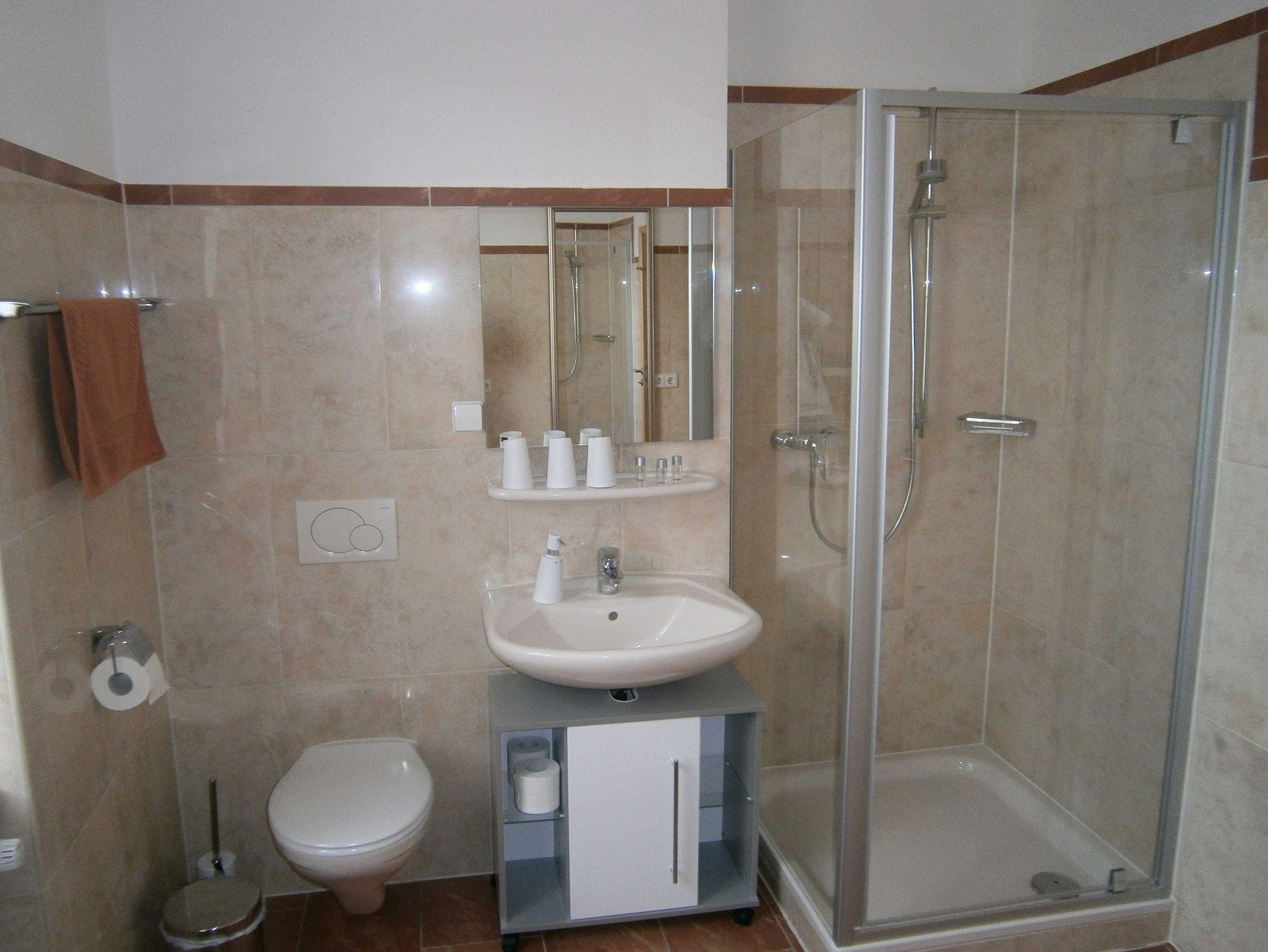 • Bad: Dusche; Waschbecken; WC; Badetücher; Fön; Seifenspender, Becher, Regale, Garderobe