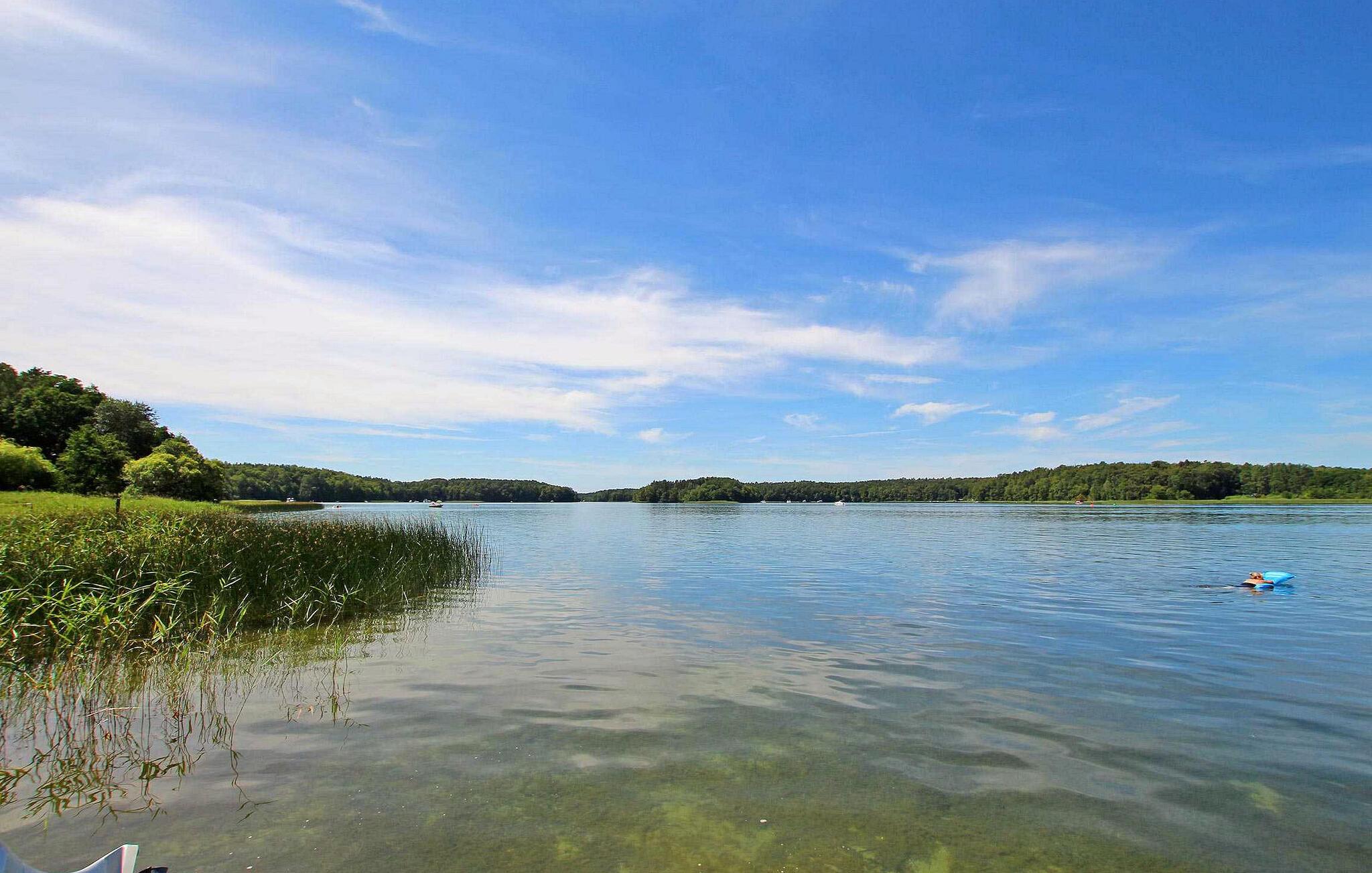 Beliggende direkte ved søen Zootzensee - med egen søadgang - uden for byen er der 4 feriehuse i forskellig størrelse til i alt op til 15 personer på ejerens cirka 3.000 kvadratmeter store bolig- og fritidsejendom. Hele anlægget er designet til at være økologisk/biologisk bæredygtigt og har sit eget biologiske rensningsanlæg, sin egen solenergiforsyning og sin egen brønd. (Vand er velegnet til babymad.) Der er restaurant i Zechlinerhütte (ca. 1,5 km), butikker og andre spisemuligheder i Rheinsberg (ca. 7 km). Den omfattende ejendom med forskellige sidde- og loungeområder strækker sig til søen, hvor alle gæster har deres egen anløbsbro, ro- eller padlebåde til leje (mod betaling) og fiskemuligheder (fisketegn fås i Zechliner Hütte). Tilstrækkelige parkeringspladser, cykelrum og parkeringspladser, grill, liggestole og WiFi er også tilgængelige. Et stort overdækket fælles opholdsområde kan bruges af alle gæster til at fejre, chatte, grille eller endda spille bordtennis. Det cirka 50 kvadratmeter store ikke-ryger sommerhus for op til 4 voksne og 1 baby er opdelt i to værelser. Den ene indgang fører til kombineret stue og soveværelse (dobbeltseng, to lænestole, pejs, fladskærms-tv), køkkenet (spiseplads, elektriske kogeplader, køleskab med fryser, miniovn, diverse små køkkenmaskiner) og badeværelset med bad/toilet. Den anden indgang fører til et andet soveværelse (dobbeltseng, bord og to stole). Huset har insektbeskyttelse på vinduerne, stor overdækket terrasse og justerbare elradiatorer. Den samlede pris inkluderer slutrengøring, vand og normalt energiforbrug. Ved brug af elradiatorer er elafregning baseret på forbrug. Medbring venligst dine egne håndklæder og sengelinned, eller du kan leje dem mod et gebyr. Hunde er ikke tilladt. Betales på stedet: turistskat, hvis det ønskes: robåd 15 EUR/dag, padlebåd 25/EUR, vaskeripakke. Det attraktive feriested Zechlinerhütte er en bydel i byen Rheinsberg og er malerisk beliggende mellem Schlabornsee og Zootzensee. Området rigt på skove og søer i udkanten af Mecklenburg Lake District og i naturparken Stechlin-Ruppiner Land har altid været et populært udflugtsmål og byder på talrige muligheder for en aktiv ferie. Området er særligt attraktivt for vandvandrere og lystfiskere, da de mange vandområder i regionen ofte er forbundet med hinanden. En udflugt i regionens uforstyrrede og rolige natur kan også anbefales for cyklister og vandrere.Der er restauranter, båd- og cykeludlejning i byen. Byen Rheinsberg med sit berømte slot, en gammel by, der er værd at se, passagerbådsture og andre indkøbsmuligheder ligger cirka 8 km væk.