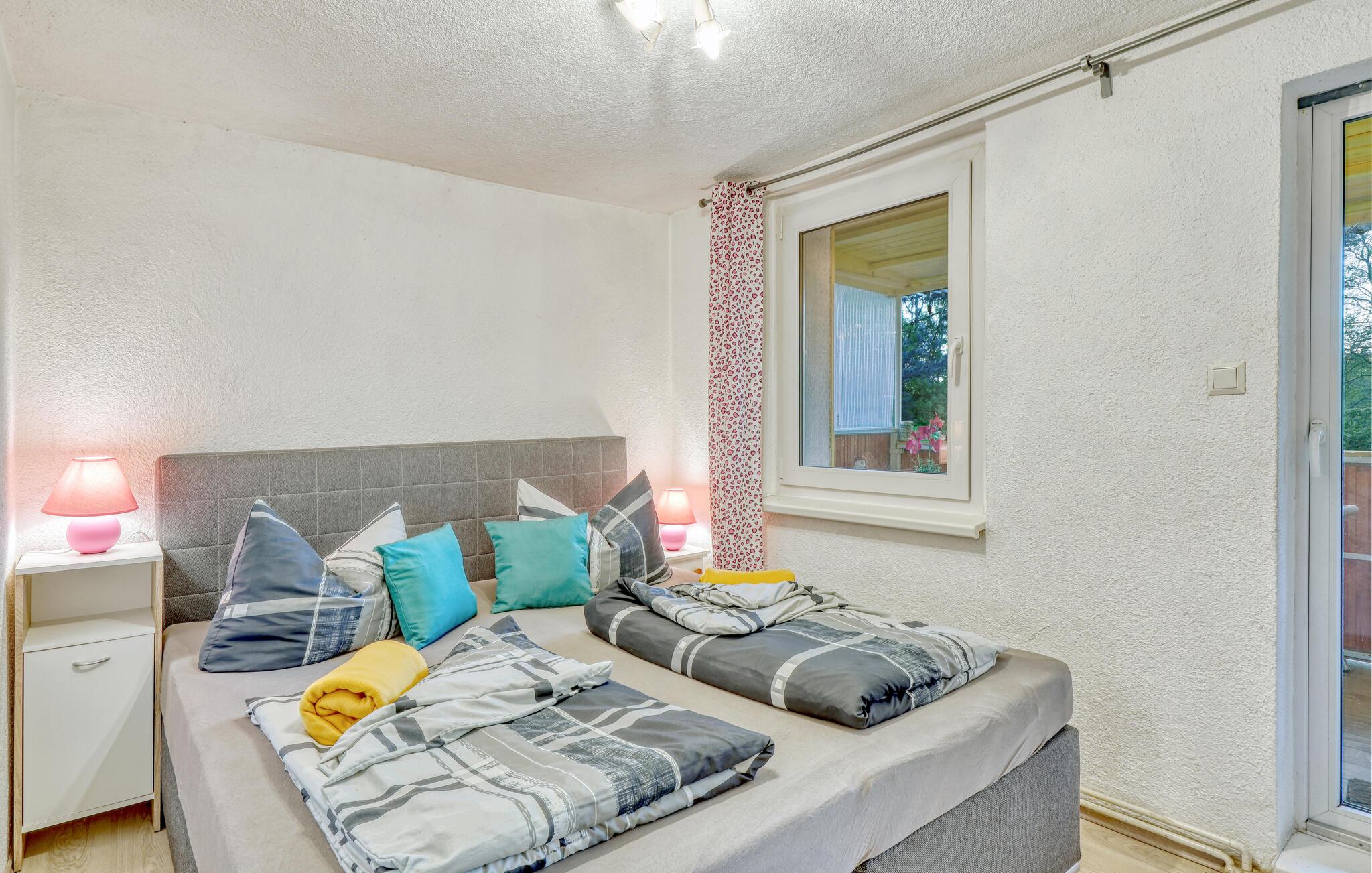 Direkte ved Großer Zechliner See, en af landets reneste søer, lige uden for byen, ligger et hyggeligt feriehus for op til 5 personer på en separat søejendom på cirka 1.200 kvadratmeter med privat bådhavn. En indhegnet, lovpligtig vandresti løber tværs over ejendommen, som fører dig til en smuk strand og en restaurant efter cirka 400 kvadratmeter. Der er indkøbsmuligheder i Kagar, cirka 2 km væk. Det cirka 65 kvm, centralt opvarmede hus med delvis udsigt over søen har et stort forværelse med siddepladser, en stue (polstrede møbler, sovesofa og ekstra seng, fladskærms-tv, radio), en spisestue (spisebord, pejs), et separat køkken (elkomfur med ovn, køleskab med fryser, mikroovn, opvaskemaskine, diverse køkkenmaskiner), to soveværelser (1 x dobbeltseng og adgang til verandaen, 1 x 2 enkeltsenge), et badeværelse (bruser, toilet) og en møbleret veranda med udsigt over søen. Den omfattende ejendom tilbyder også liggestole, siddepladser, en verandagynge, en grill, en cykelkælder og en parkeringsplads. En robåd (også med elmotor) og cykler kan lejes efter aftale mod betaling. Den samlede pris inkluderer slutrengøring, el, gas og vand omkostninger. Medbring venligst dit eget sengelinned og håndklæder, eller du kan leje dem mod et gebyr. Betales på stedet: turistskat, linnedpakke, brænde (på forespørgsel) 5 EUR/kurv.