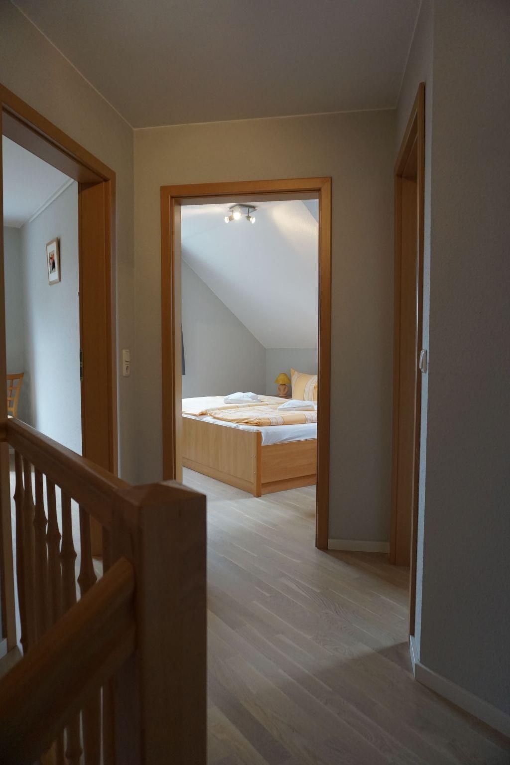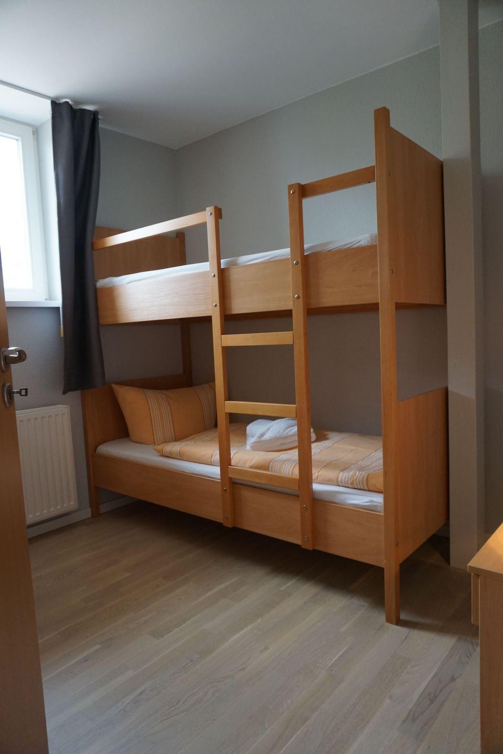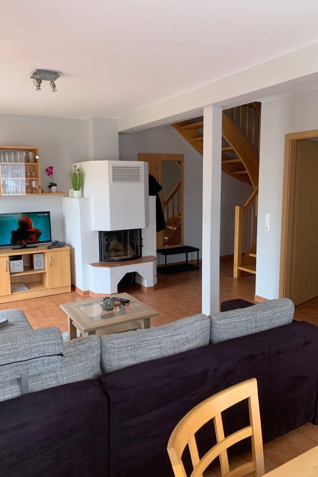 The maisonette flat is located in the neighbouring building. The size of this maisonette is 80 m² and has a living area with living room and open-plan kitchen, three bedrooms, which are reached by a spiral staircase, and a bathroom. Two bedrooms are furnished with two double beds (190 cm x 200 cm each) and the third has a bunk bed with two single beds (90 cm x 180 cm). You have a direct view of the lake from the bedrooms on the 1st floor. The kitchen is fully equipped with an oven, freezer, hob, fridge, dishwasher, toaster and kettle. In the living area you will find a seating area with chairs and a table and a sofa set. Here you can listen to music on the stereo system and use the flatscreen TV. The fireplace in the living area adds to the cosiness. The bathroom has a shower, washbasin and WC.