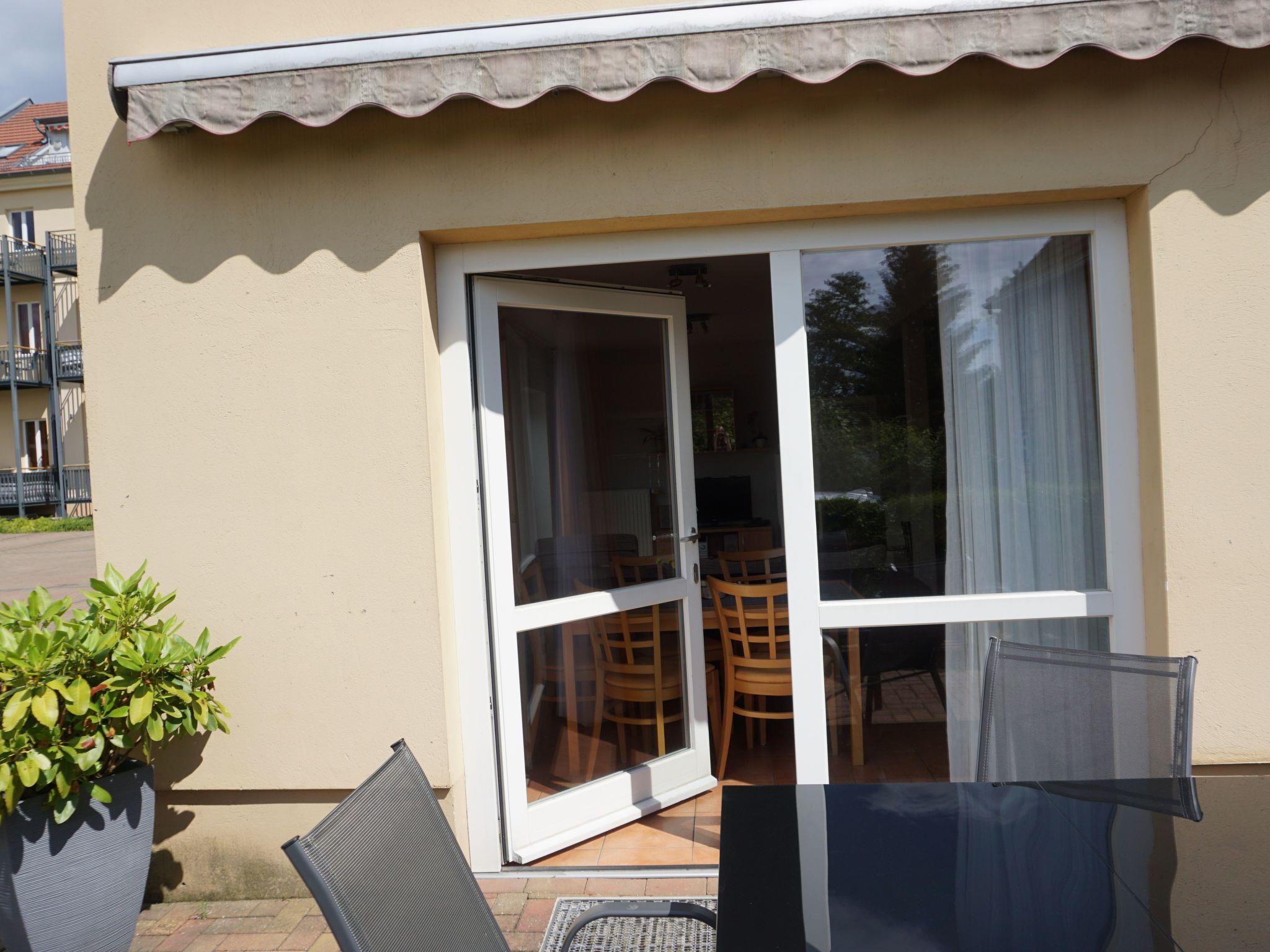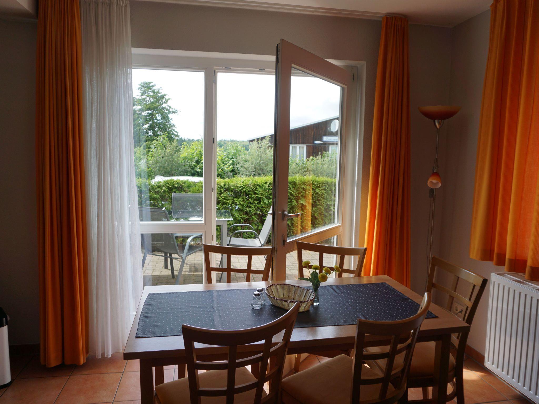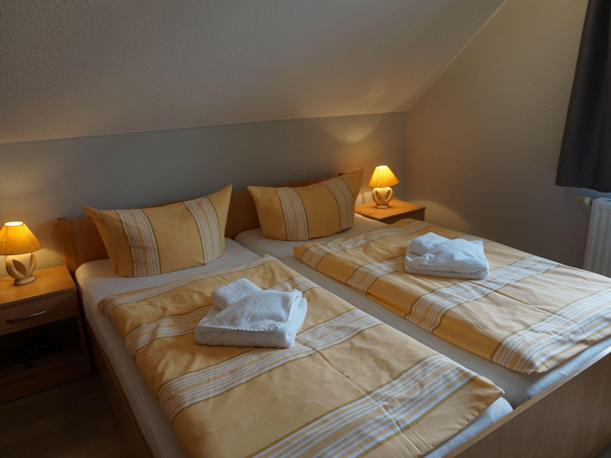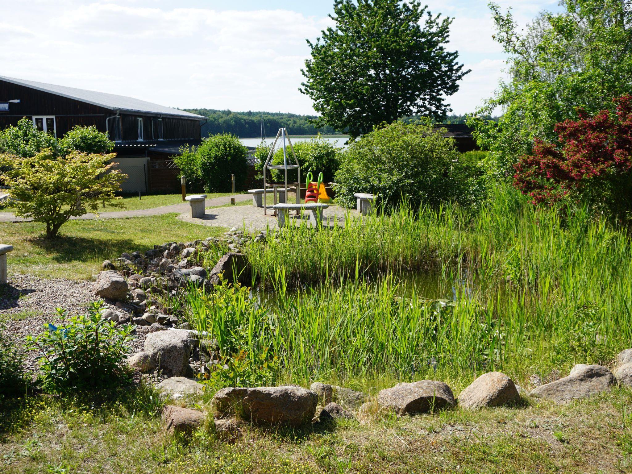 The maisonette flat is located in the neighbouring building. The size of this maisonette is 80 m² and has a living area with living room and open-plan kitchen, three bedrooms, which are reached by a spiral staircase, and a bathroom. Two bedrooms are furnished with two double beds (190 cm x 200 cm each) and the third has a bunk bed with two single beds (90 cm x 180 cm). You have a direct view of the lake from the bedrooms on the 1st floor. The kitchen is fully equipped with an oven, freezer, hob, fridge, dishwasher, toaster and kettle. In the living area you will find a seating area with chairs and a table and a sofa set. Here you can listen to music on the stereo system and use the flatscreen TV. The fireplace in the living area adds to the cosiness. The bathroom has a shower, washbasin and WC.