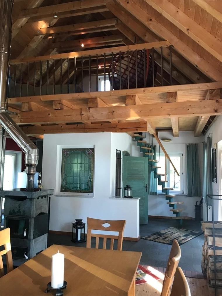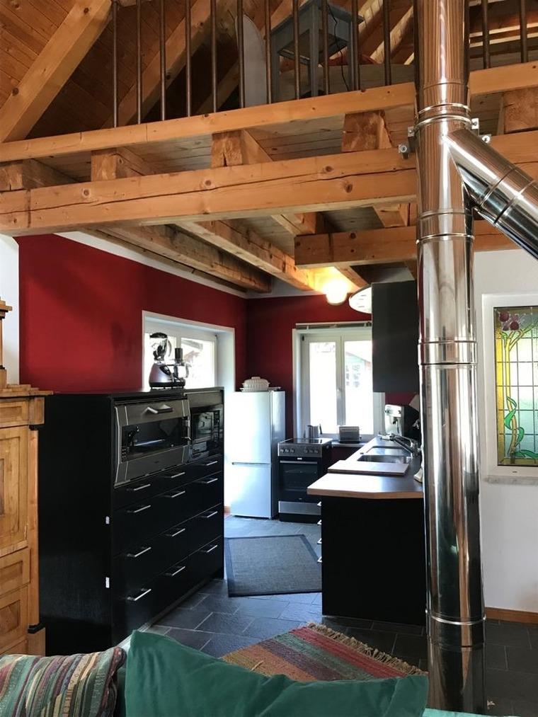 Für ein gemütliches Ambiente sorgt die Wohneinheit mit Ausziehcouch, heimeligem Essplatz und Kaminofen .