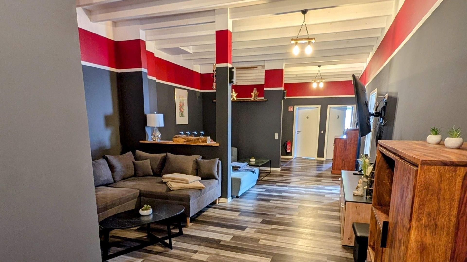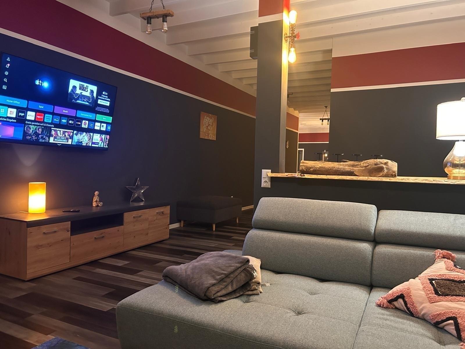 Der gemütliche Aufenthaltsraum mit bequemen Sitzmöglichkeiten und einem großen TV ist der ideale Ort, um sich zu entspannen und gemeinsame Abende zu verbringen.
