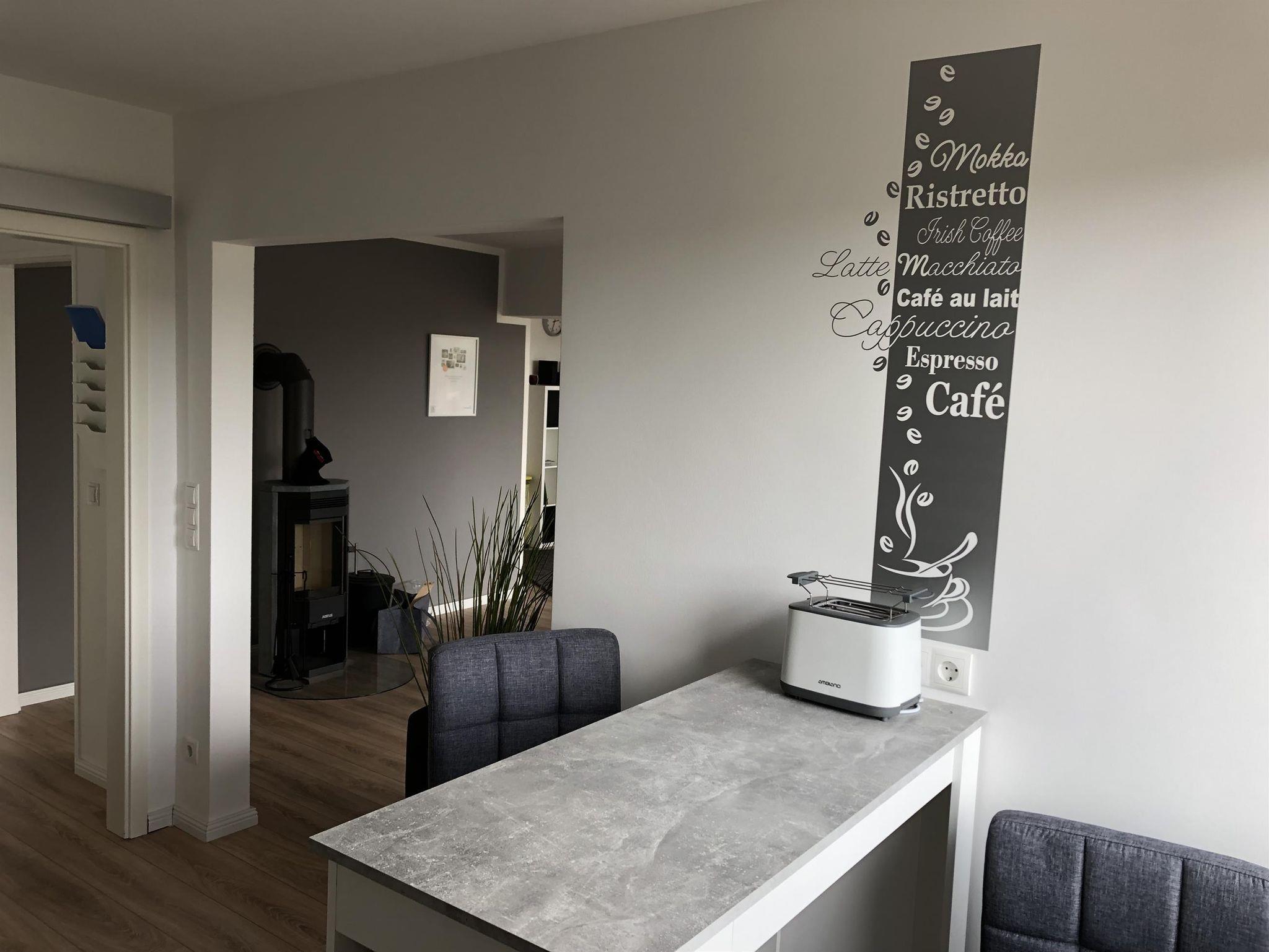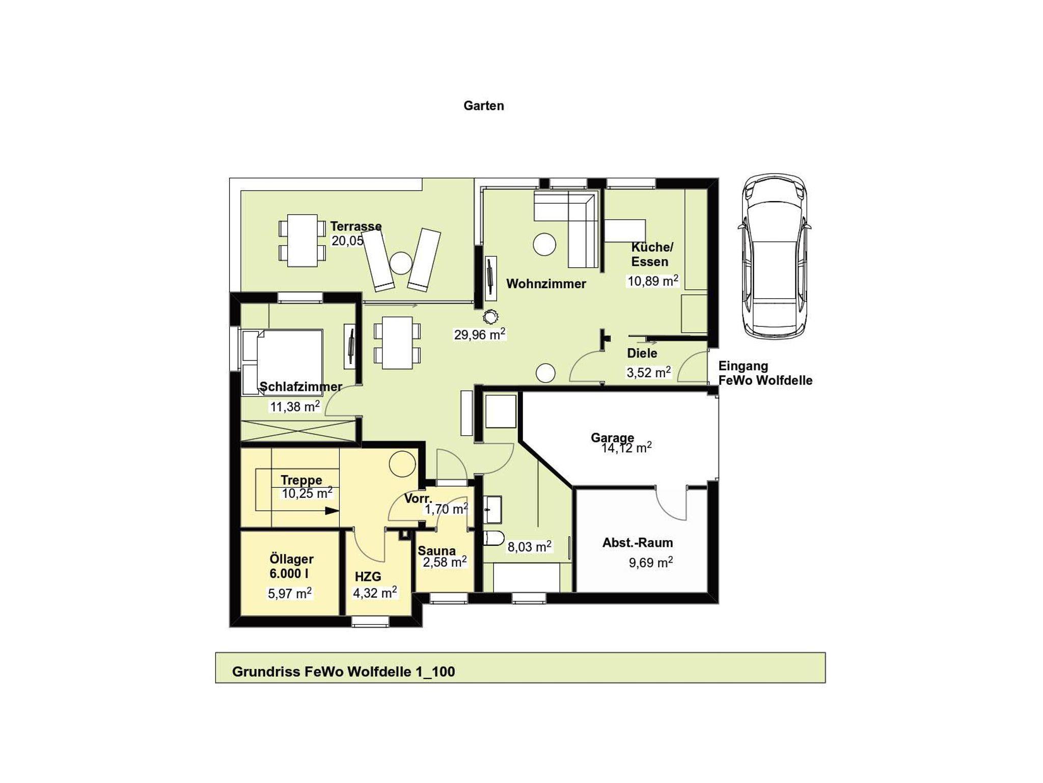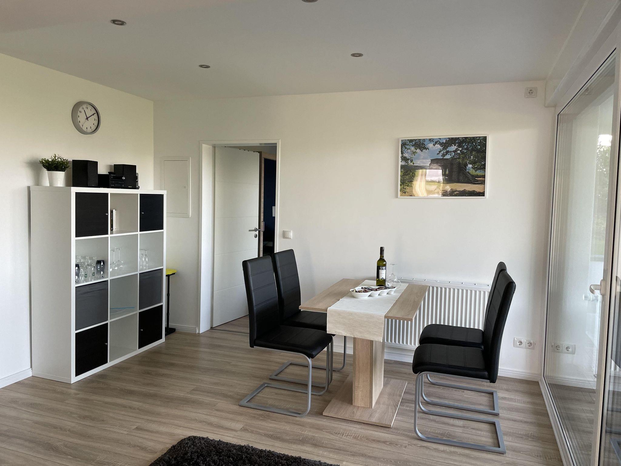 Die Wohnung Wolfsdelle im Untergeschoss des Hauses bietet mit ihren 65 m² ausreichend Platz für einen erholsamen Urlaub zu Zweit. Aus dem großzügigen Wohnzimmer mit Kamin bietet sich ein Blick in den gemütlichen Garten. Von dort kann man auch einen Blick auf den Rhein Richtung Koblenz erhaschen. Der Essbereich grenzt dirkt an die große überdachte Terrasse an. Die modern eingerichtete Küche bietet zusätzlich einen Sitzbereich. Sie ist mit Spülmaschine, Herd, Ofen und Mikrowelle voll ausgestattet.