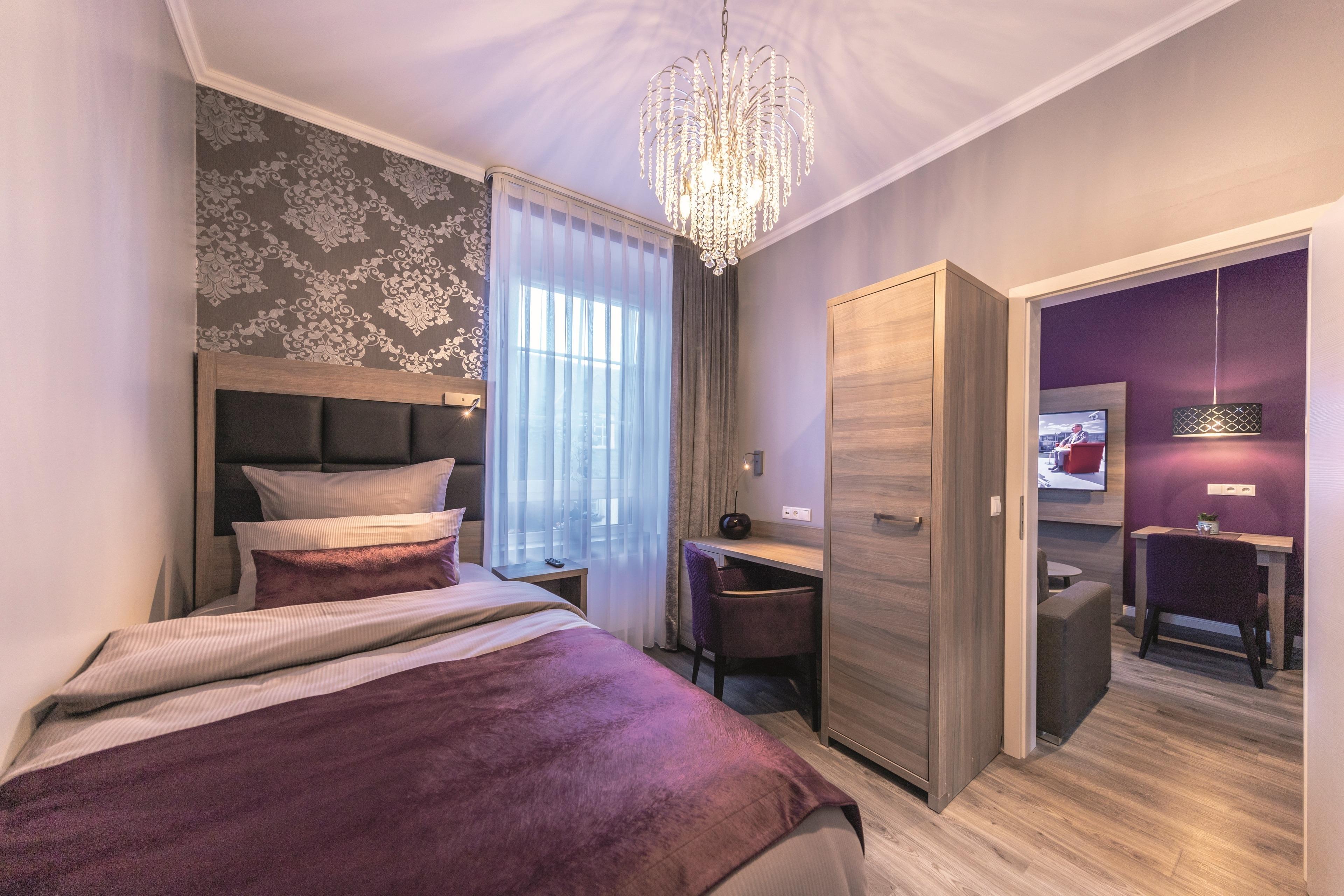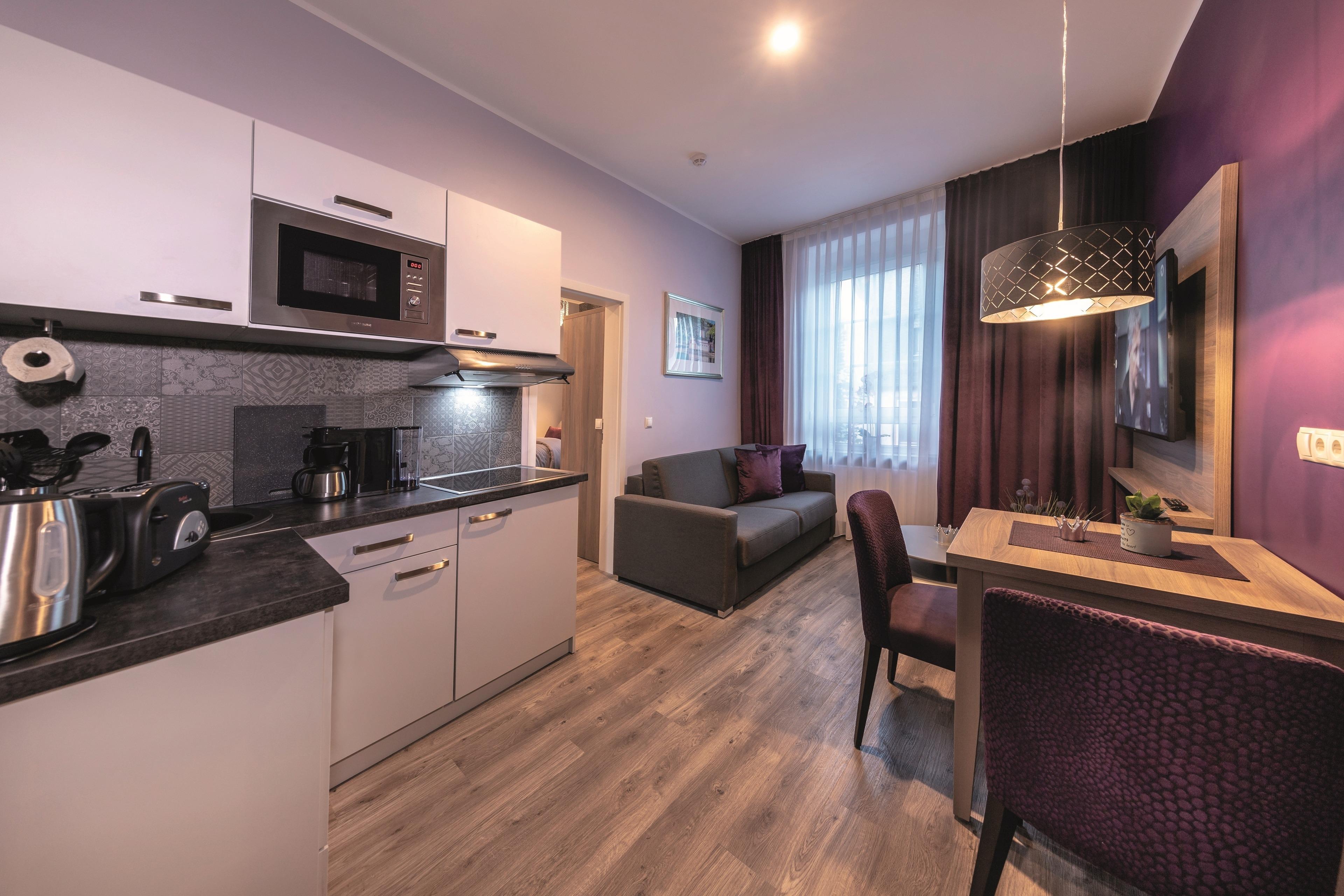 Im Haus Burgenheimat befinden sich 8 Apartments: 2 Princesize-Apartments F**** (20 - 30 m²), 1 Queensize-Apartment F*** (25 m²), 2 Queensize-Apartments F**** (30 - 40 m²) und 3 Kingsize-Apartments F**** (40 - 50 m²). Schlafen Sie wie ein König in den komfortablen überlangen Boxspringbetten (2,20 m) der Premium-Marke Royal Bedding®. Die Bettbreite beträgt in den Princesize-Apartments 1,00 m, in den Queensize-Apartments 1,60 m und in den Kingsize-Apartments 2,00 m. Alle Betten haben eine durchgängige extrahohe Matratze für besonderen Schlafkomfort. Im "Thronsaal", dem modernen Badezimmer, erwartet Sie ein WC mit integrierter Lüftung, ein stilvolles Waschbecken und eine bodengleiche Dusche mit Regenbrause und Handbrause. Die Küche ist mit allem, was man braucht, ausgestattet. Bereiten Sie sich z.B. ein leckeres Frühstück mit dem Tefal Toast'n'Egg und brühen sich Ihren Kaffee mit der Senseo Switch entweder mit Filter oder mit Kaffeepad. Auf dem 4-Platten-Cerankochfeld lassen sich auch komplette Menüs zubereiten. Eine Mikrowelle mit Grillfunktion sorgt für Essen in Minutenschnelle. Und damit der Abwasch nicht lästig wird, steht eine kompakte Geschirrspülmaschine bereit. Durchdachte Annehmlichkeiten erwarten Sie in jedem Raum der Apartments: ein digitaler Türspion, USB-Anschlüsse an den Leuchten am Bett sowie am Schreibtisch, eine integrierte Toilettenlüftung, eine bodengleiche Dusche mit Regenbrause, ein Laptop-Safe, überlange Betten, extrahohe Matratzen, große UHD-Smart-TVs, vollausgestattete Küche inkl. kompaktem Geschirrspüler. Neben der Selbstverpflegung besteht die Möglichkeit am Frühstücksbuffet des Hotels teilzunehmen. Als Gast erhalten Sie außerdem für die Dauer Ihres Aufenthalts ein kostenfreies Gästeticket für die Nutzung des ÖPNV im Gebiet des VRM.