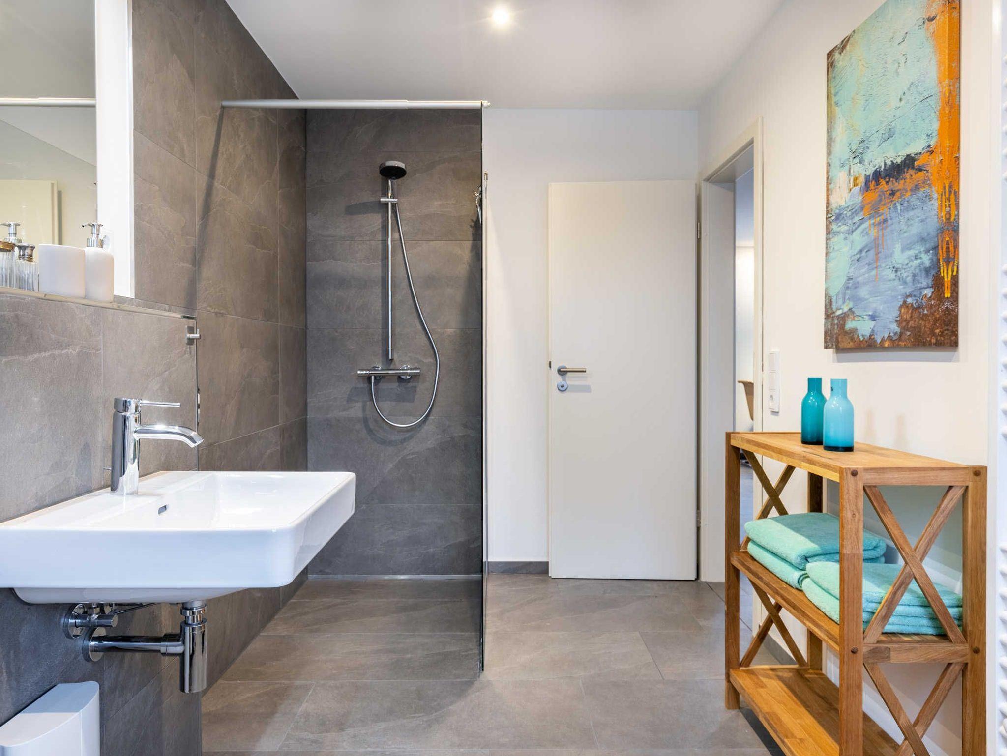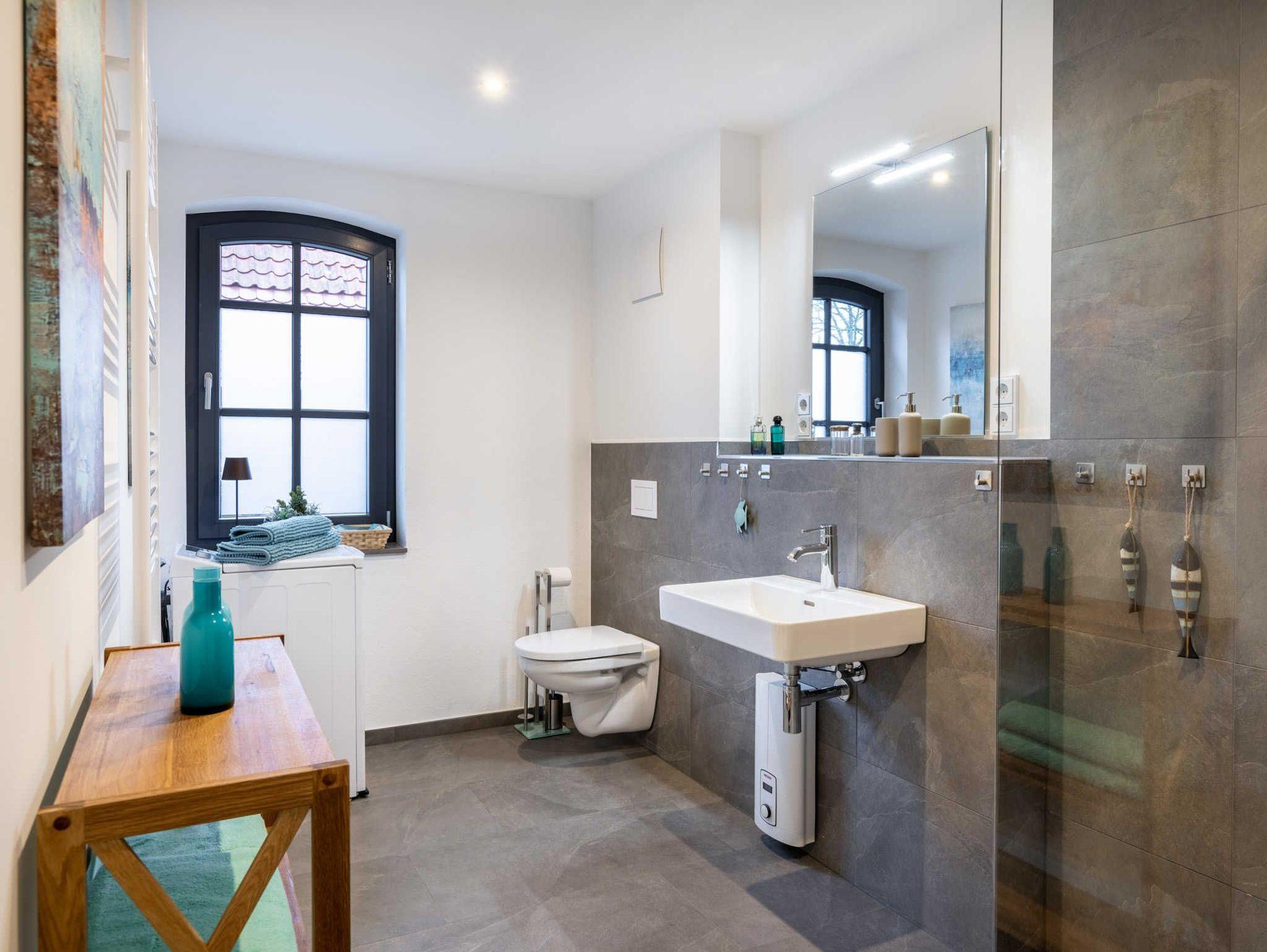 Weiterhin gibt es im Ergeschoss ein wohlig gestaltetes, ebenerdiges Bad mit begehbarer Dusche, WC und Waschmaschine.