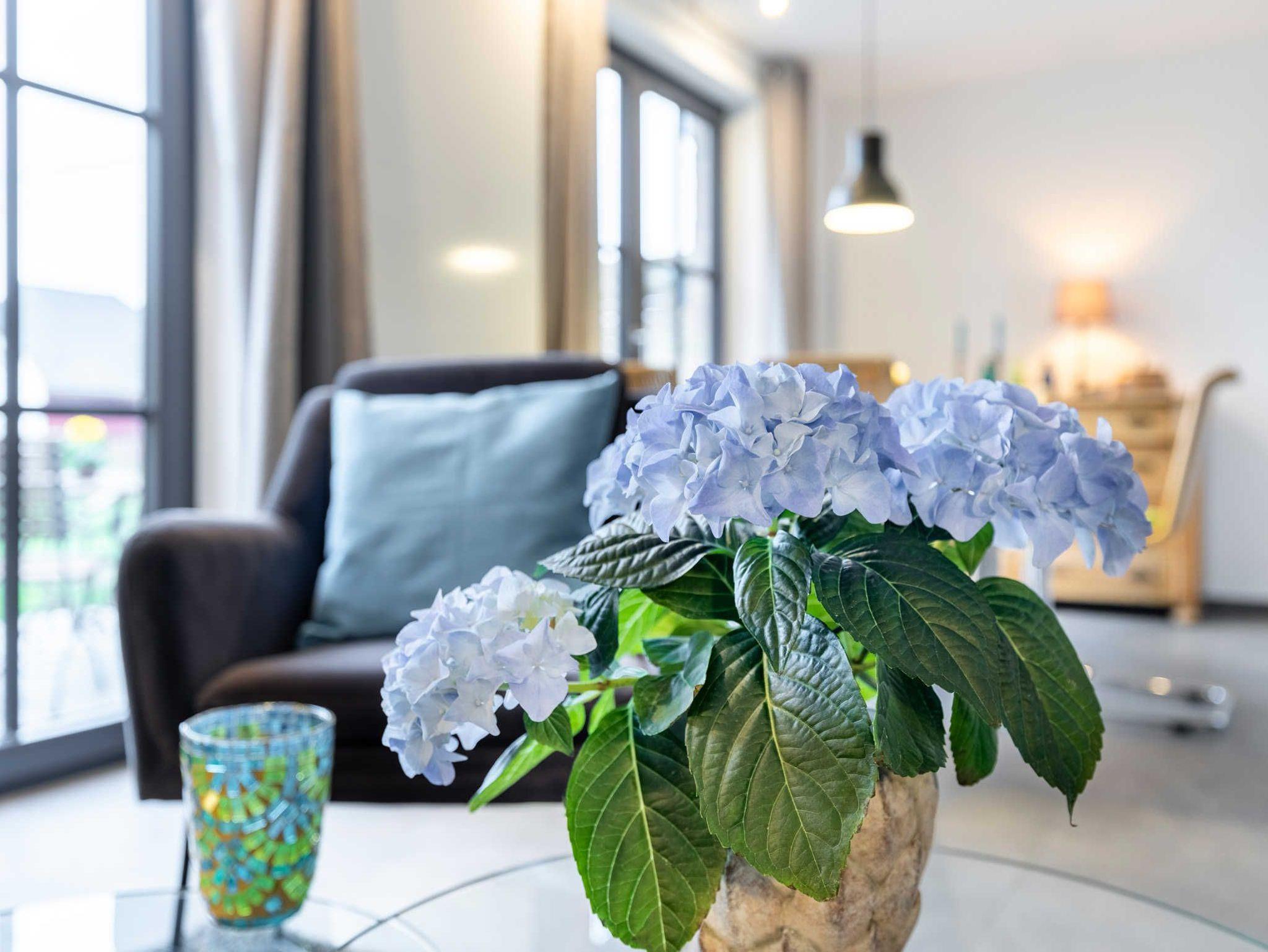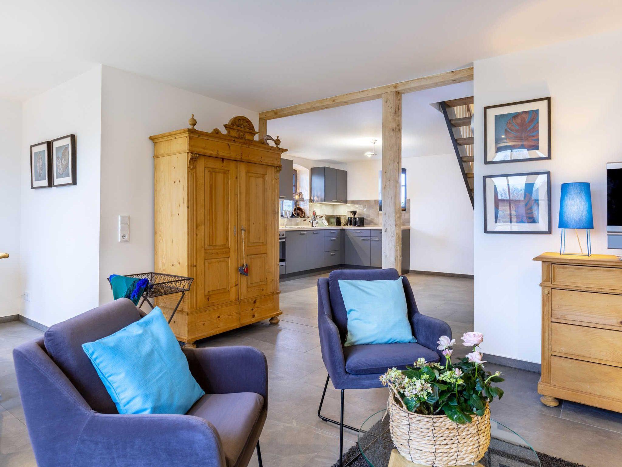 Der Wohnbereich ist ausgestattet mit Flach- Smart TV (Netflix und Magenta TV), Bluetooth Lautsprecher, Esstisch und gemütlicher Sitzecke mit Ledercouch und Sesseln. Für Kurzweile im Urlaub sorgen außerdem eine bunte Spielsammlung und eine feine Bücherauswahl.