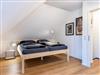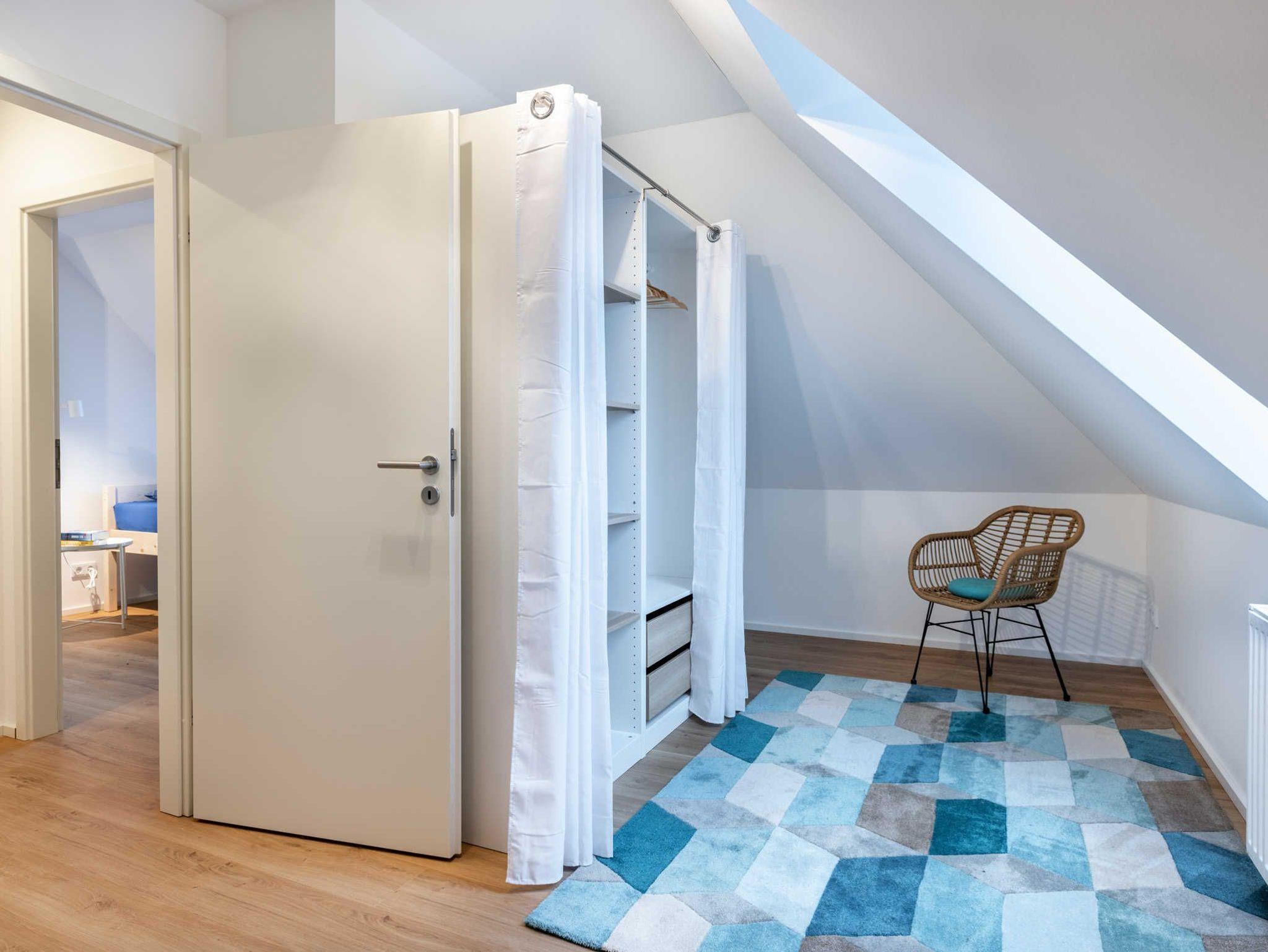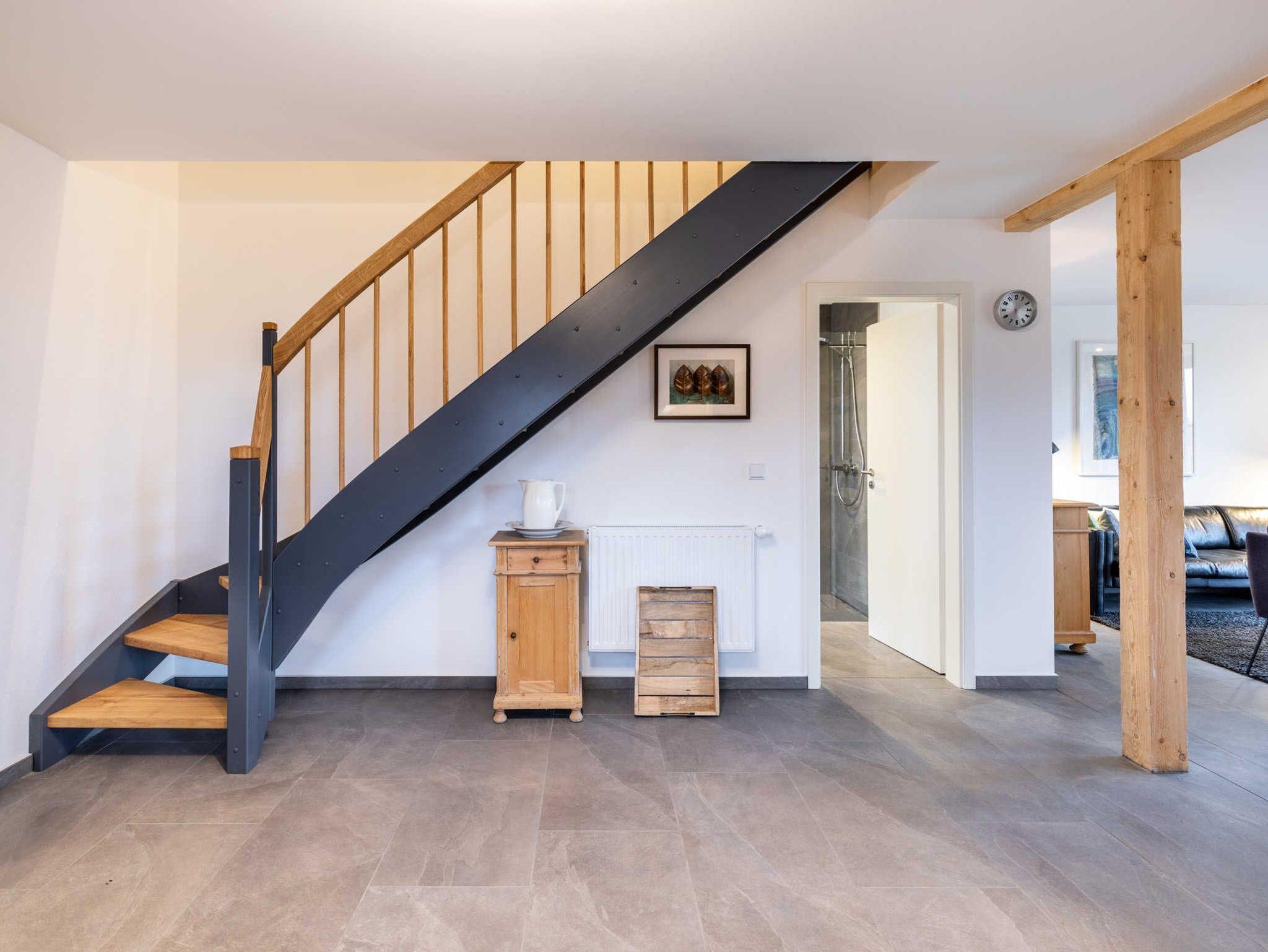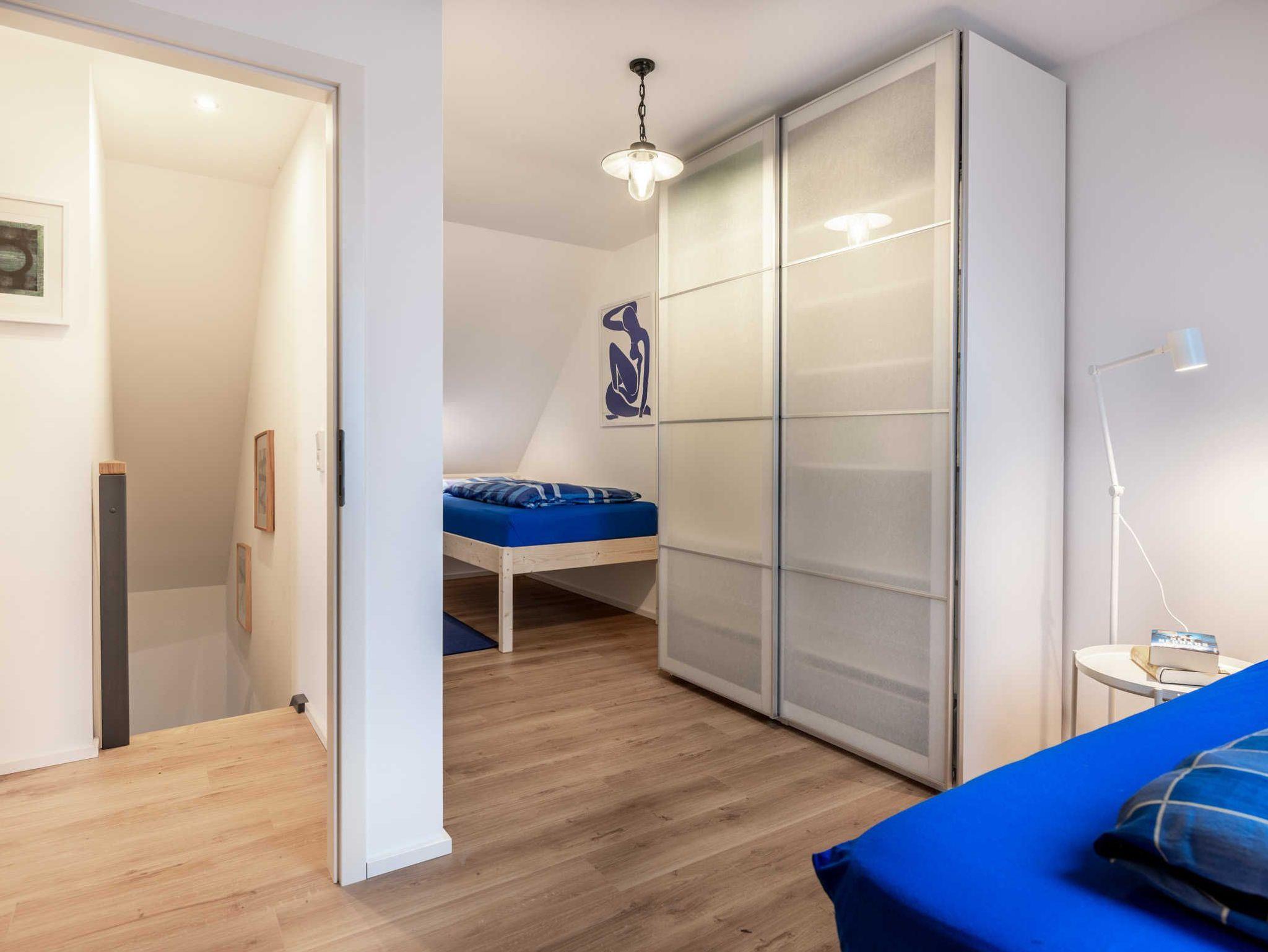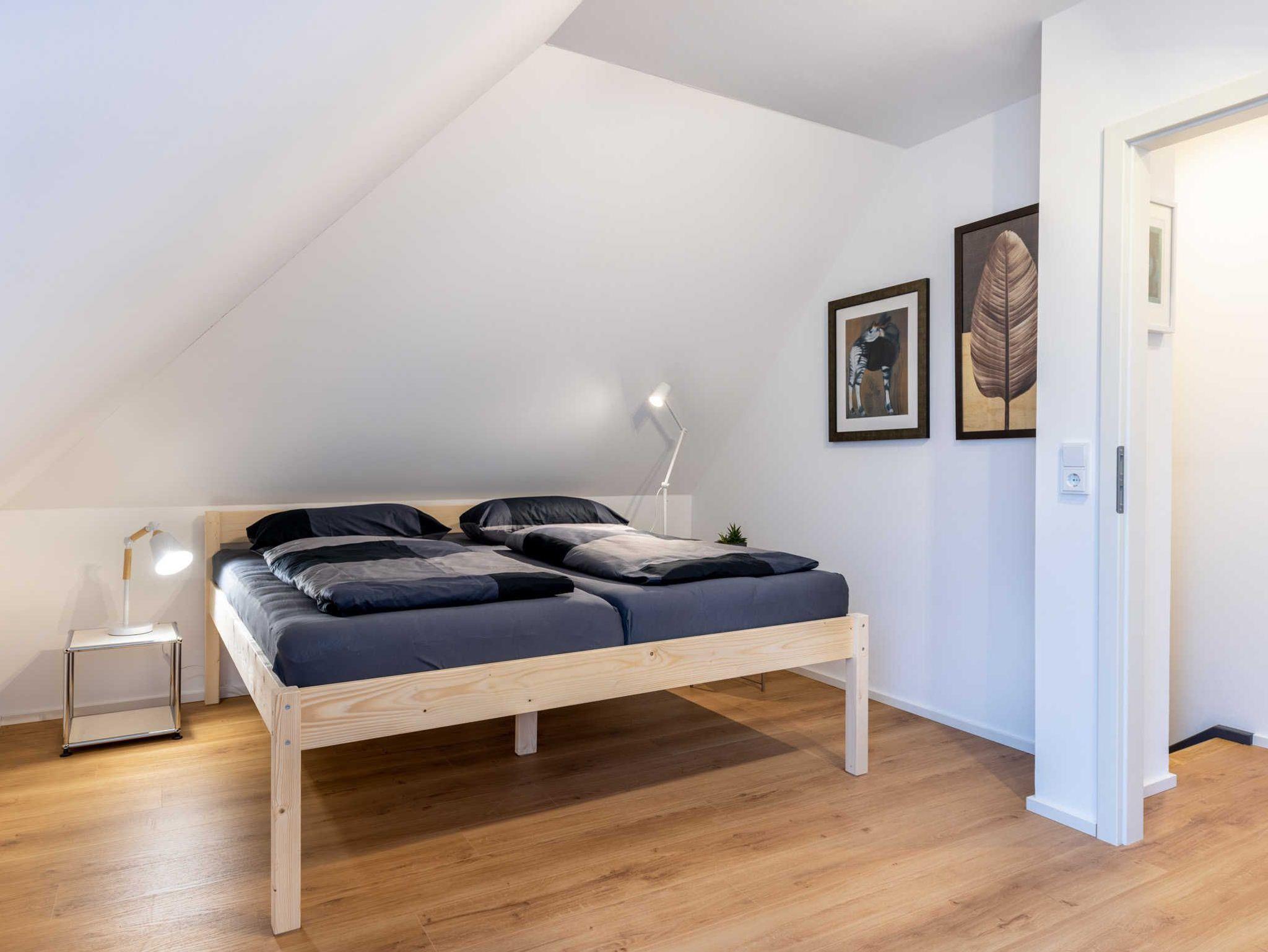 Im Obergeschoss: die obere Etage erreichen die Gäste über eine Treppe (0,75m breit). Hier befinden sich 2 Schlafzimmer. Schlafzimmer 1 mit Doppelbett (1,80 x 2m), Kleiderschrank und kleinem Arbeitsplatz mit Sessel, Schlafzimmer 2 mit 2 Einzelbetten (1m x 2m) und Kleiderschrank. Alle Betten sind mit hochwertigen Lattenrosten und Matratzen ausgestattet.