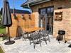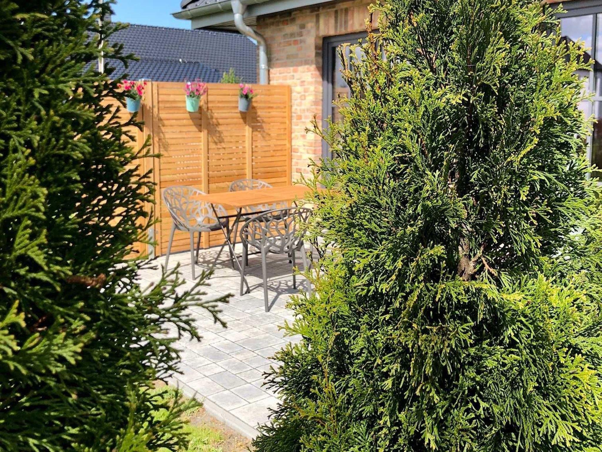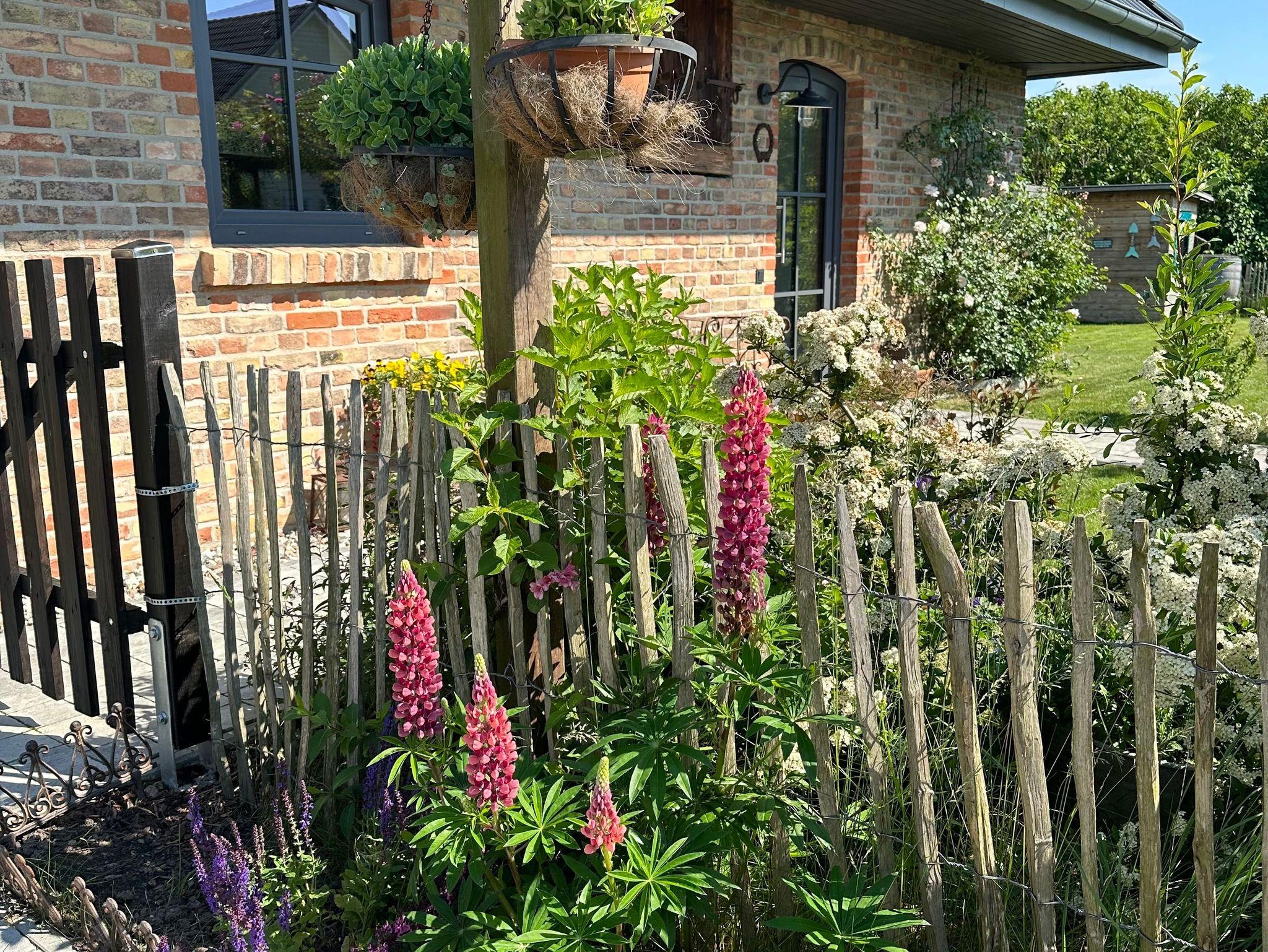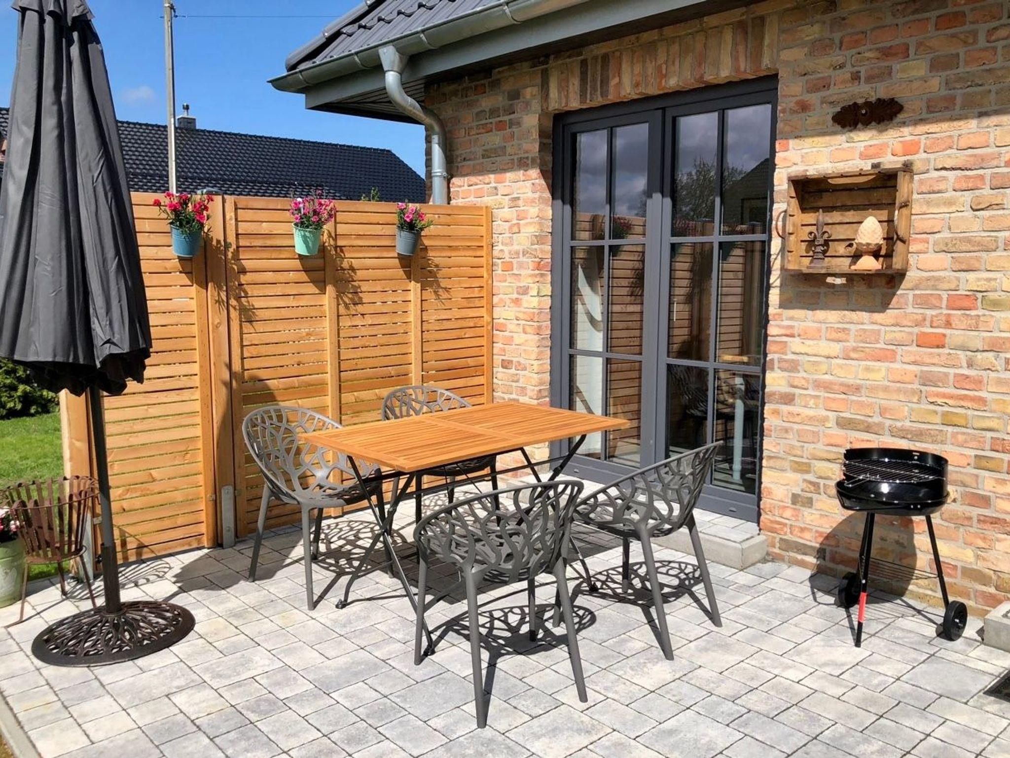 Der gemütliche Wohnbereich eröffnet einen herrlichen und freien Blick in die Natur und in den Garten. Von hier aus gelangen die Gäste direkt auf die ruhige Terrasse und ins Grüne. Hier stehen ein Esstisch, Grill und Liegestühle für die Gäste bereit. Der Gartenbereich ist mit einem 1m hohen Staketenholzzaun eingezäunt.