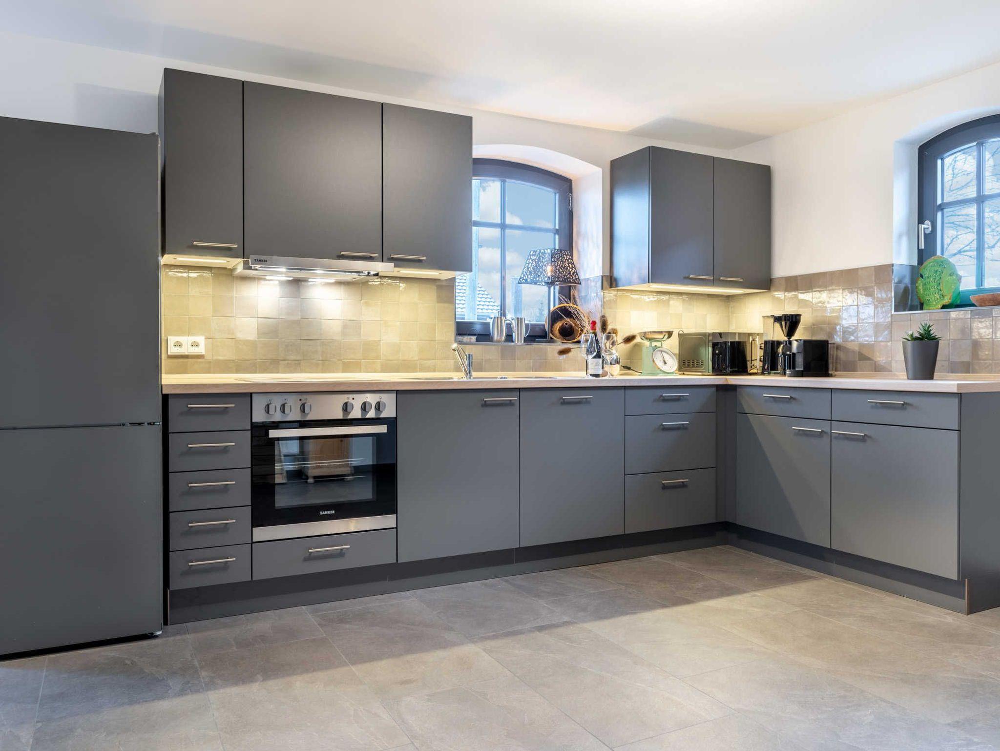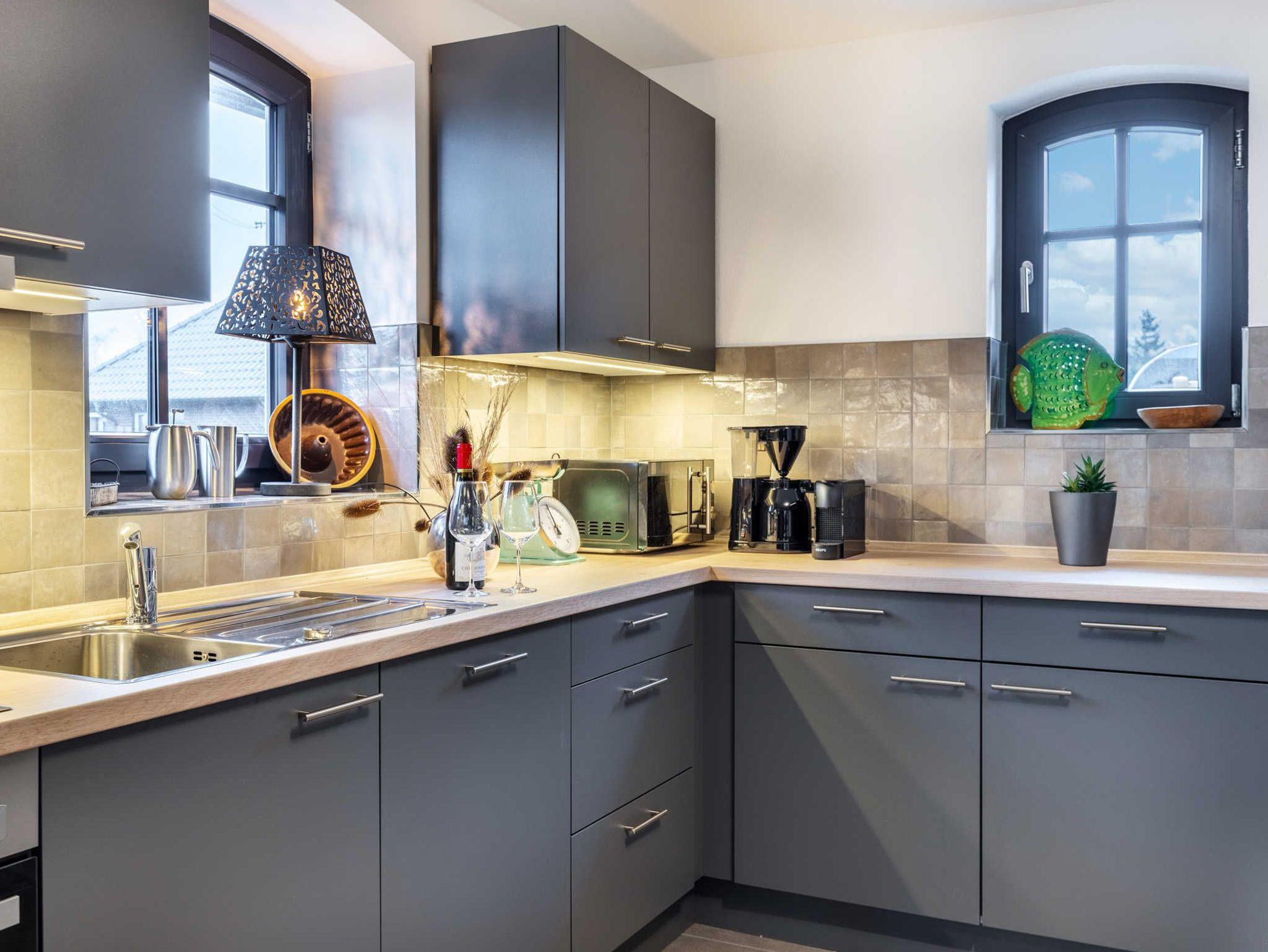 Im Erdgeschoss: Hier befindet sich die separate und komplett ausgestatte Küche mit allem, was man für das entspannte Kochen und Genießen im Ferienhaus benötigt. Zur hochwertigen Einrichtung zählen ein Esstisch, Geschirrspüler, 4-Platten-Ceran Kochfeld, Backofen, Kühl- Gefrierkombination, Kaffeemaschine, Nespressomaschine, Wasserkocher, Toaster, Rührgerät, ausreichend Geschirr und Gläser sowie zahlreiche Küchenhelfer.