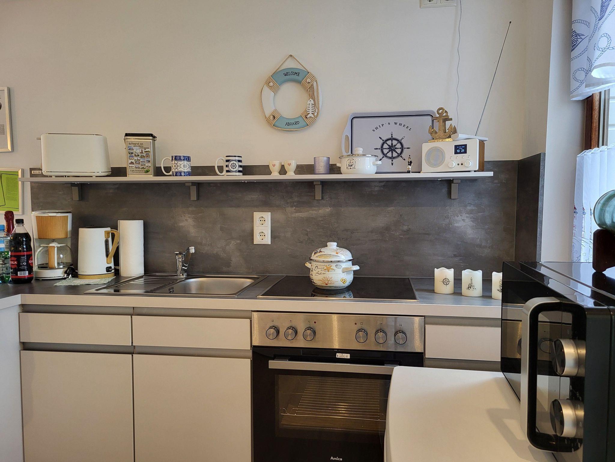 Die offene Küchenzeile und der Essplatz ist gut ausgestattet mit Cerankochfeld, Backofen, Mikrowelle, Kaffeemaschine, Toaster und Kühlschrank.