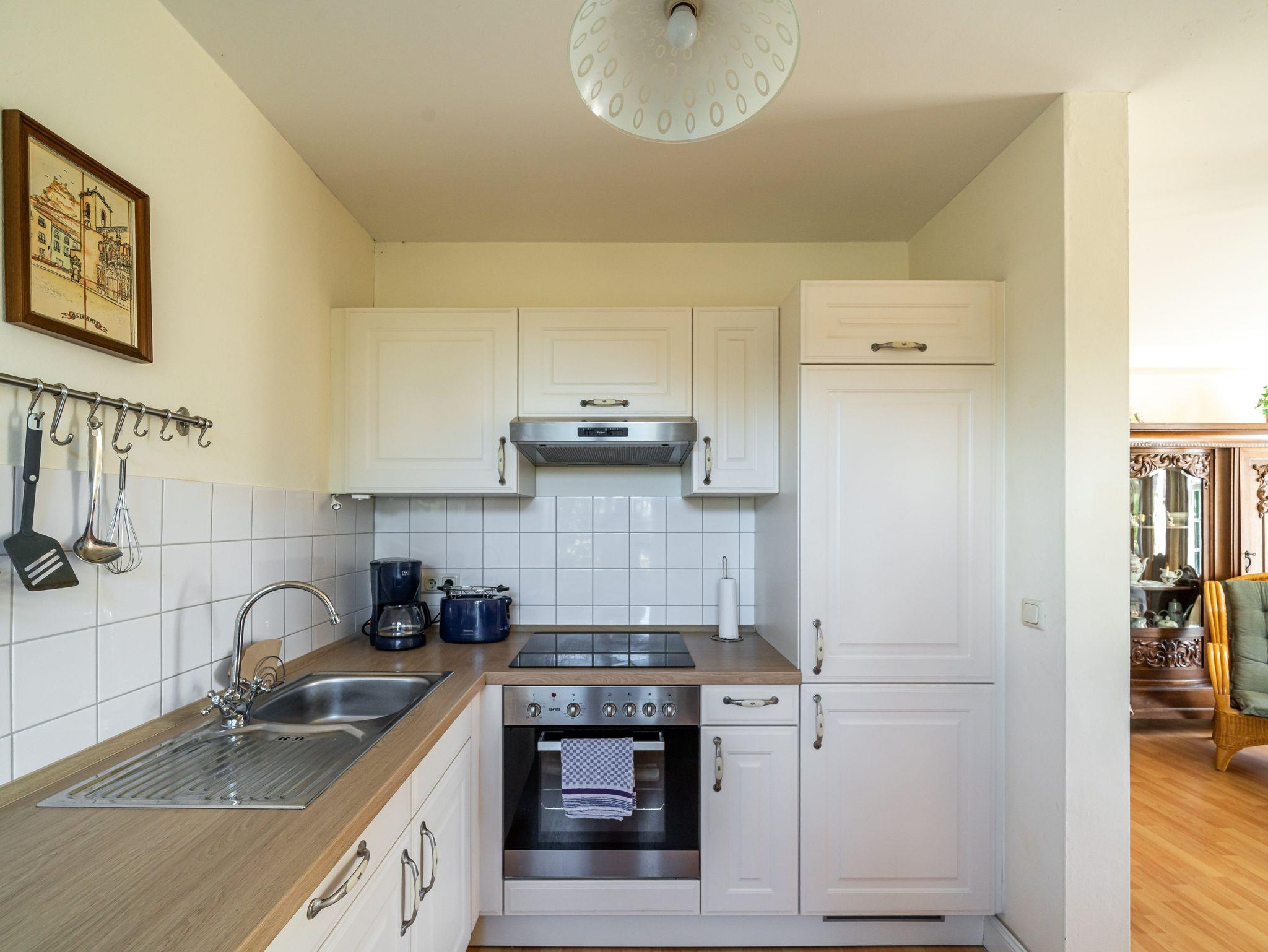 Die Küche hat eine Kühl-Gefrierkombinationen, einen Herd, einen Backofen, eine Kaffeemaschiene, einen Toaster und eine Geschirrspülmaschine.