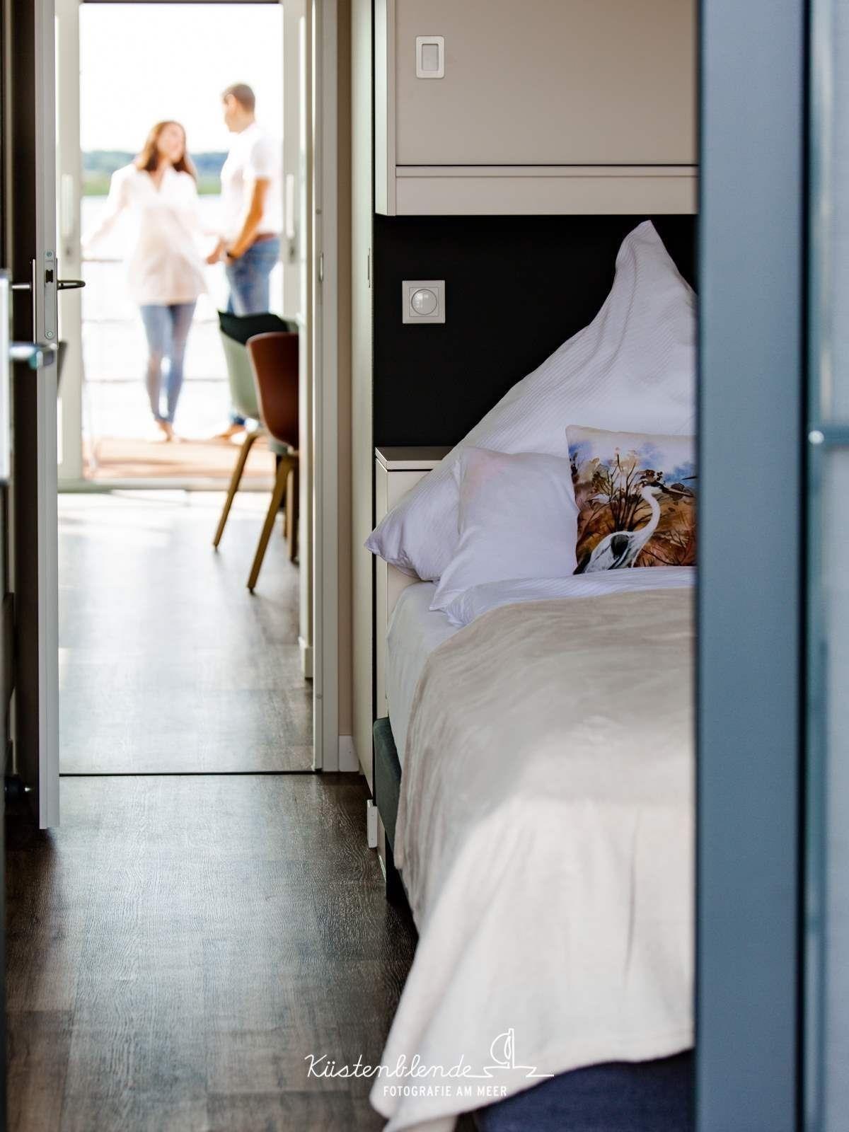 Auf 44 Quadratmetern Wohnfläche findest Du eine hochwertige vollausgestattete Wohnküche, auch dem geselligen Abendessen steht damit nichts im Wege. Alle Räume sind klimatisiert und an kalten Tagen sorgt der Kamin für gemütliche Stimmung an Bord. Ganz wichtig ist der erholsame tiefe Schlaf – deshalb sind im KranichNest die Boxspringbetten in beiden Schlafzimmern zusätzlich mit hochwertigen Topper-Auflagen ausgestattet und verschiedene Kopfkissen hast Du zur Auswahl. Das geflieste Badezimmer mit großzügiger Dusche 80x106cm (inkl. Kosmetikspiegel, Haarföhn) und die separate Toilette bieten eine angenehme Intimsphäre. Das leistungsstarke WLAN ist selbstverständlich, Bücher Spiele und auch Harfenmusik, so Du das möchtest, runden das Zuhause-Gefühl ab.