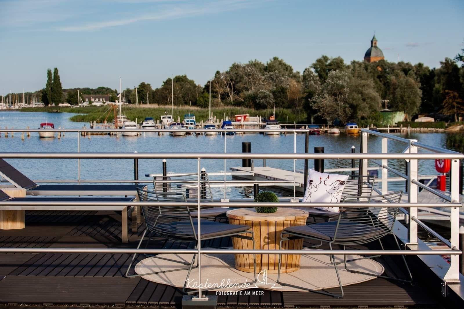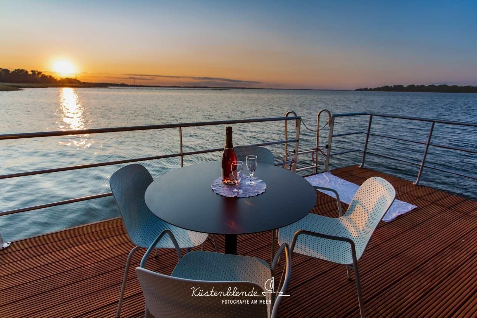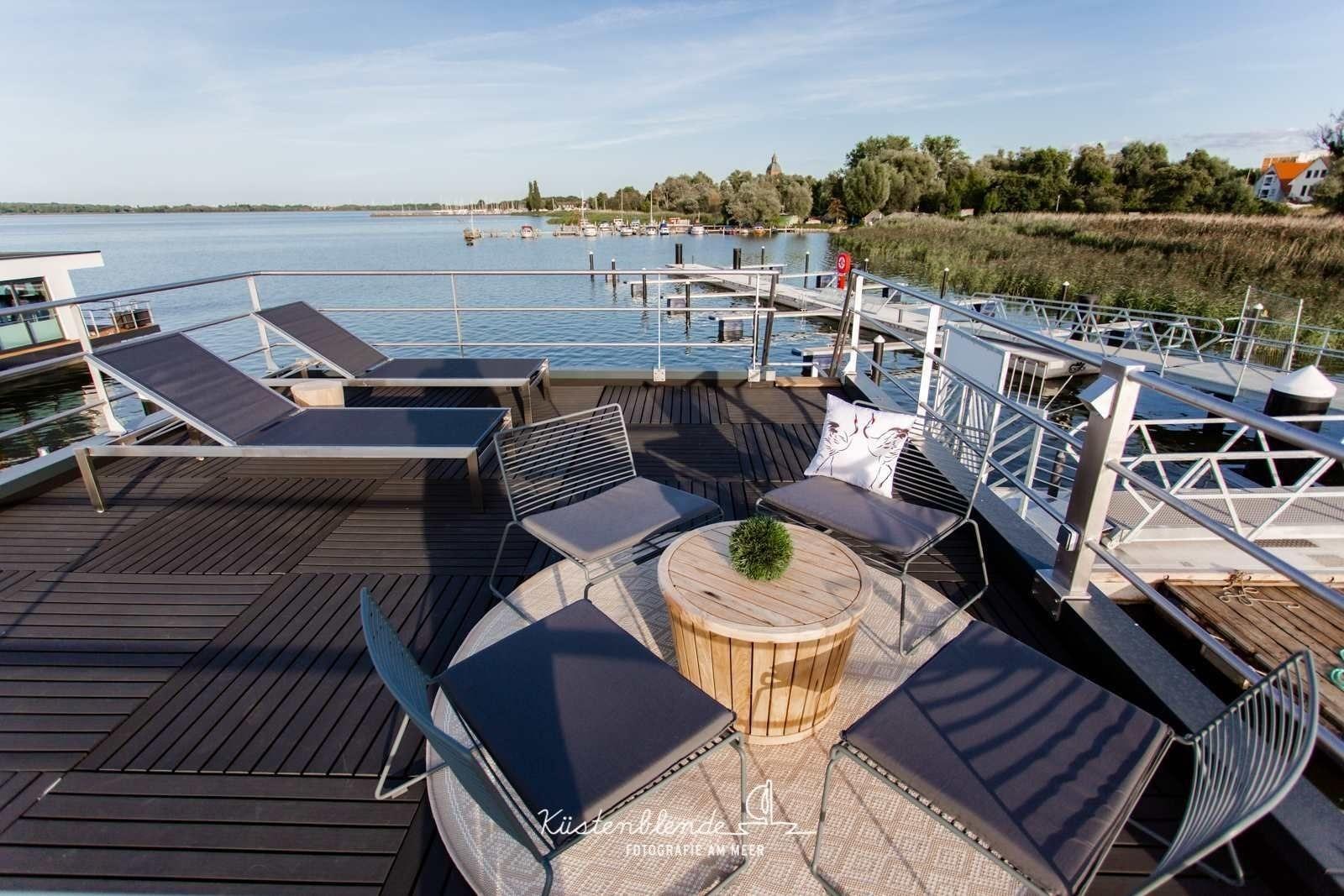 Aus dem Wohn- und Essbereich gelangen Sie auf die Terrasse. Hier können Sie Ihre Mahlzeiten genießen. Auf der Dachterrasse kann man sehr gut entspannen und die Seele baumeln lassen. Erleben Sie das Gefühl von Freiheit auf dem Wasser!