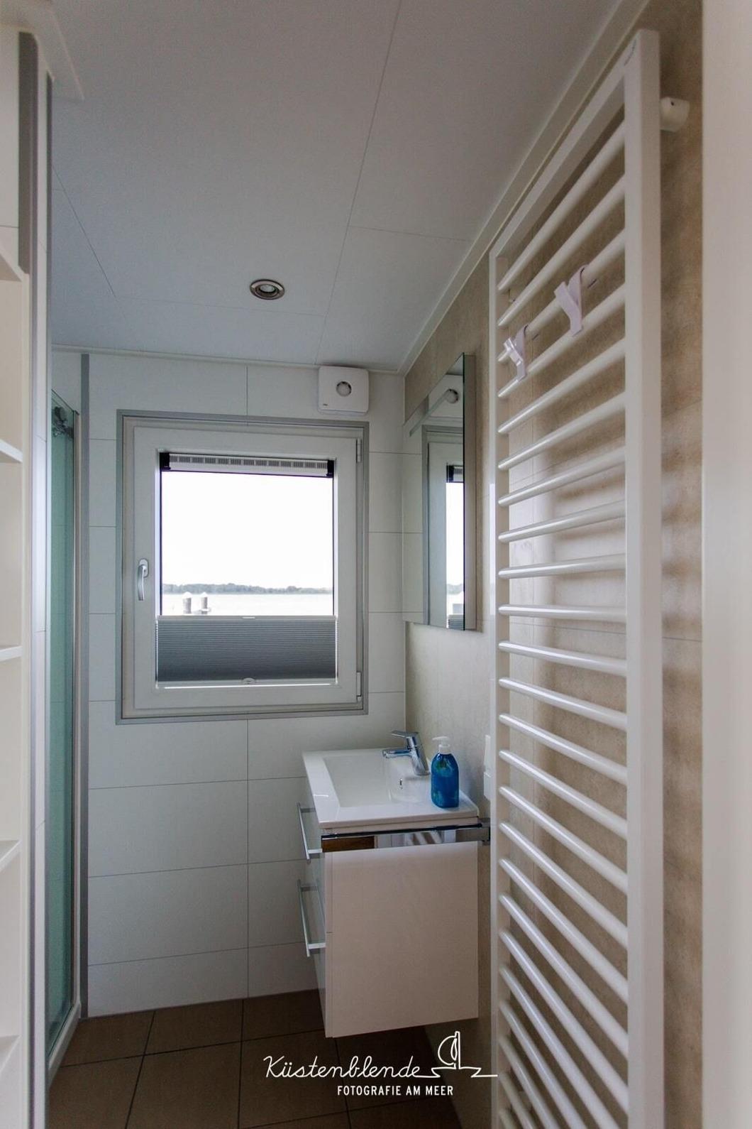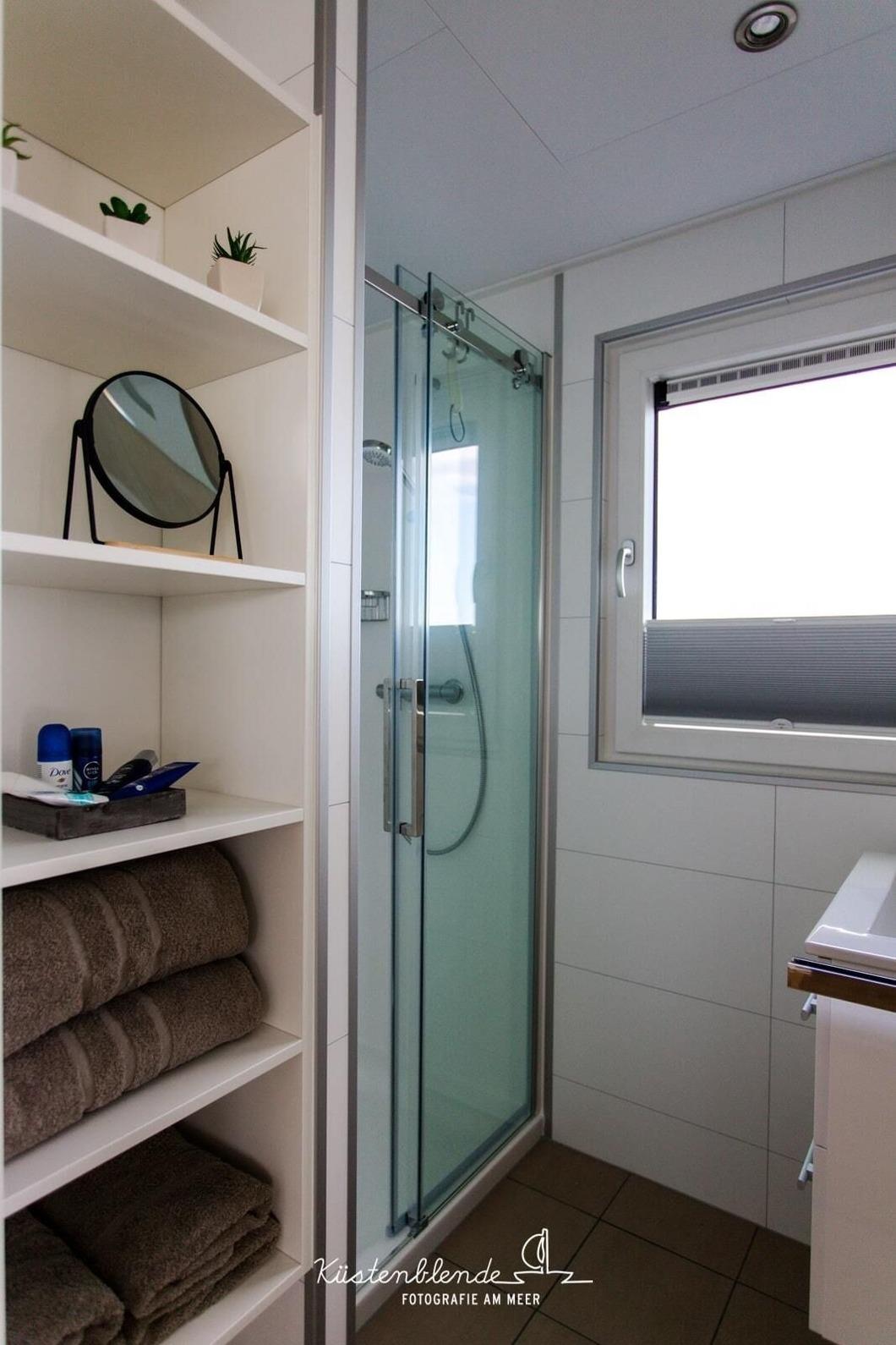 - Bad mit Dusche, Waschtisch, Spiegel und Fön