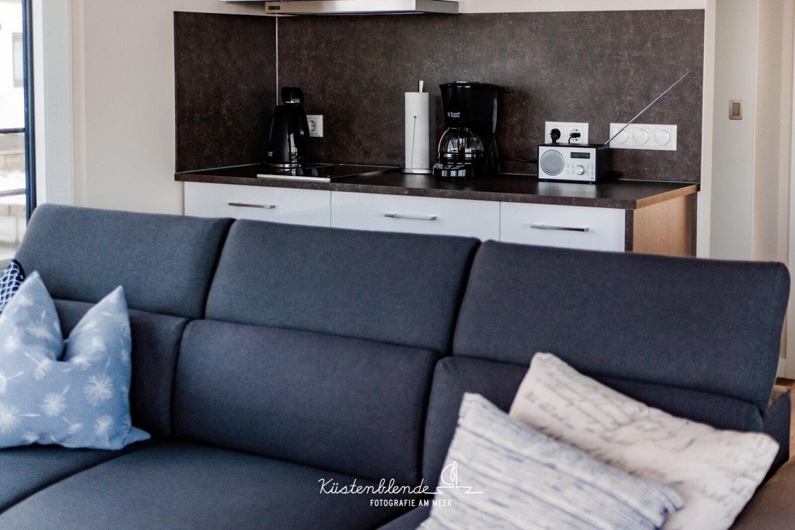 - großzügiger Wohn- und Essraum mit Schlafsofa und voll ausgestatteter Wohnküche (incl. Kühlschrank mit Frostfach, Ceranfeld, Geschirrspüler, Mikrowelle, Kaffeemaschine, Toaster, Wasserkocher, Geschirr, Besteck etc.
