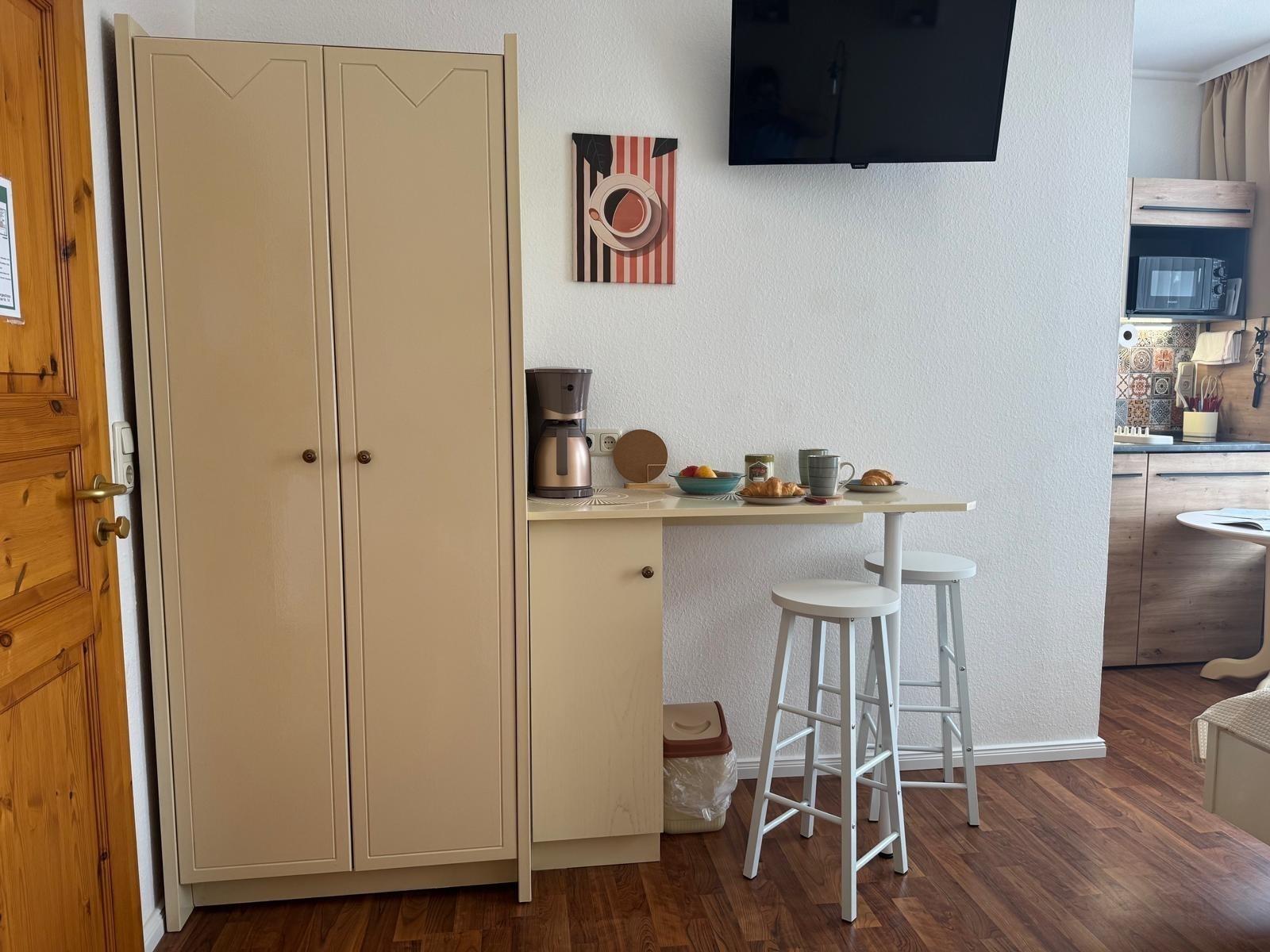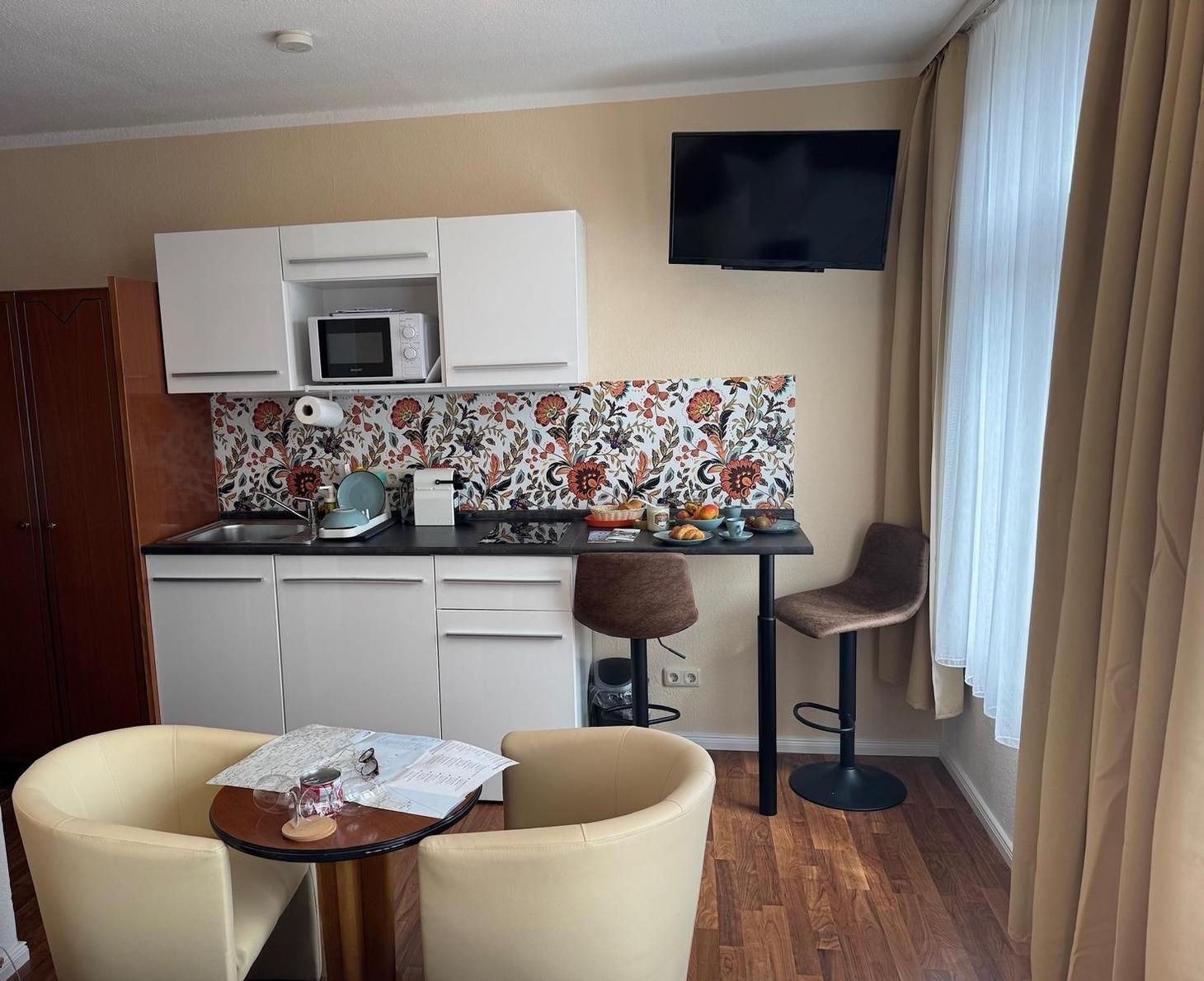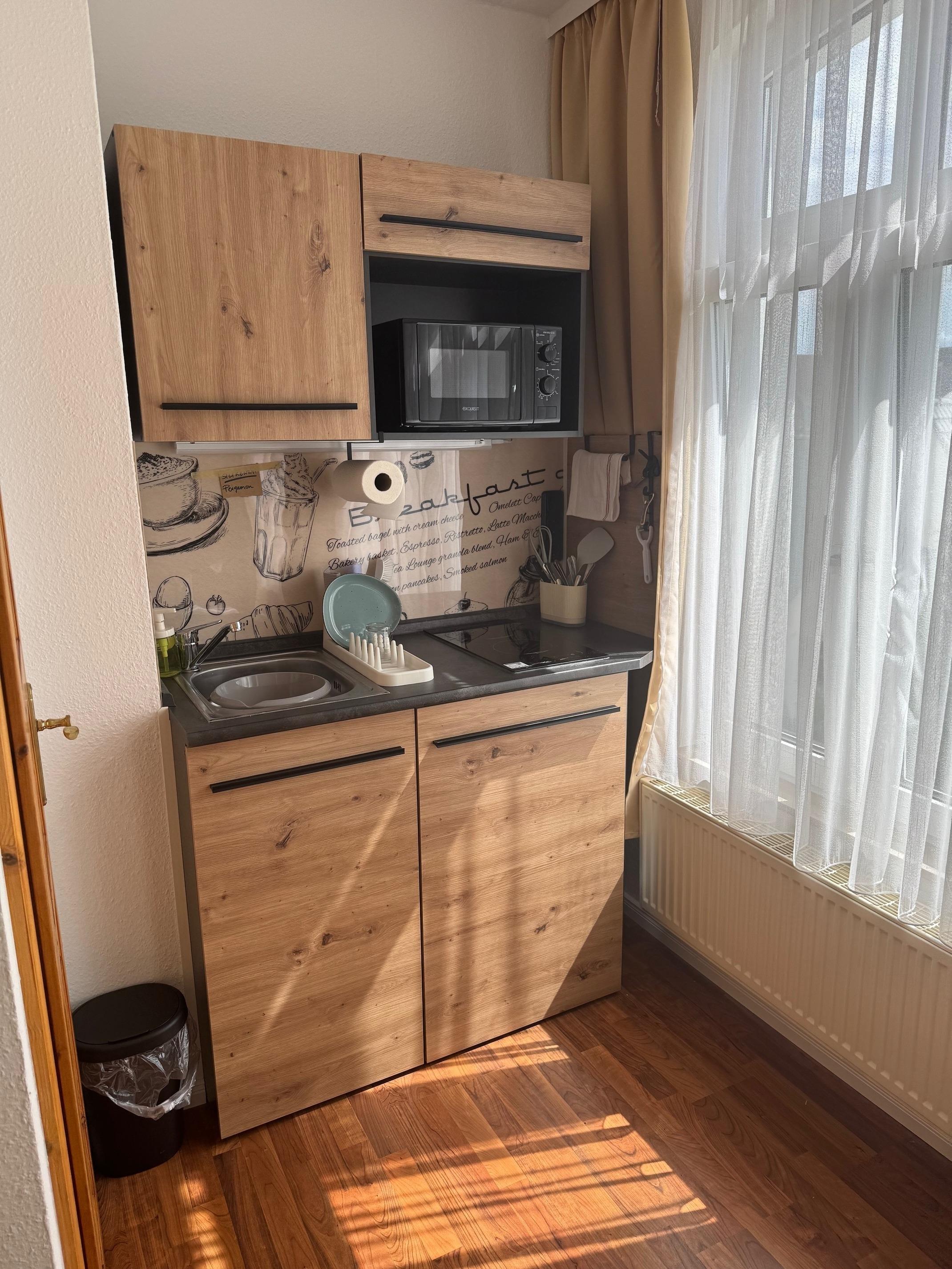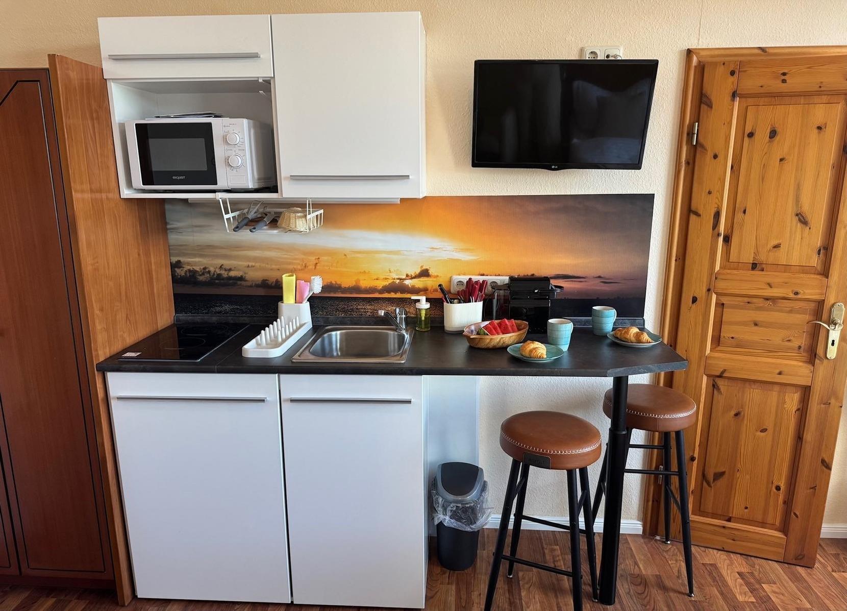 Zur Verfügung steht Ihnen eine integrierte, voll ausgestattete Küchenzeile, die folgendes umfasst: Spülbecken, Zwei- Platten-Induktionsfeld, Kühlschrank mit Gefrierfach, Wasserkocher, Mikrowelle mit Grillfunktion, eine Kaffeemaschine sowie das Grundzubehör an Küchenutensilien.