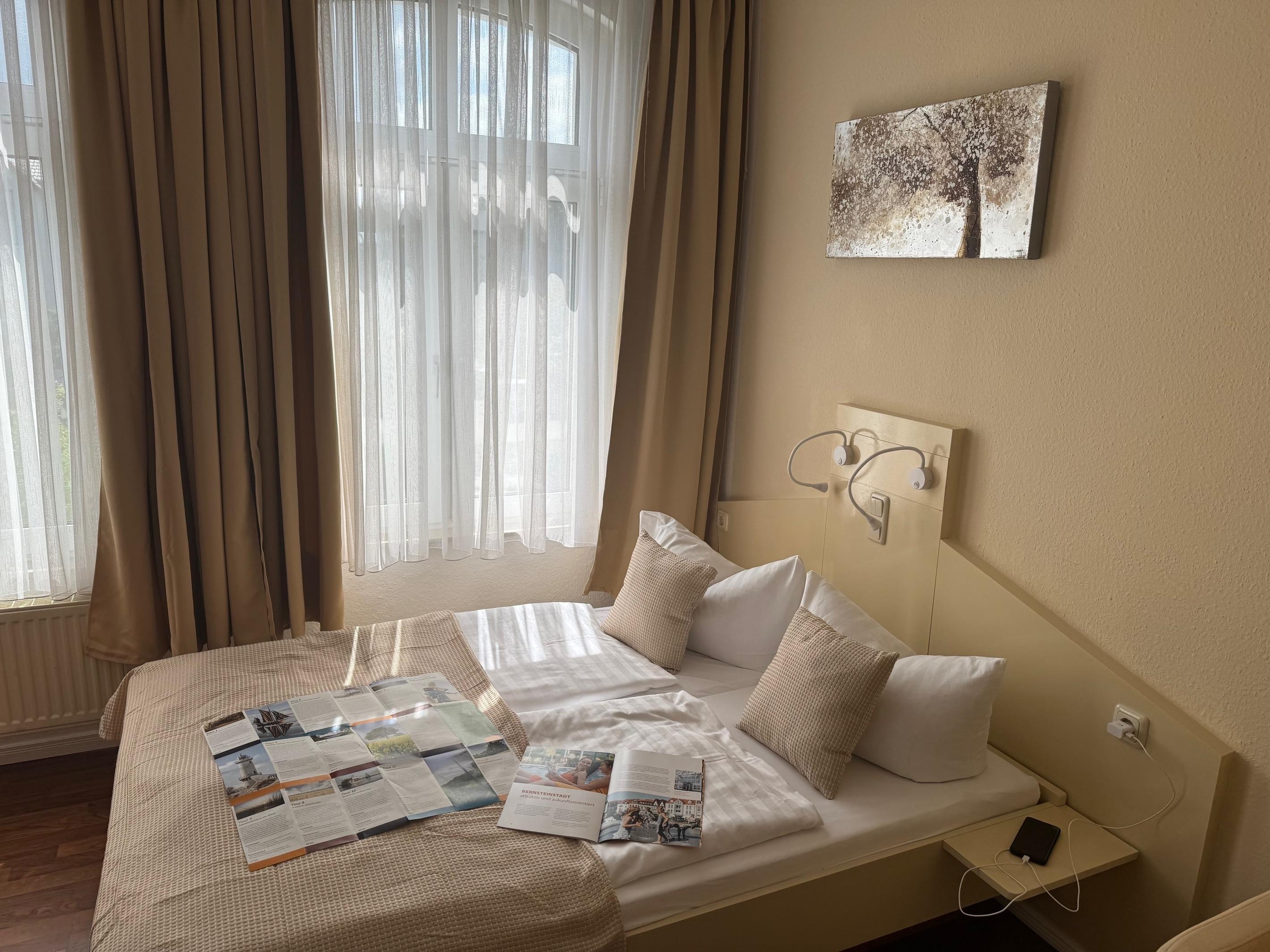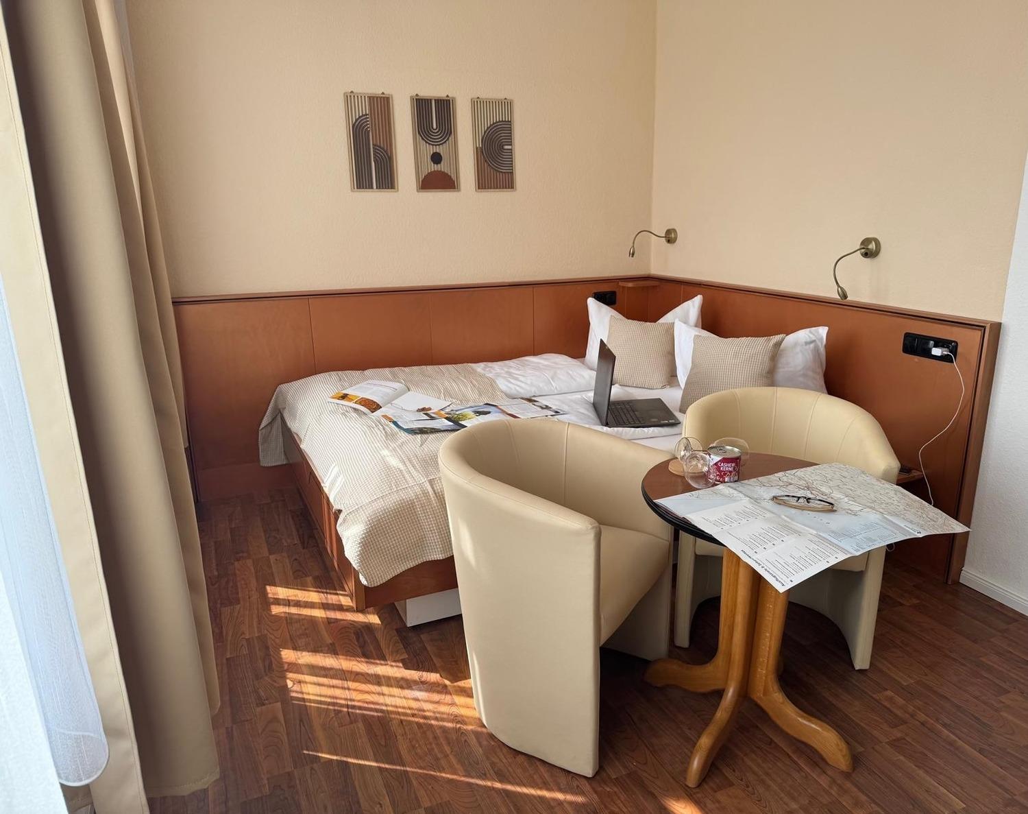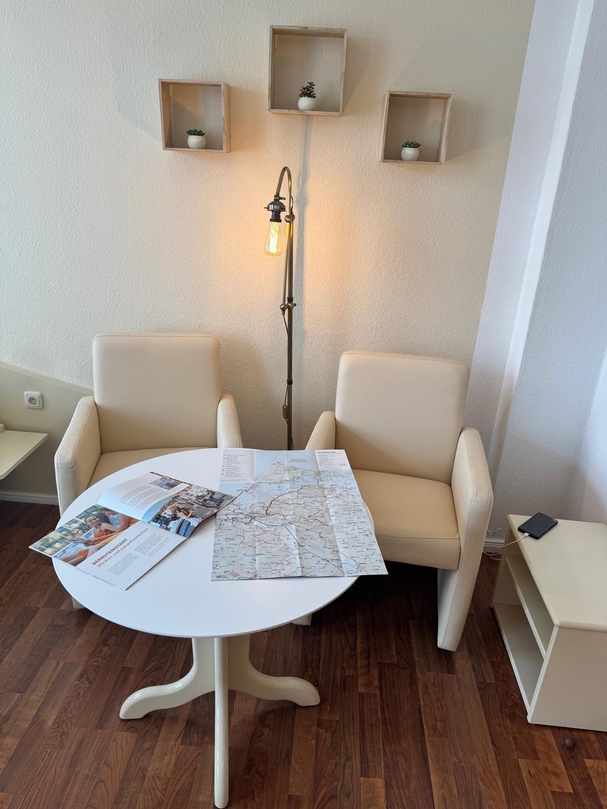 Ein Doppelbett, ein Flachbild-TV und eine gemütliche Sitzecke mit Sesseln komplettieren die Ausstattung.