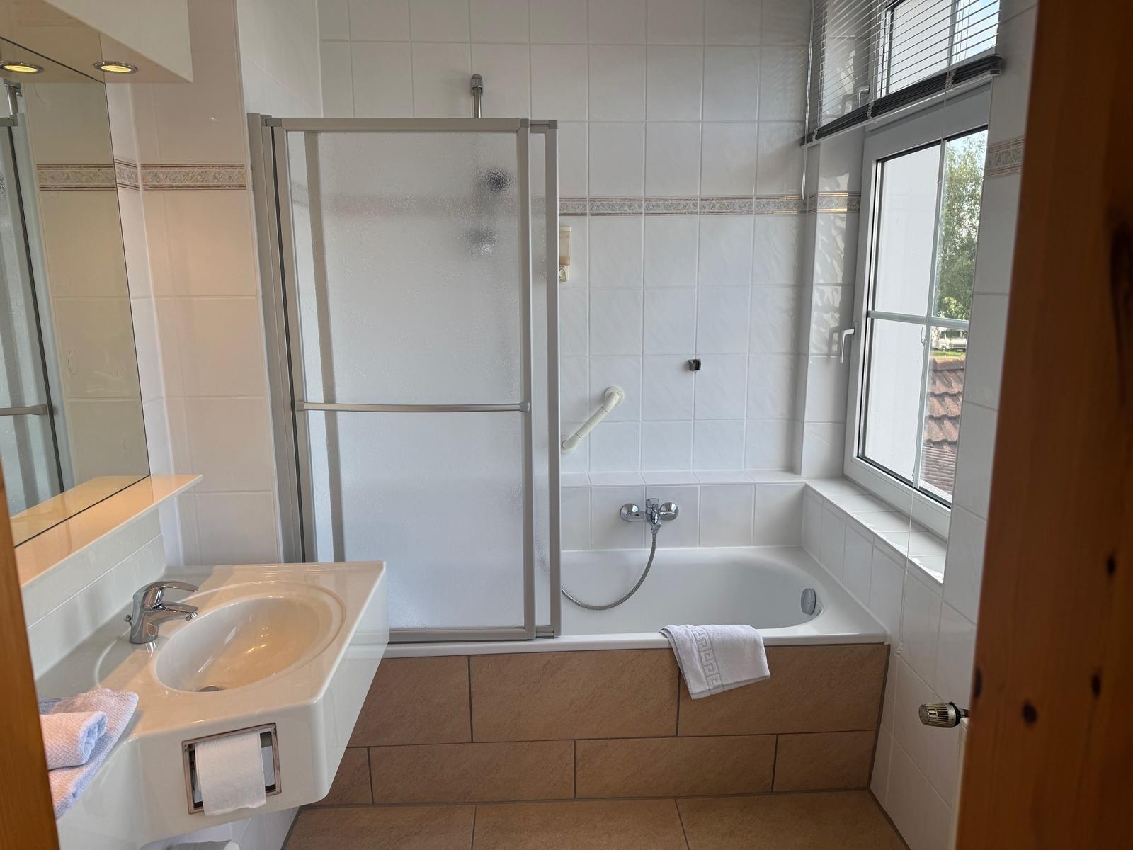 Das ansprechend eingerichtete Badezimmer verfügt über eine Badewanne oder Dusche samt Föhn.