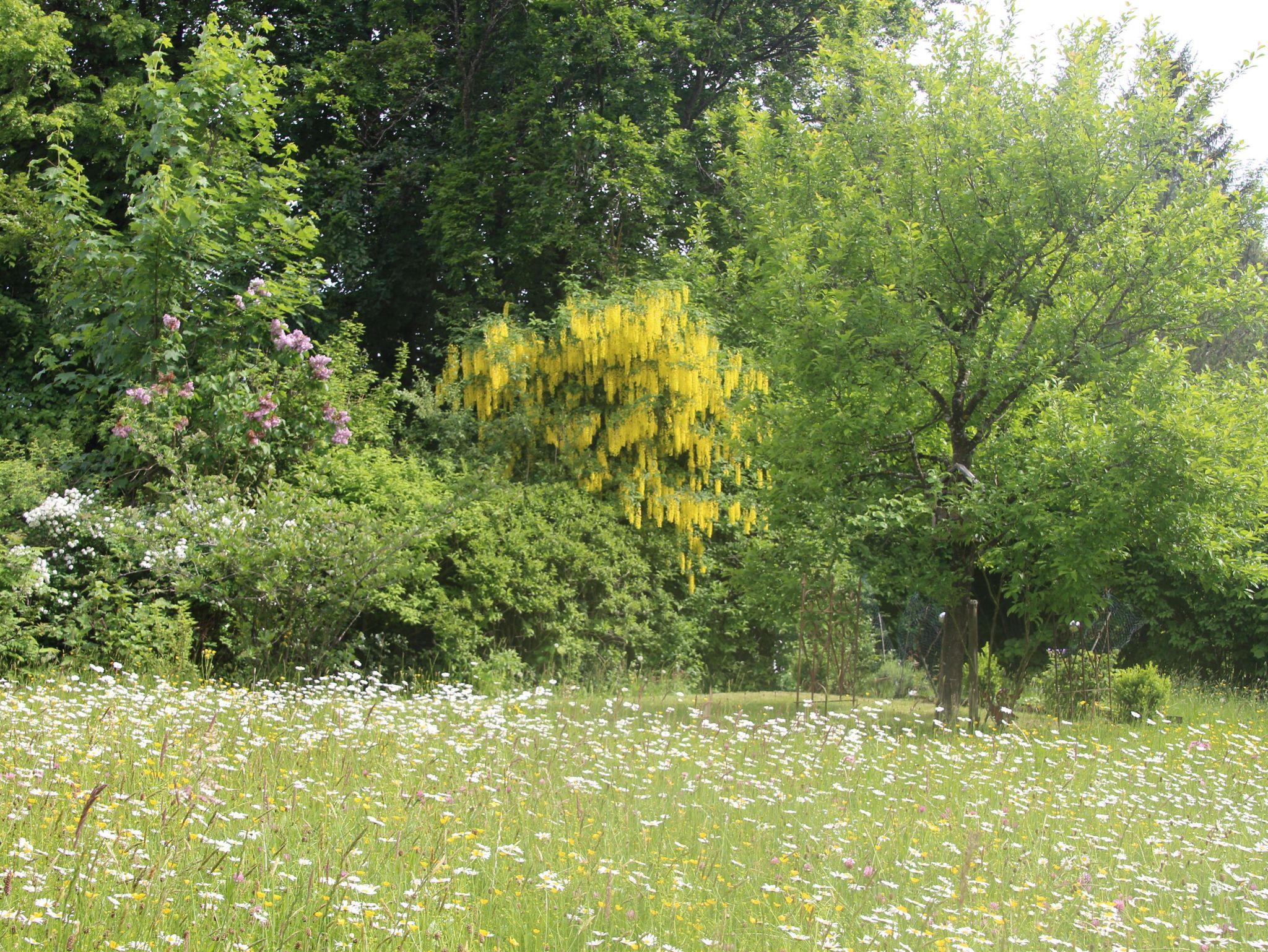 Im großer Garten stehen Sonnenliegen und ein Sitzplatz bereit, mit freiem Blick in die Natur.
