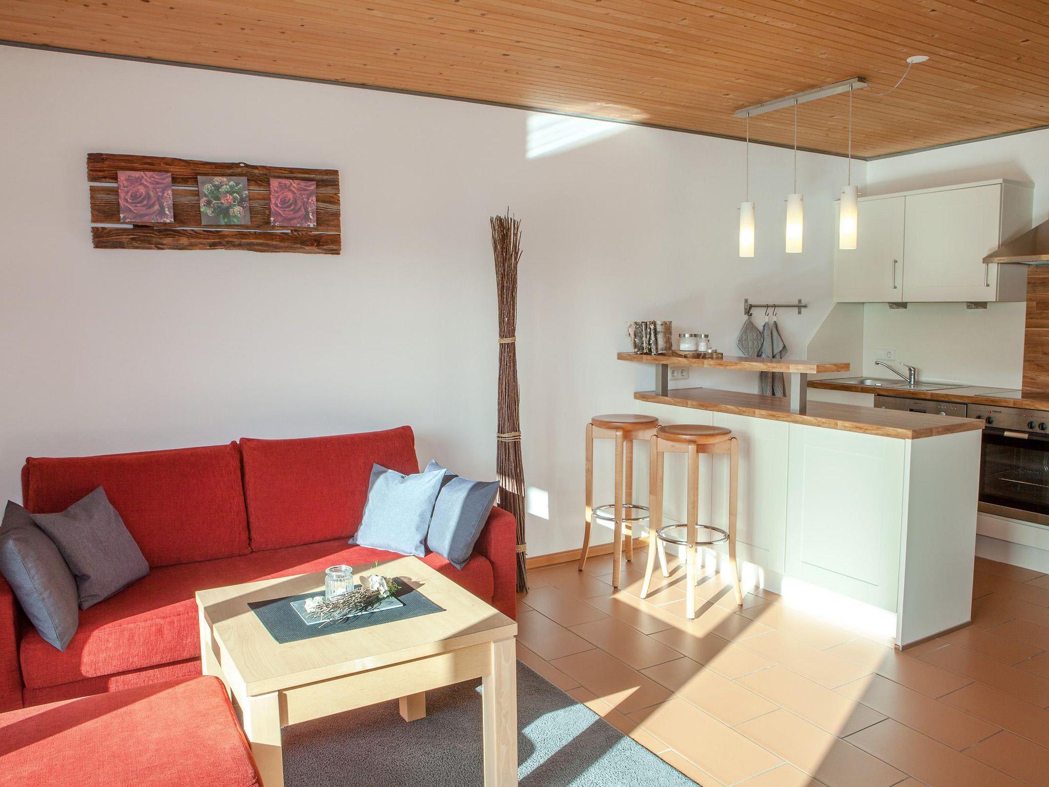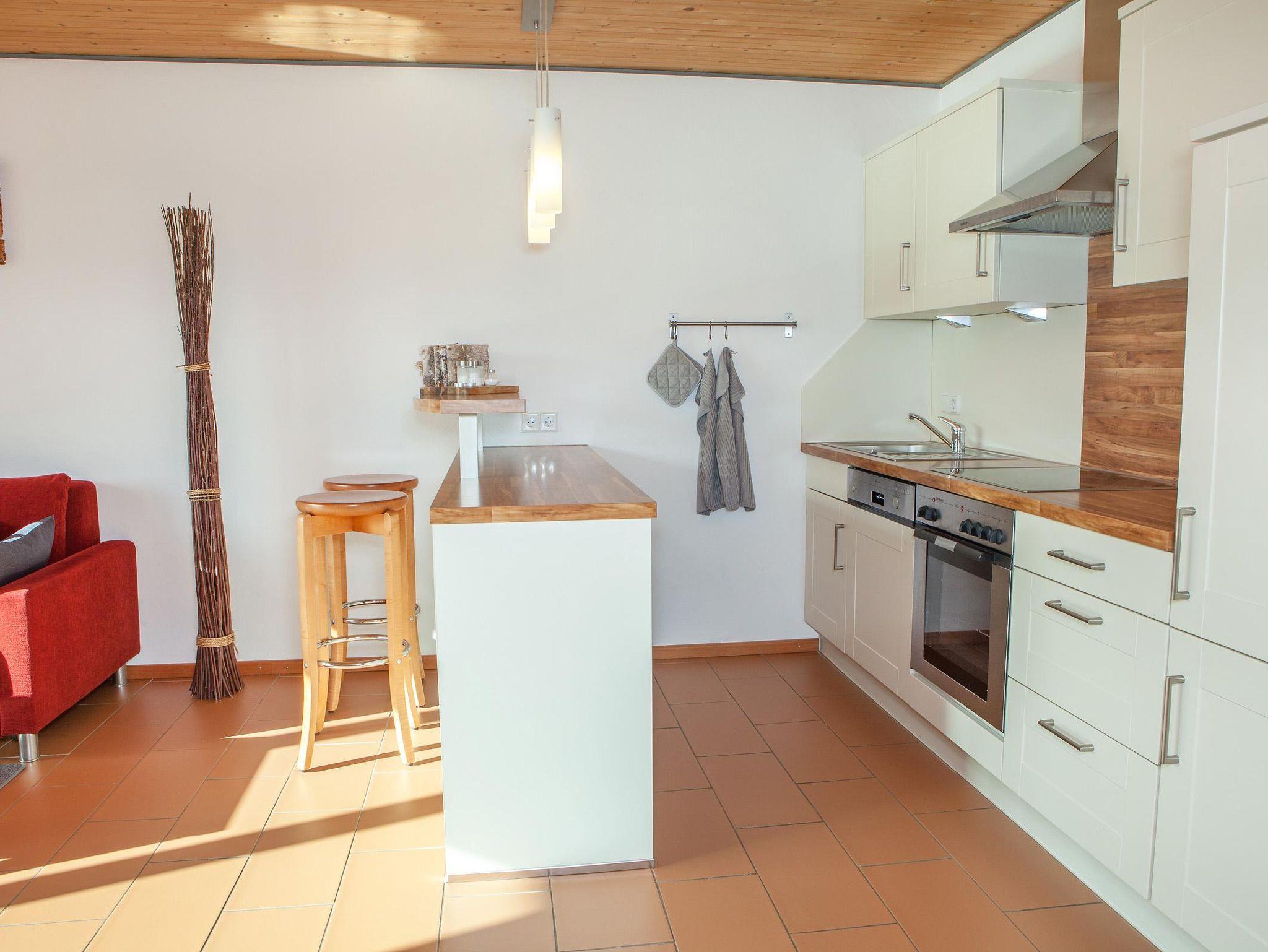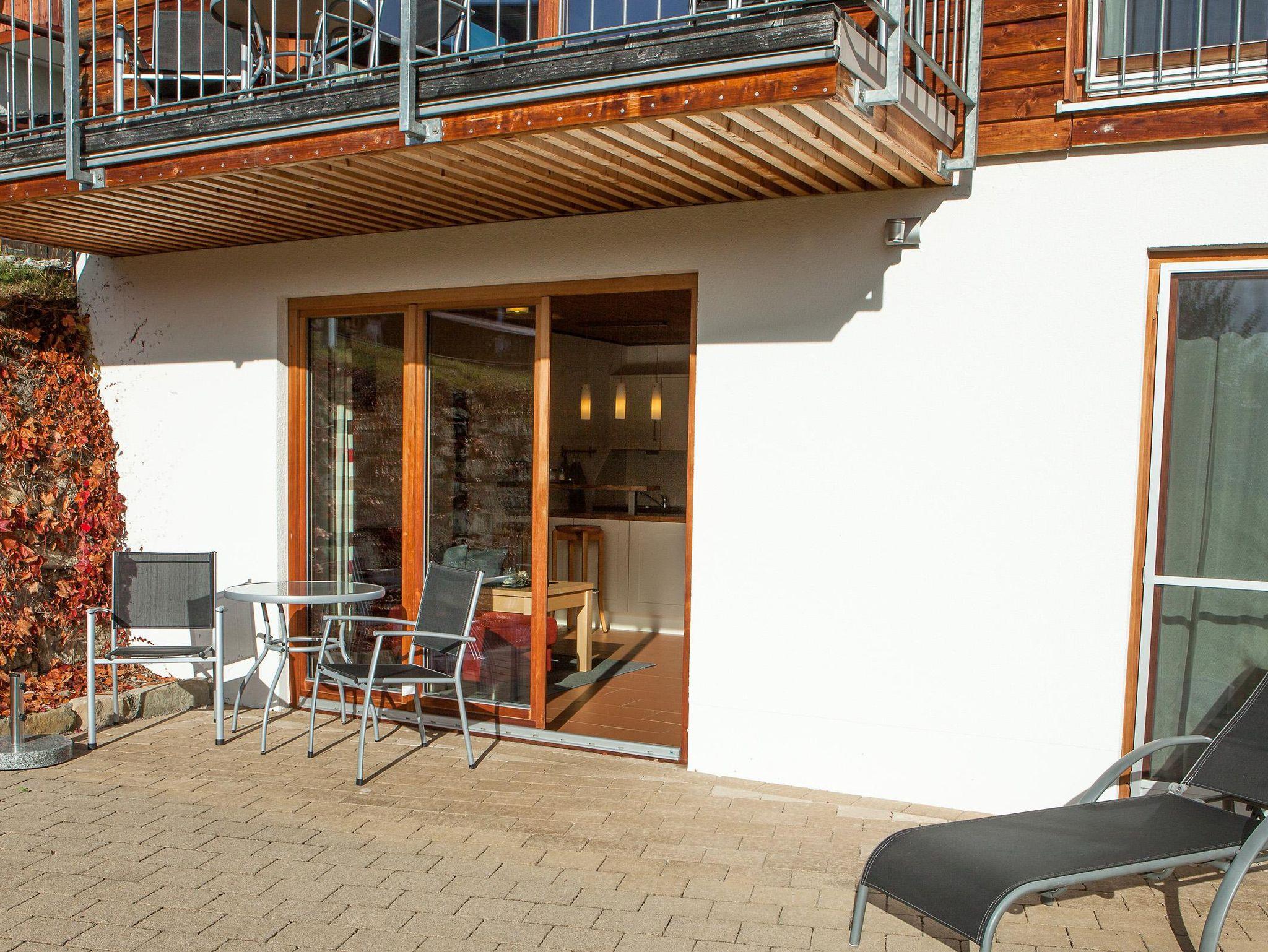Moderne Ferienwohnung mit Terrasse und Bergblick. Voll ausgestattete Küche mit Spülmaschine, Backofen und Mikrowelle, Wohnbereich mit TV, Telefon und W-Lan, Schlafzimmer mit Doppelbett und Safe, Badezimmer mit Dusche, Badewanne, Fön und Kosmetikspiegel.
