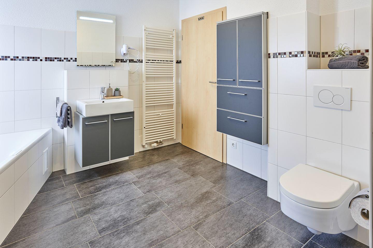 Das Bad verfügt über ein WC, eine ebenerdige Dusche sowie eine Badewanne und eine integrierte Wärmekabine.