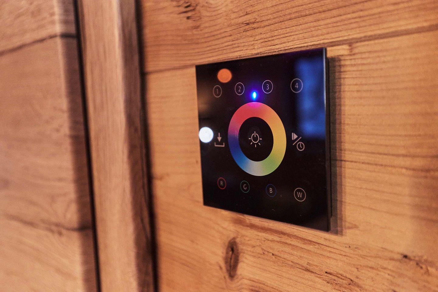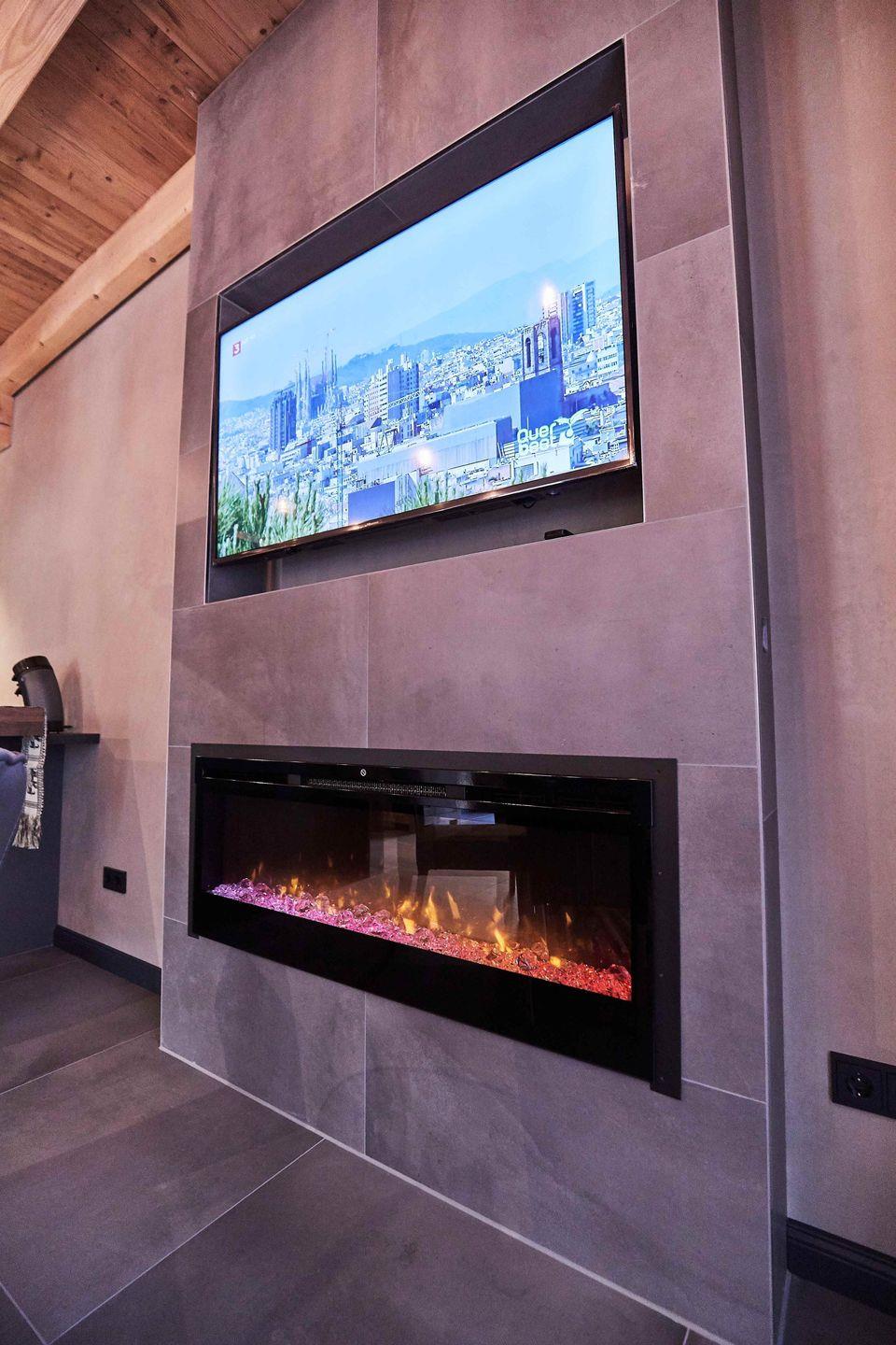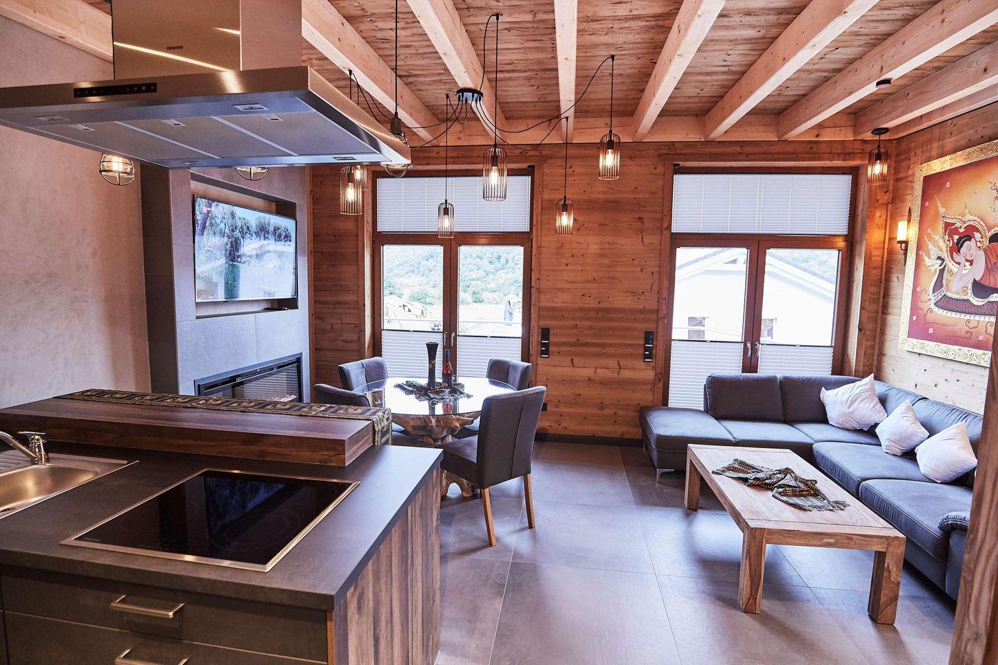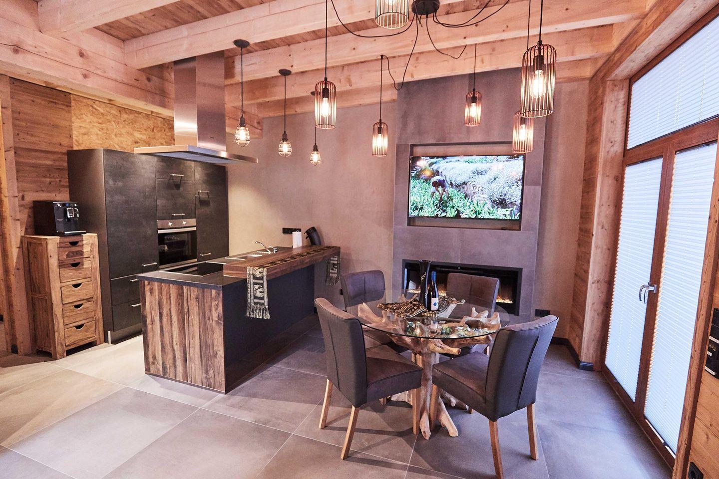 Die moderne, offene Küche ist mit einem Kaffeevollautomaten, Wasserkocher, Spülmaschine, Kühlschrank mit Gefrierfach sowie einem Backofen und einer Mikrowelle ausgestattet. Das angrenzende Wohn-/Esszimmer verfügt über einen E-Kamin, einen 65-Zoll-Flachbildfernseher und eine HiFi-Anlage.