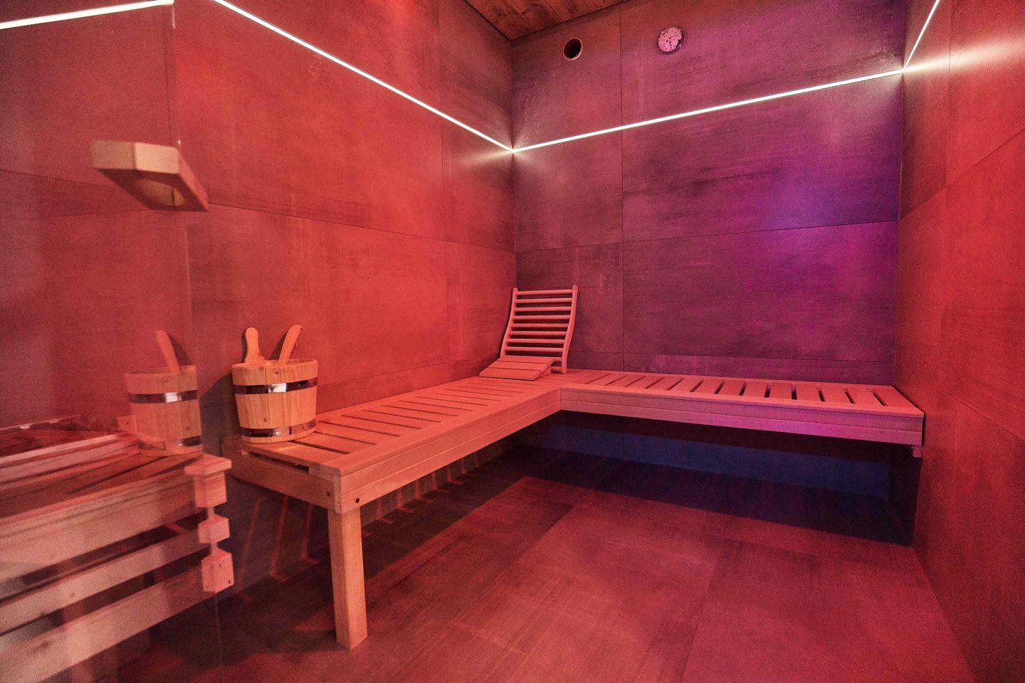 Dieses geräumige Schlafzimmer bietet ein komfortables Boxspringbett (180 x 200 cm), einen Whirlpool, eine ebenerdige XL-Dusche, eine Sauna, ein separates WC, ein großes Waschbecken und einen Fön.