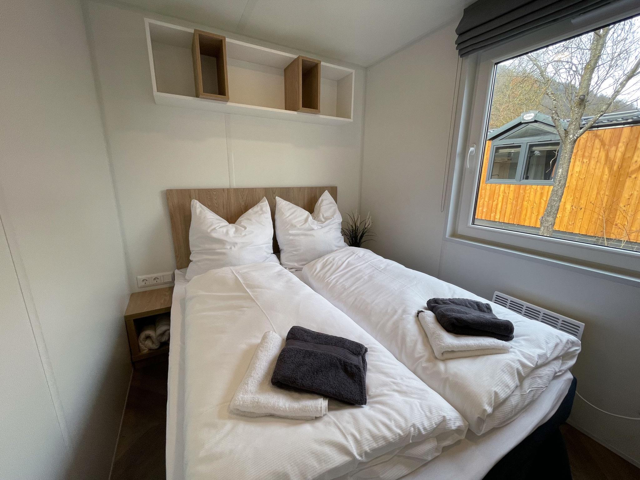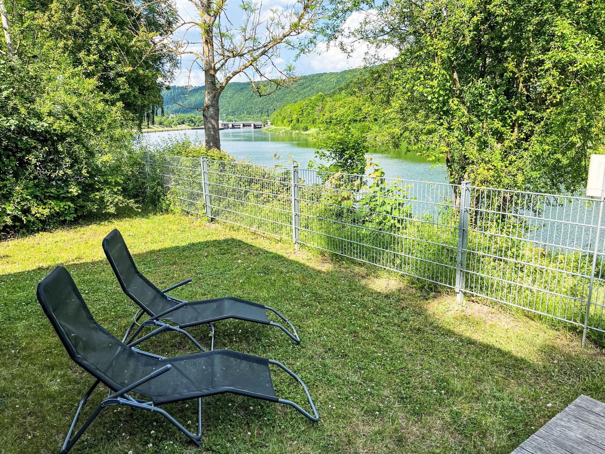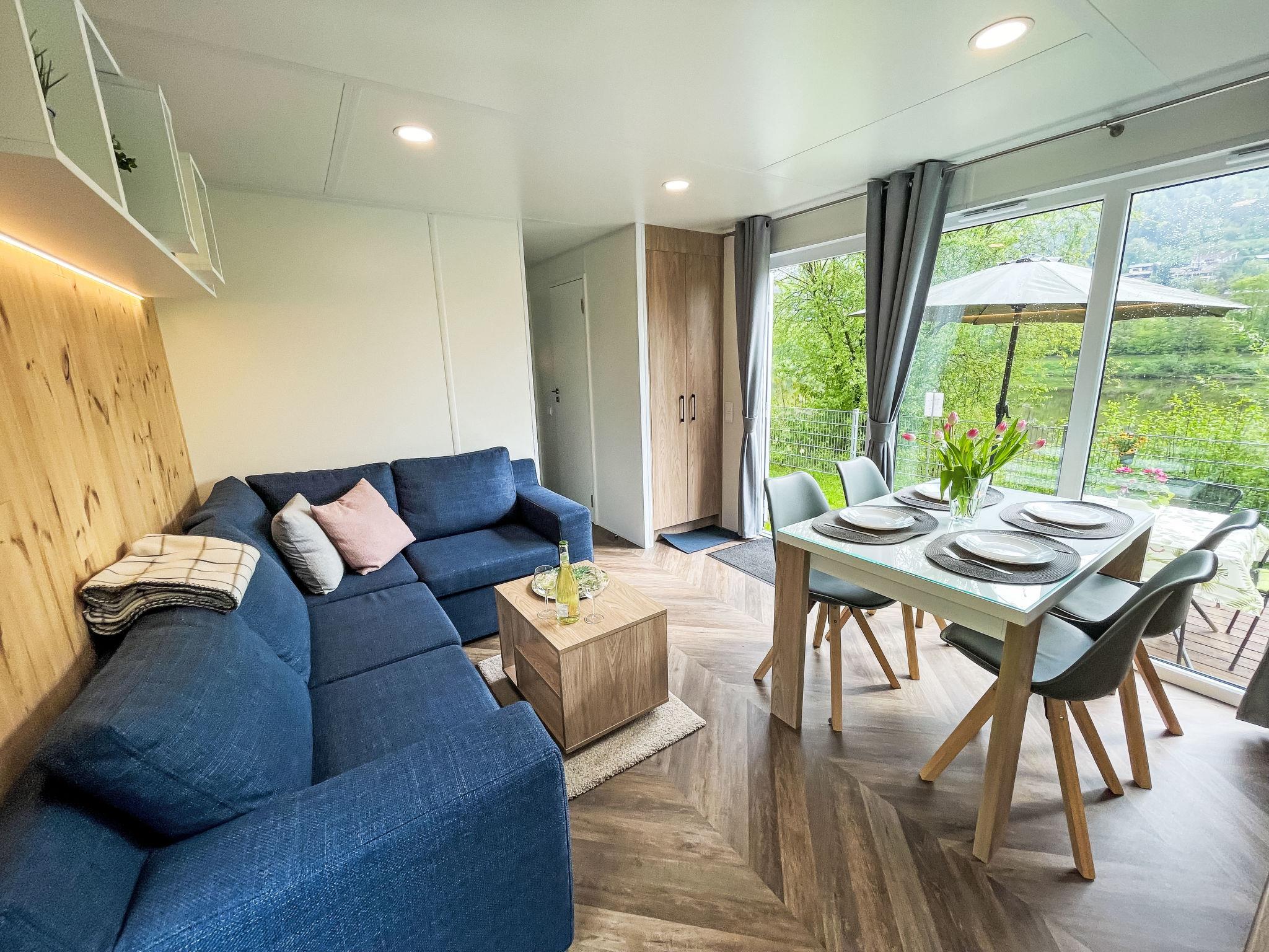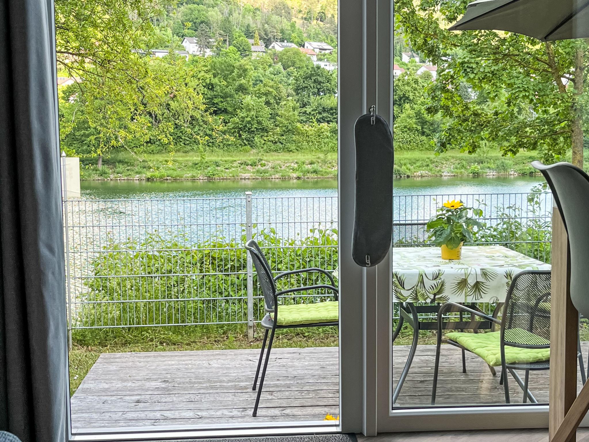 "Tiny Haus Altmühlblick", 3-room mobile home 32 m2, on the ground floor. Modern and cosy furnishings: living/sleeping room with 1 sofabed (120 cm, length 170 cm), dining table and satellite TV (flat screen). Exit to the terrace. 1 room with 1 french bed (140 cm, length 200 cm). 1 room with 2 beds (80 cm, length 200 cm). Open kitchen (4 ceramic glass hob hotplates, kettle, freezer, electric coffee machine). Shower/WC. Electric heating. Small terrace. Terrace furniture. Beautiful view of the river. Parking (1 car) at 50 m. Please note: suitable for families. Non-smoking house. Smoke alarm, fire extinguisher. Bed layout is flexible. There are more sleeping options available than the maximum number of people allowed which may, however, not be exceeded.