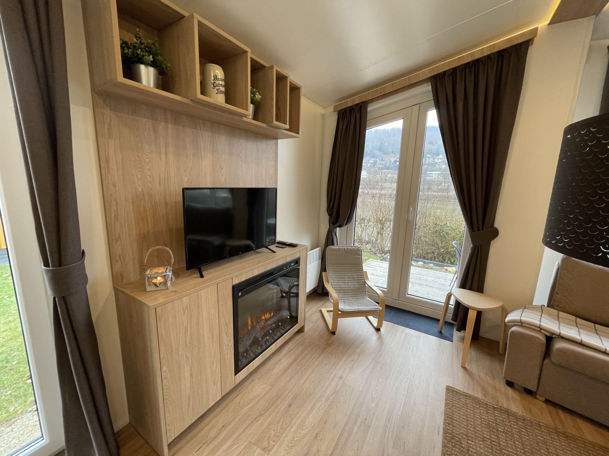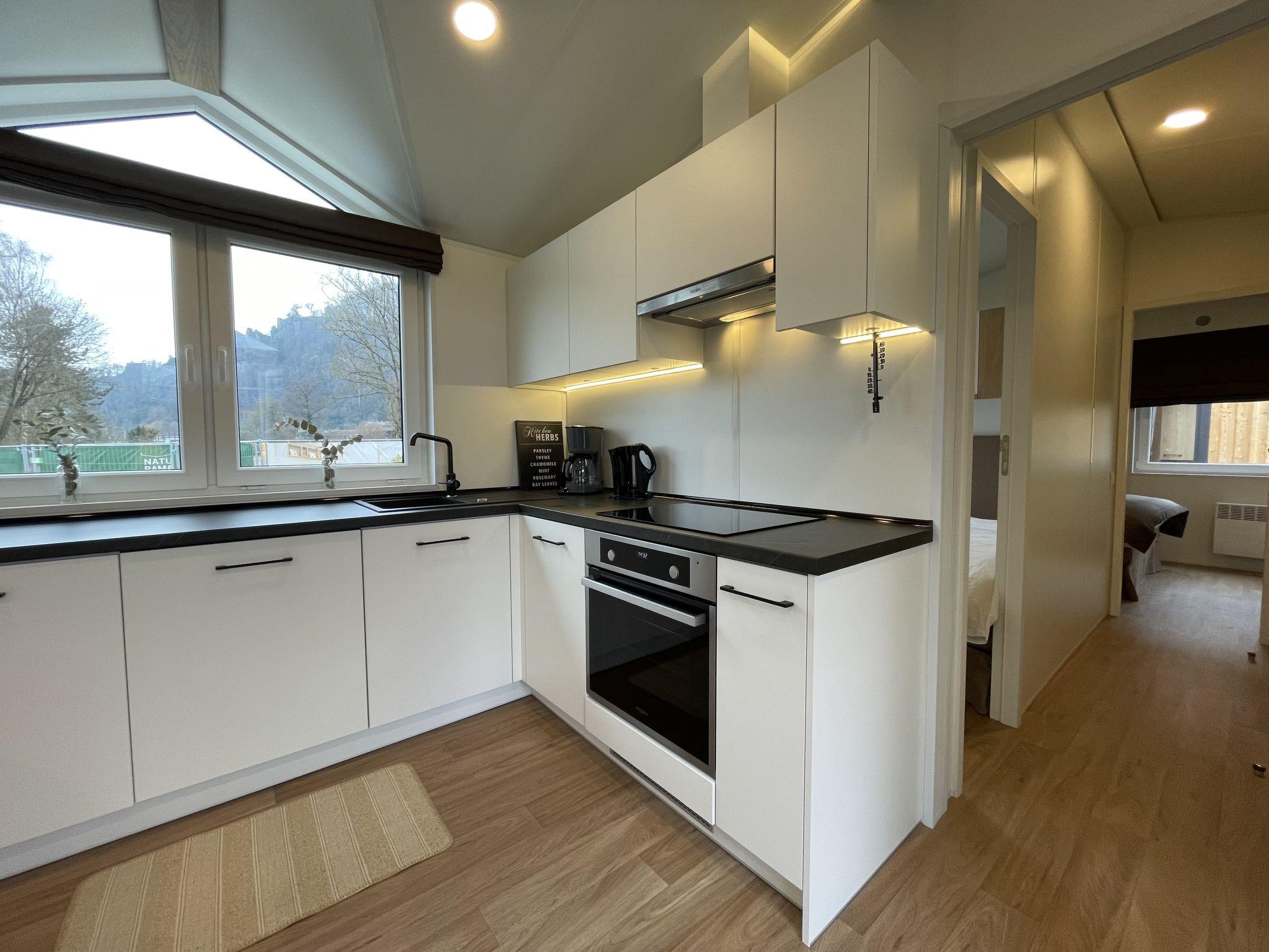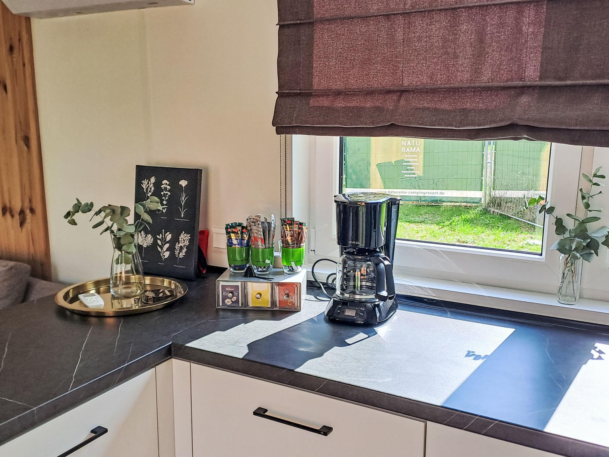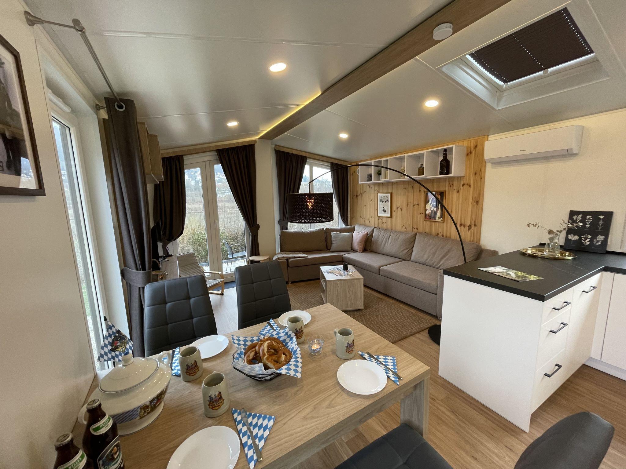 "Tiny Haus Prinz Ludwig", 3-room mobile home 48 m2. Object suitable for 2 adults + 4 children. Comfortable furnishings: living/sleeping room with 1 double sofabed (160 cm, length 200 cm), Scandinavian wood stove (only for decoration), satellite TV and air conditioning. Exit to the terrace. 1 room with 1 french bed (160 cm, length 200 cm). 1 room with 2 beds (80 cm, length 200 cm). Open kitchen (oven, dishwasher, 4 ceramic glass hob hotplates, toaster, kettle, freezer, electric coffee machine). Shower, sep. WC. Small terrace. Terrace furniture. View of the river. Facilities: washing machine, hair dryer. Parking at the house. Please note: non-smokers only.